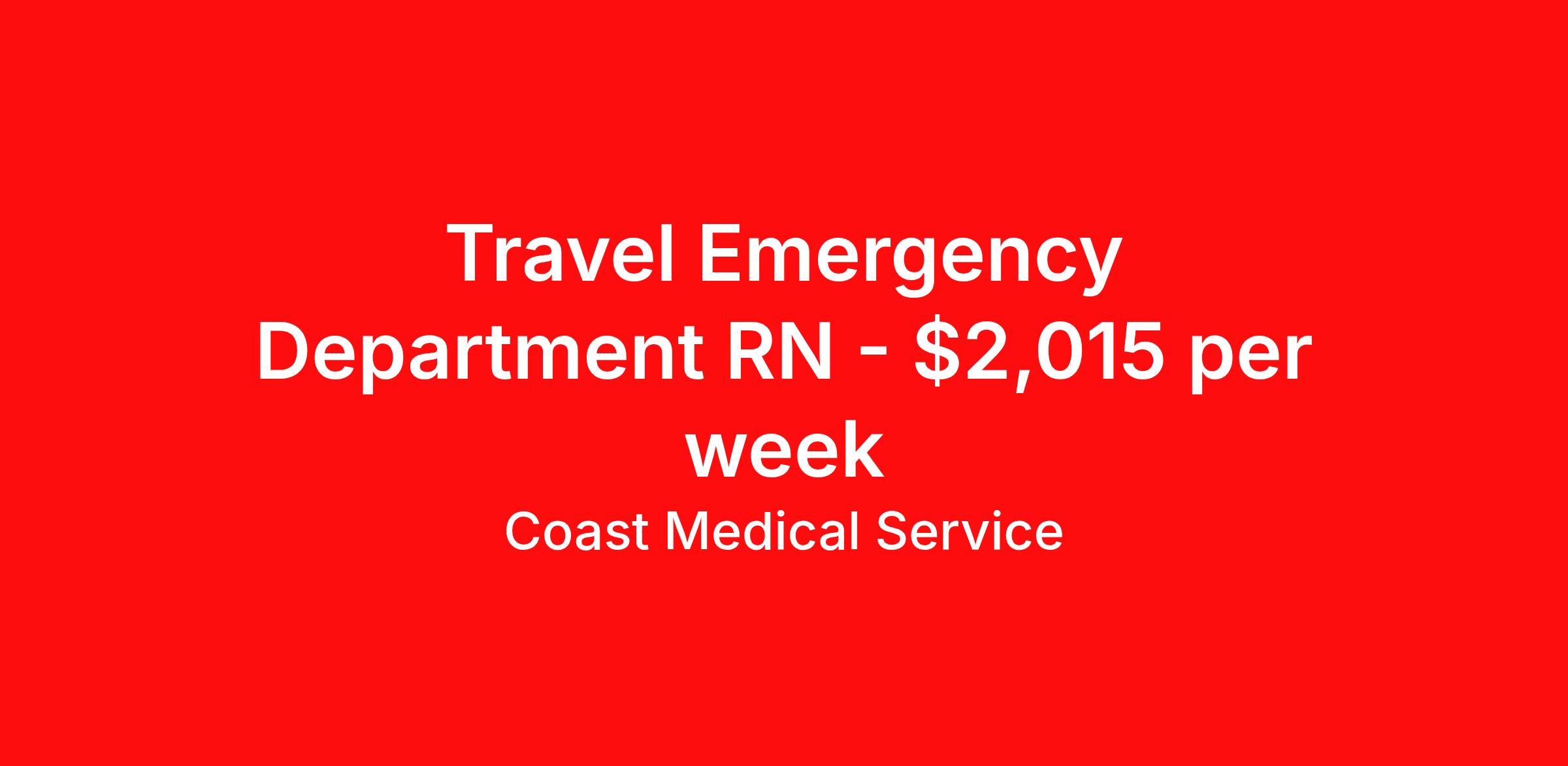 Coast Medical Service is seeking a travel nurse RN ED - Emergency Department for a travel nursing job in Santa Fe, New Mexico. Job Description & Requirements Specialty: ED - Emergency Department Discipline: RN Start Date: 04/20/2026 Duration: 13 weeks 36 hours per week Shift: 12 hours, nights Employment Type: Travel Coast Medical Service is a nationwide travel nursing & allied healthcare staffing agency dedicated to providing an elite traveler experience for the experienced or first-time traveler. Coast is featured on Blue Pipes' 2023 Best Travel Agencies and named a 2022 Top Rated Healthcare Staffing Firm & 2023 First Half Top Rated Healthcare Staffing Firm by Great Recruiters. Please note that pay rate may differ for locally based candidates. Please apply here or contact a recruiter directly to learn more about this position & the facility, and/or explore others that may be of interest to you. We look forward to speaking with you! Coast Medical Services Job ID 36099717. Pay package is based on 12 hour shifts and 36.0 hours per week (subject to confirmation) with tax-free stipend amount to be determined. Posted job title: RN:Emergency Room,19:00:00-07:30:00