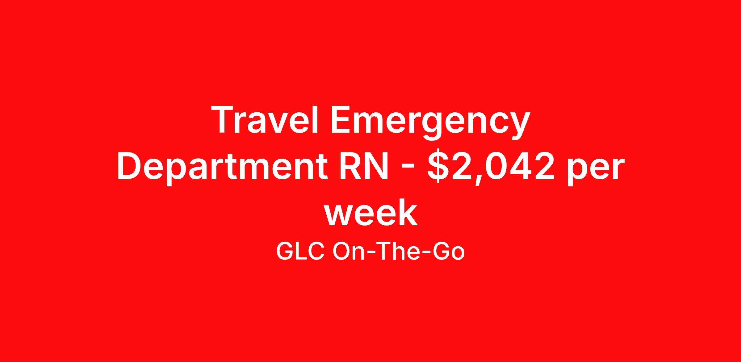 GLC On-The-Go is seeking a travel nurse RN ED - Emergency Department for a travel nursing job in Santa Fe, New Mexico. Job Description & Requirements Specialty: ED - Emergency Department Discipline: RN Start Date: 04/20/2026 Duration: 13 weeks 36 hours per week Shift: 12 hours Employment Type: Travel GLC is hiring: RN Emergency Department (ER) - Santa Fe, NM - 13-week contract GLC – Named Best Nurse Agency 2024–2025 We connect nurses, nursing professionals, and allied health professionals like you to contracts that align with your skills, schedule, and career goals. About this Assignment Join the care team in Emergency Department (ER) where you’ll provide patient-centered care in a collaborative environment. Typical responsibilities include direct patient care, timely documentation, and coordination with the care team. Specific duties will be confirmed during your interview with a recruiter. Assignment Details Location: Santa Fe, NM Assignment Length: 13 weeks Start Date: 04/20/2026 End Date: 07/19/2026 Pay Range: $1,838 - $2,042 Minimum Requirements Active license in Emergency Department (ER) 1 year full-time RN, Emergency Department (ER) experience within the last 2 years What you can expect from GLC Weekly on-time pay with direct deposit Transparent communication, clear assignment details, and recruiter support from start to finish - or extension Referral bonus up to $500 Health, dental, and vision insurance 401(k) plan Completion and signing bonuses may also be available Ready to move forward? Apply now and start your rewarding journey with GLC - a recruiter will connect quickly to review pay , start date , and assignment details so you can make the best decision for your next contract. GLC On-The-Go Job ID 502348. Pay package is based on 12 hour shifts and 36 hours per week (subject to confirmation) with tax-free stipend amount to be determined. Posted job title: Travel: RN - Emergency Room-NIGHTS About GLC On-The-Go GLC is more than just a staffing agency – we’re your trusted partner in finding travel, local, and PRN contracts that align with your career aspirations and lifestyle. We specialize in connecting travel nurses and allied healthcare professionals like you with opportunities in acute care, long-term care, behavioral health, and allied fields across the U.S. Our attentive and friendly recruiters are always just a call or text away, ready to guide you at every step, ensuring you feel valued and heard. We understand the unique needs of travel healthcare professionals, which is why we offer comprehensive benefits and 24/7 support. Join GLC, where our 20 years of experience mean we know how to help you find the assignments that turn your career goals into reality. With us, it's not just a placement – it's your dream career made possible