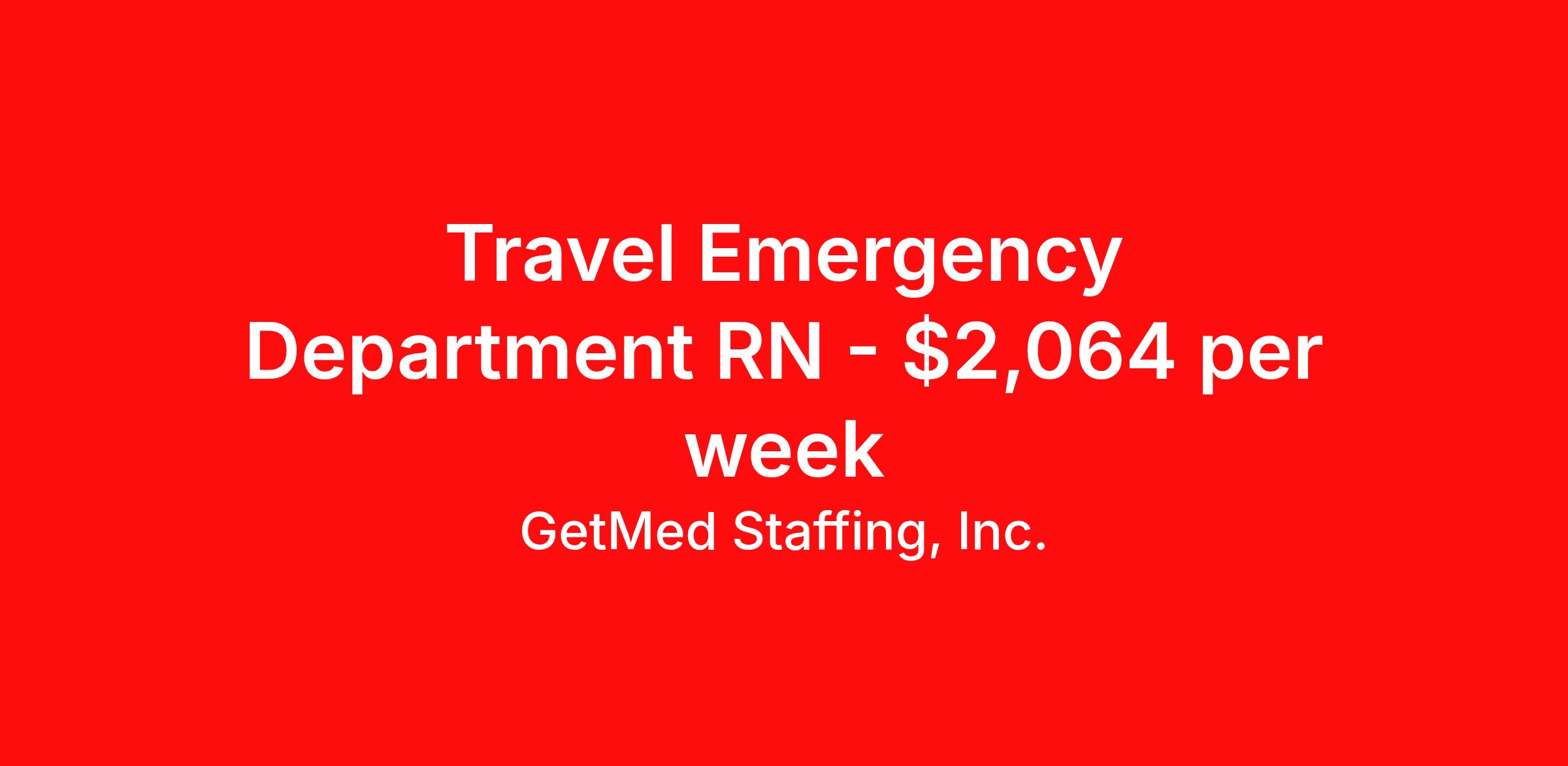 GetMed Staffing, Inc. is seeking a travel nurse RN ED - Emergency Department for a travel nursing job in Cody, Wyoming. Job Description & Requirements Specialty: ED - Emergency Department Discipline: RN Start Date: 04/20/2026 Duration: 13 weeks 36 hours per week Shift: 12 hours, nights Employment Type: Travel GetMed Staffing is searching for a strong ER RN to assist our traveler-friendly client. A minimum of 1-2 years of experience is required. Traveling with GetMed Staffing offers the unique opportunity to gain diverse experiences, both personally and professionally. Gain experience that matters. GetMed Staffing, Inc. Job ID 36195726. Pay package is based on 12 hour shifts and 36.0 hours per week (subject to confirmation) with tax-free stipend amount to be determined. Posted job title: RN:ER,19:00:00-07:00:00 About GetMed Staffing, Inc. We are a diversity owned company, specializing in healthcare recruiting services. We truly understand how important a healthcare travelers' relationship is with their recruiter, as well as our relationship is with our healthcare facilities. We recognize that the needs of our healthcare travelers can vary, and therefore we provide the personalized touch necessary to ensure a successful travel assignment each and every time. Our healthcare facilities and clients benefit from us putting our healthcare travelers first. GetMed Staffing is excited to be a leader within the industry by focusing on providing healthcare travelers with more choices and possibilities as they plan for their next healthcare travel assignment. Benefits Life insurance Medical benefits Dental benefits Vision benefits 401k retirement plan
