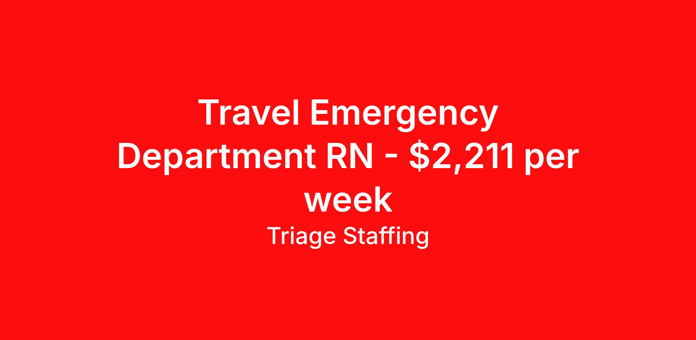 Triage Staffing is seeking a travel nurse RN ED - Emergency Department for a travel nursing job in Lewiston, Maine. Job Description & Requirements Specialty: ED - Emergency Department Discipline: RN Start Date: 04/06/2026 Duration: 13 weeks 36 hours per week Shift: 12 hours, nights Employment Type: Travel Travel Nursing: Emergency Department Lewiston, ME Location: Lewiston, ME Start Date: 4/6/2026 Shift Details: 12H Nights 36 hours per week Length: 13 WEEKS Apply for specific facility details.ER RN Triage Staffing Job ID CHF9E6TC. Posted job title: Nursing: Emergency Department About Triage Staffing At Triage, we prefer to be real . Real about expectations—both ours and yours. Real about how a decision you make today could affect your tomorrows. Real about how compensation actually works. Real about how great—or grating—your next supervisor may be. Being real allows everyone at Triage to be ready . Ready to serve you with real honesty. So if that gig near the ocean is really no day at the beach, or that third shift comes with a second-class rate, we tell you. So you can be ready, too. We staff all five major divisions of acute care—nursing, lab, radiology, cardiopulmonary and rehab therapy, offering: - Competitive, custom pay packages - One point of contact for both travelers and facilities (per division) - A reliable recruiter who's got your back throughout your entire assignment - In-house compliance and accounting specialists - A clinical liaison team available 24/7 to offer medical and professional support and career development - A mentoring program that is run and managed by actual clinicians—yeah, you read that right - And more (because of course there’s more) Are we the biggest? No. Are we the best? That’s rather subjective, but we’re trying to be. Will we work like hell to get you as close to your idea of heaven as possible? Yes. Yes, we will. Benefits: Day One comprehensive, nationwide insurance plans for health, vision and dental and life—including a HSA option Day One 401(k) program with employer-matching contributions once eligible Facility cancelling protection—your time is money on and off-the-clock Guaranteed hours Weekly paychecks via direct deposit Earned vacation bonuses for time worked Paid holidays Employee assistance program (EAP)—your mental health is important, too Continuing education, certification and licensing reimbursement Workers comp—because accidents happen Top-rated professional liability insurance Company provided housing options Referral bonus—$750 in your pocket after they’ve completed a 13-week assignment