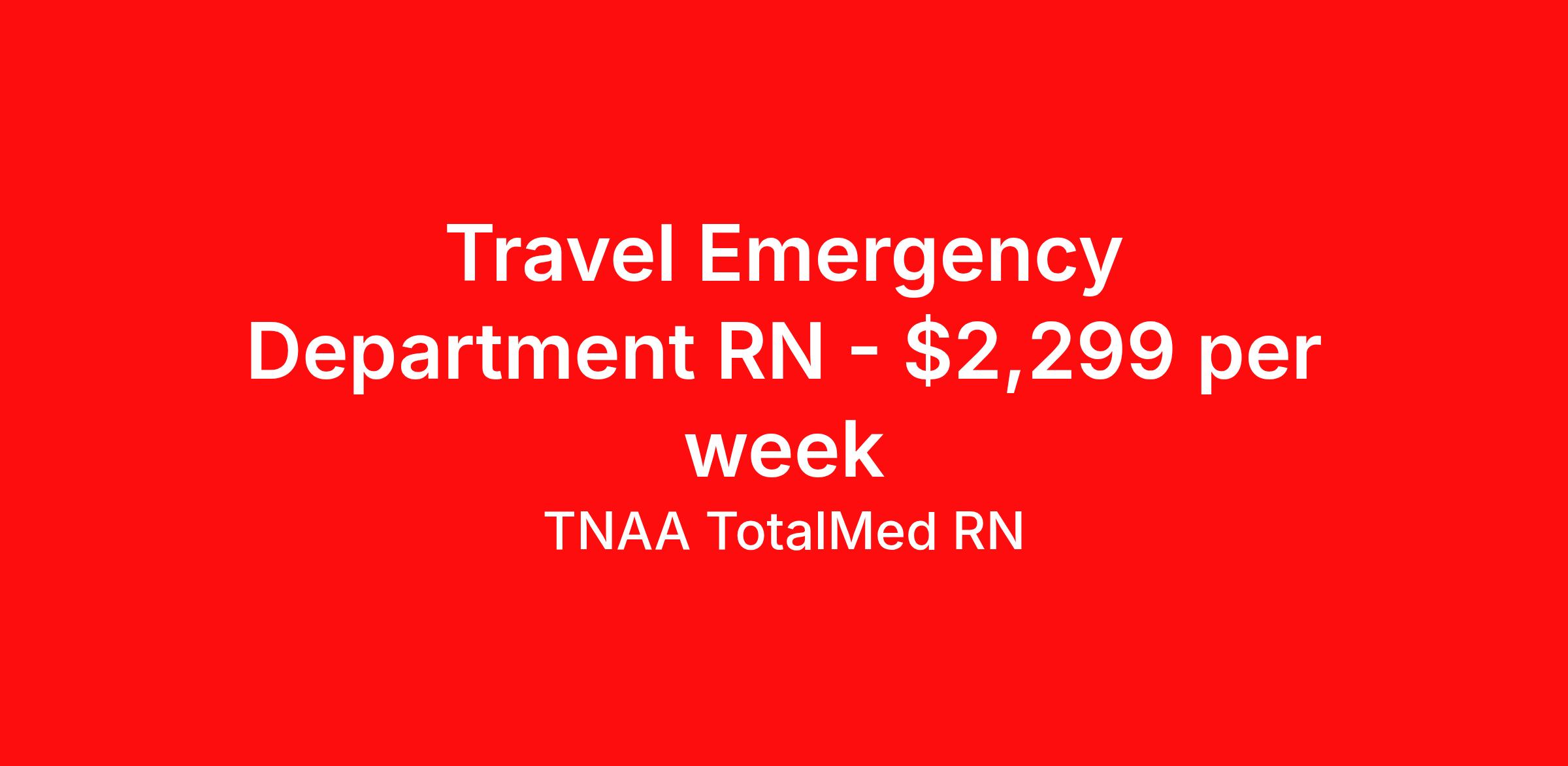 TNAA TotalMed RN is seeking a travel nurse RN ED - Emergency Department for a travel nursing job in Freeport, Illinois. Job Description & Requirements Specialty: ED - Emergency Department Discipline: RN Start Date: 04/13/2026 Duration: 13 weeks 36 hours per week Shift: 12 hours, nights Employment Type: Travel We're looking for Emergency Room RNs for an immediate travel nurse opening in Freeport, IL. The right RN should have 1-2 years recent acute care experience. Read below for more requirements. As an ER Travel Nurse, you will work with a diverse team of caregivers to appropriately evaluate, triage and implement care using correct procedures and physician instructions. RNs should have experience and skill caring for patients in a fast-paced, urgent and emergency environment. Emergency Room RNs will perform minor medical operations, advise patients and family on illnesses or injuries, and plan long-term care needs. Other responsibilities as an ER Travel Nurse include documenting medical history, checking for any allergies patients might have, obtaining patient vital signs, and monitoring patients' emotional and physical well-being. As an ER Travel Nurse, you should be prepared to perform the following tasks: Provide basic bedside care. Clean and bandage wounds. Provide IV therapy. Maintain supplies and medical equipment. Report suspected abuse to appropriate agencies. ER Travel Nurses should be able to stand and walk for long periods of time, as well as bend, lean and stoop without difficulty. RNs should be able to easily lift 20 pounds. Moving or lifting of patients may require lifting of up to 50 pounds at times. Because of the fast-paced environment, Emergency Room RNs must possess good skills for coping with stress and be able to relate to people of all ages and backgrounds. Requirements*: ACLS, BLS, NIH, PALS, TNCC, 3 Years * Additional certifications may be required before beginning an assignment. TotalMed Travel Job ID 1395325. Pay package is based on 12 hour shifts and 36 hours per week (subject to confirmation) with tax-free stipend amount to be determined. Posted job title: Emergency Room - ER RN - Travel Nurse About TNAA TotalMed RN TotalMed is a Top Ten, travel nursing and healthcare staffing agency with the mission of igniting purpose in healthcare. The organization staffs nurses, therapists, pharmacists, and other clinicians of all specialties in all 50 states. They offer local and travel jobs and match caregivers with the right organization to assist both facilities and patients. As an organization, they focus on putting highly-skilled staff into facilities to ensure adequate staffing for a better patient experience. TotalMed specializes in recruiting and placing healthcare professionals in travel, PRN, and permanent positions across the country in Nursing and Allied Health. Throughout 2020, the organization filled roles at even the most short-staffed facilities during the most challenging time in healthcare. By matching the right travel healthcare professional with the right organization, TotalMed continues to offer a lifeline to facilities and their patients. Benefits Weekly pay Guaranteed Hours Continuing Education 401k retirement plan Sick pay Wellness and fitness programs Referral bonus Employee assistance programs Medical benefits Dental benefits Vision benefits Benefits start day 1