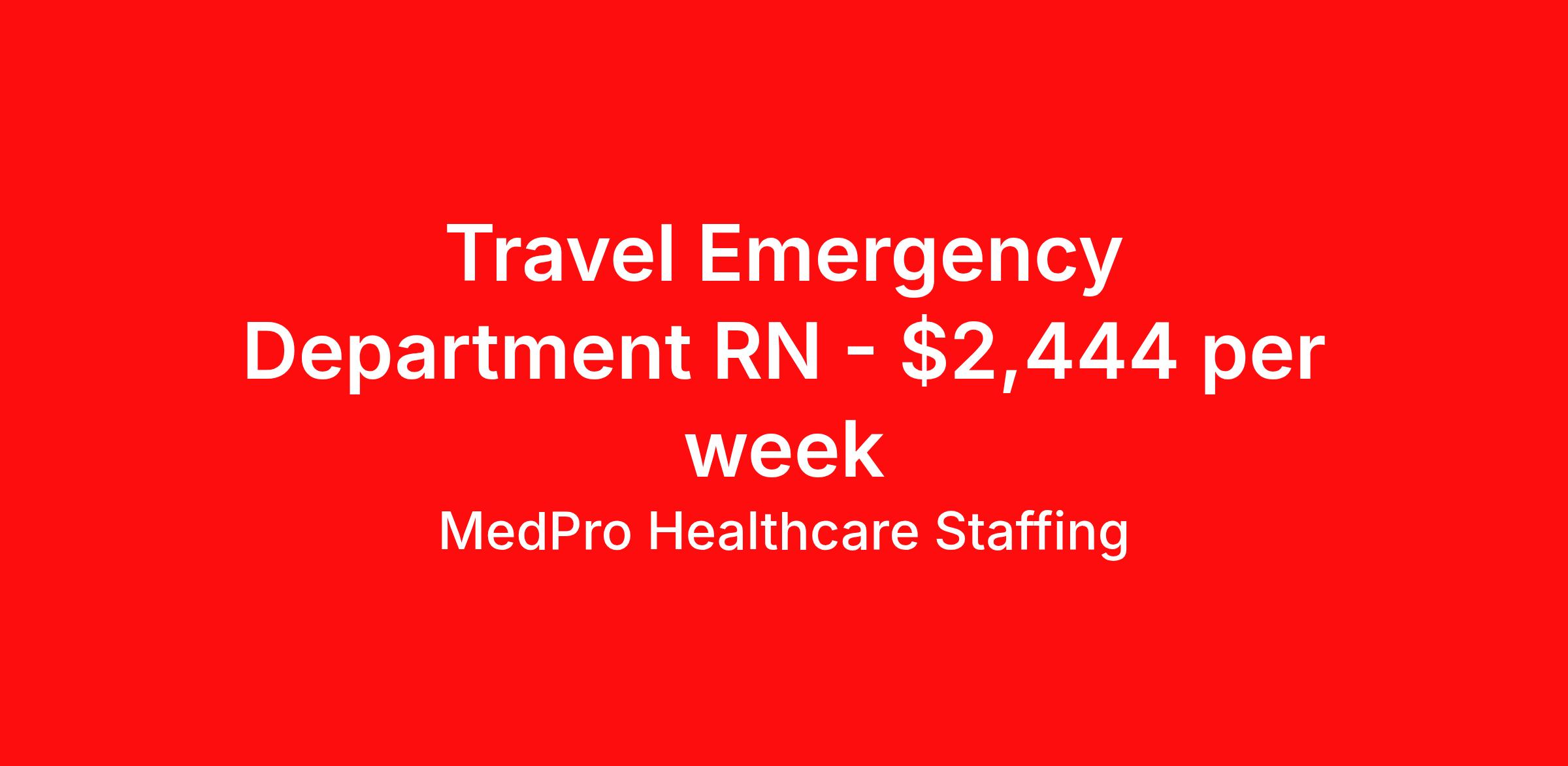 MedPro Healthcare Staffing is seeking a travel nurse RN ED - Emergency Department for a travel nursing job in Washington, District of Columbia. Job Description & Requirements Specialty: ED - Emergency Department Discipline: RN Start Date: 04/06/2026 Duration: 13 weeks 36 hours per week Shift: 12 hours, nights Employment Type: Travel MedPro Healthcare Staffing , a Joint Commission-certified staffing agency, is seeking a quality Registered Nurse - Emergency Room for a travel assignment with one of our top healthcare clients. Requirements Active RN License Degree from accredited nursing program BLS, ACLS, PALS & TNCC may be required in some positions Eighteen months of recent experience in an Acute Care Emergency Room setting Other requirements to be determined by our client facility Benefits Weekly pay and direct deposit Full coverage of all credentialing fees Private housing or housing allowance Group Health insurance for you and your family Company-paid life and disability insurance Travel reimbursement 401(k) matching Unlimited Referral Bonuses up to $1,000 Duties Responsibilities Emergency Room registered nurses (RN) provide care for patients from various types of illness or trauma requiring emergency attention and must be able to recognize and effectively treat life-threatening conditions Responsible for assessing, intervening and stabilizing a variety of trauma and illnesses with decisive action. Due to the range of medical conditions that may require urgent treatment and care, they must be knowledgeable about general as well as specific health issues. Properly understand triage in order to prioritize injuries based on medical need. Able to make quick and accurate assessments about incoming patients, including both physical and mental health conditions. About Agency MedPro Healthcare Staffing is a Joint Commission certified provider of contract staffing services. Since 1983, we have placed nursing and allied travelers in top healthcare facilities nationwide. Join us today for your very own MedPro Experience®. If qualified and interested, please call for immediate consideration. MedPro Staffing is an Equal Opportunity Employer. All applicants will be considered for employment without attention to race, color, religion, national origin, age, sex, disability, marital status or veteran status. Key Words: Emergency Room Nurse, RN-ER, Emergency Room, Critical Care, Emergency Department, ACLS, EKG, Travel Nurse, Contract Nurse, Agency Nurse, Travel Contract, ER-RN, RN-ED, Emergency Room Nursing, ED Nurse, ER positions, RN-ER positions, ER Contracts, Travel Nurse *Weekly payment estimates are intended for informational purposes only and include a gross estimate of hourly wages and reimbursements for meal, incidental, and housing expenses. Your recruiter will confirm your eligibility and provide additional details. MedPro Job ID a0Fcx00000D0VHIEA3. Pay package is based on 12 hour shifts and 36 hours per week (subject to confirmation) with tax-free stipend amount to be determined. Posted job title: Emergency Room Registered Nurse Nursing: Emergency Room. About MedPro Healthcare Staffing At MedPro Healthcare Staffing , we believe no one cares more for caregivers than we do. Our mission is simple: you focus on your patients, and we’ll take care of the rest. As a Joint Commission-certified leader in temporary and contract healthcare staffing since 1983, MedPro has proudly connected nursing and allied travelers with top healthcare facilities across the nation. With thousands of job opportunities available nationwide, we make it easy to find assignments that align with your goals and lifestyle. Our on-staff clinical support team—alongside a compassionate group of experienced recruiters—provides hands-on guidance every step of the way. From Day 1 medical benefits and a 401(k) plan to personalized career support, we’re committed to ensuring every professional we serve feels valued, cared for, and empowered to succeed. Guided by a CEO who is a Registered Nurse, MedPro is built on a foundation of clinical insight and genuine compassion for the caregiving community. Through The MedPro Experience® , we deliver travel assignments that are rewarding, memorable, and designed to help you DREAM big, EXPLORE often, and ACHIEVE greatness. Benefits Day 1 medical, dental, and vision benefits for you and your family Weekly pay and direct deposit Unlimited Referral Bonuses starting at $500 On Staff Clinical Support Team Access to nationwide travel assignments MPX Mobile app -24/7 real-time access to jobs, credentials, assignment details, and more Full coverage of all credentialing fees Private housing or housing allowance Tax Free Per Diems, Housing Stipends and Travel Reimbursements Company-paid life and disability insurance Travel reimbursement 401(k) matching Benefits Weekly pay Referral bonus Employee assistance programs