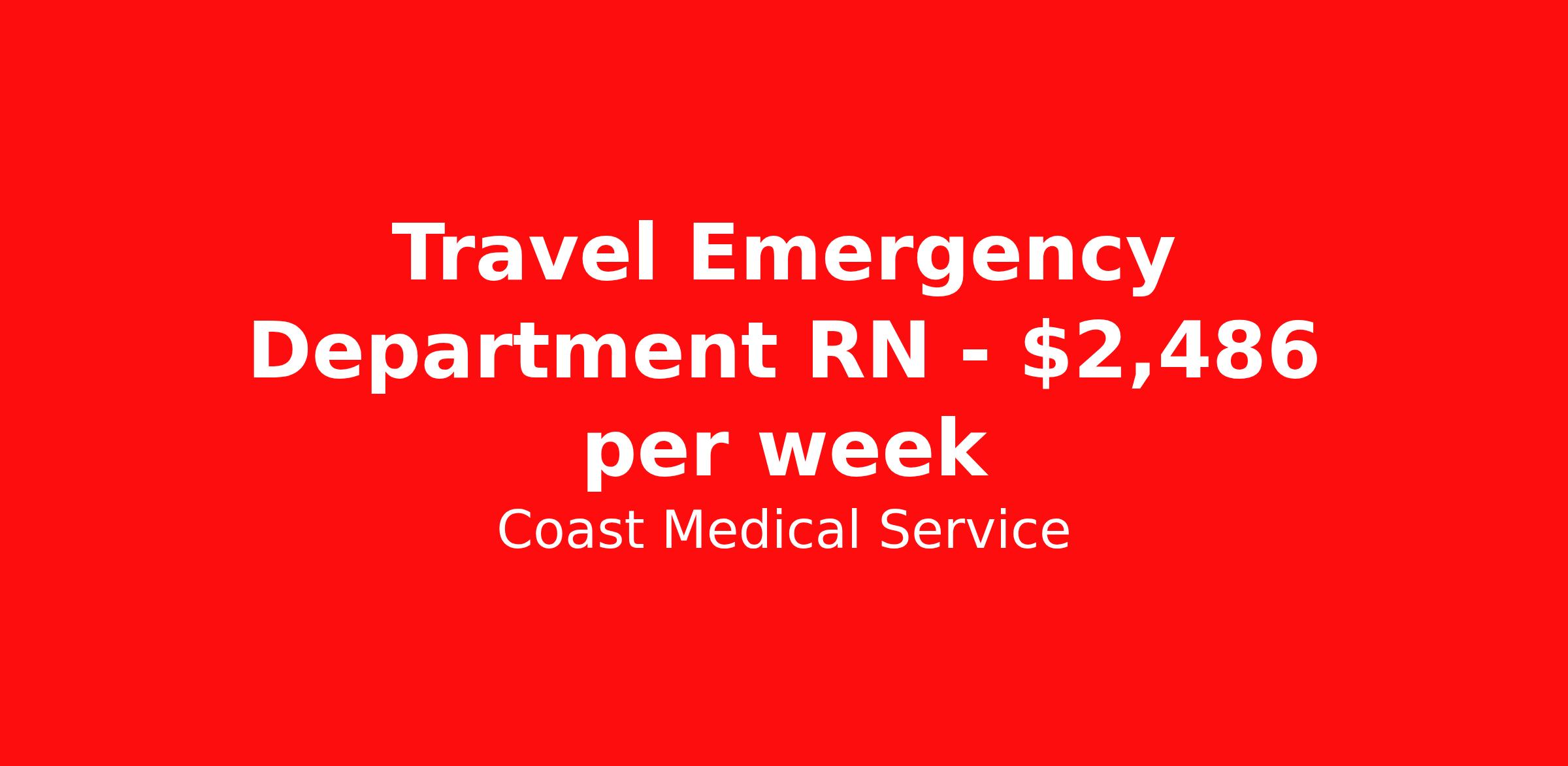 Coast Medical Service is seeking a travel nurse RN ED - Emergency Department for a travel nursing job in Waimea, Hawaii. Job Description & Requirements Specialty: ED - Emergency Department Discipline: RN Start Date: ASAP Duration: 10 weeks 36 hours per week Shift: 12 hours Employment Type: Travel Coast Medical Service is a nationwide travel nursing & allied healthcare staffing agency dedicated to providing an elite traveler experience for the experienced or first-time traveler. Coast is featured on Blue Pipes' 2023 Best Travel Agencies and named a 2022 Top Rated Healthcare Staffing Firm & 2023 First Half Top Rated Healthcare Staffing Firm by Great Recruiters. Please note that pay rate may differ for locally based candidates. Please apply here or contact a recruiter directly to learn more about this position & the facility, and/or explore others that may be of interest to you. We look forward to speaking with you! Coast Medical Services Job ID 36054062. Pay package is based on 12 hour shifts and 36.0 hours per week (subject to confirmation) with tax-free stipend amount to be determined. Posted job title: RN:Emergency Room,07:00:00-19:00:00