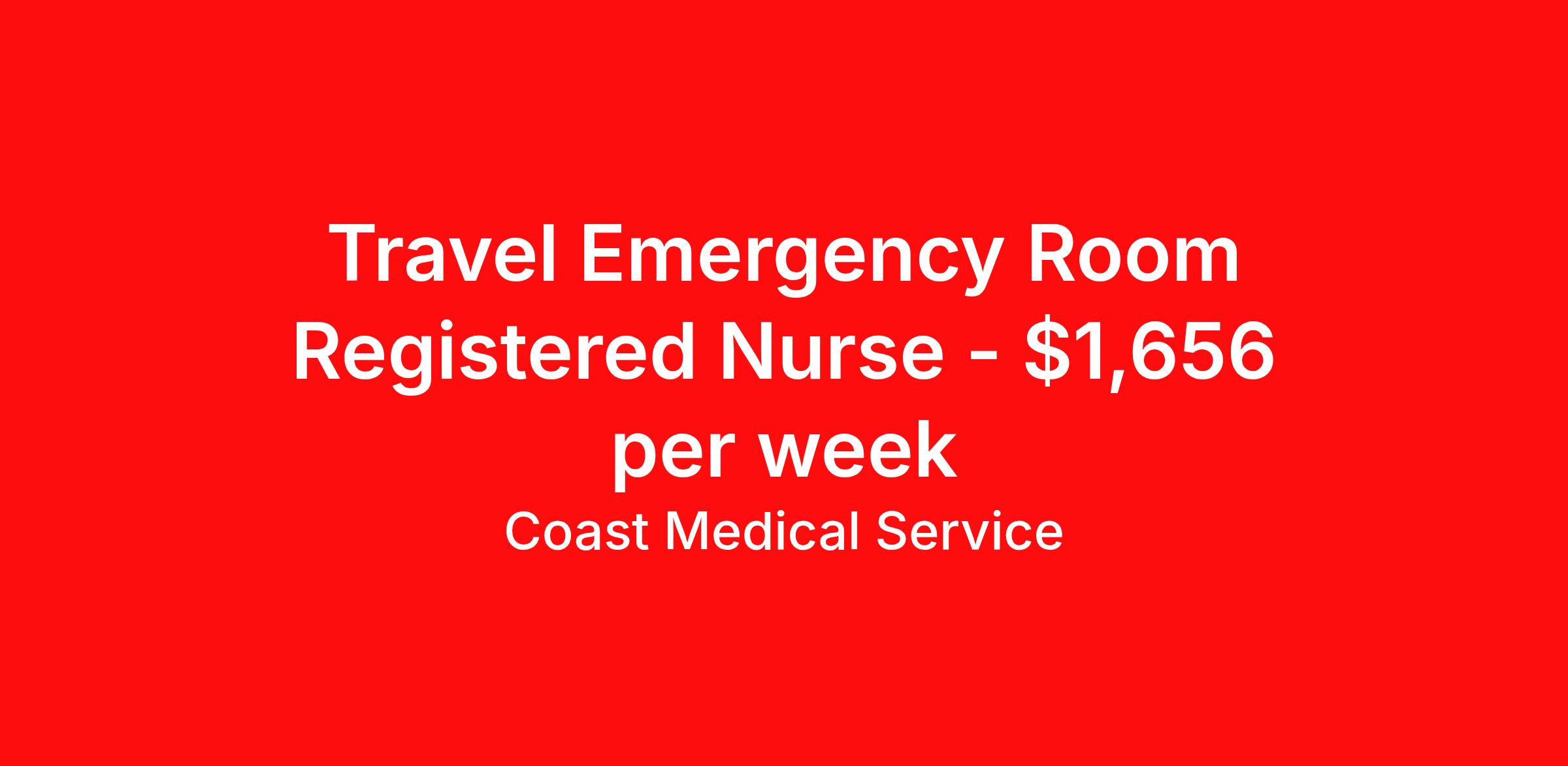 Coast Medical Service is seeking a travel nurse RN ED - Emergency Department for a travel nursing job in Augusta, Georgia. Job Description & Requirements Specialty: ED - Emergency Department Discipline: RN Start Date: 04/13/2026 Duration: 14 weeks 36 hours per week Shift: 12 hours, days Employment Type: Travel Coast Medical Service is a nationwide travel nursing & allied healthcare staffing agency dedicated to providing an elite traveler experience for the experienced or first-time traveler. Coast is featured on Blue Pipes' 2023 Best Travel Agencies and named a 2022 Top Rated Healthcare Staffing Firm & 2023 First Half Top Rated Healthcare Staffing Firm by Great Recruiters. Please note that pay rate may differ for locally based candidates. Please apply here or contact a recruiter directly to learn more about this position & the facility, and/or explore others that may be of interest to you. We look forward to speaking with you! Coast Medical Services Job ID 36120124. Pay package is based on 12 hour shifts and 36.0 hours per week (subject to confirmation) with tax-free stipend amount to be determined. Posted job title: RN:Emergency Room,07:00:00-19:30:00