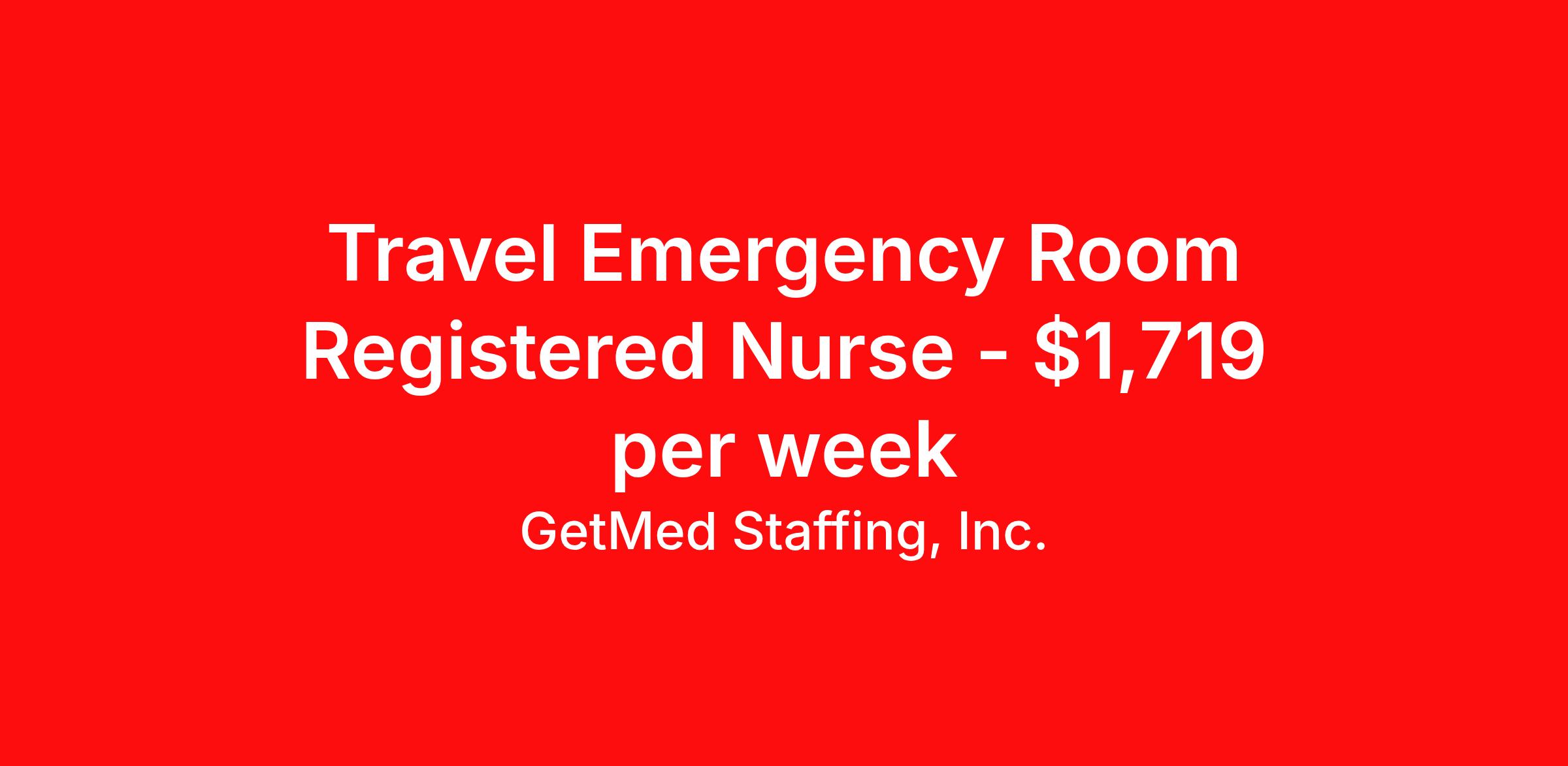 GetMed Staffing, Inc. is seeking a travel nurse RN ED - Emergency Department for a travel nursing job in Indianapolis, Indiana. Job Description & Requirements Specialty: ED - Emergency Department Discipline: RN Start Date: ASAP Duration: 13 weeks 36 hours per week Shift: 12 hours, nights Employment Type: Travel GetMed Staffing is searching for a strong ER RN to assist our traveler-friendly client. A minimum of 1-2 years of experience is required. Traveling with GetMed Staffing offers the unique opportunity to gain diverse experiences, both personally and professionally. Gain experience that matters. GetMed Staffing, Inc. Job ID 36162730. Pay package is based on 12 hour shifts and 36.0 hours per week (subject to confirmation) with tax-free stipend amount to be determined. Posted job title: RN:ER,19:00:00-07:00:00 About GetMed Staffing, Inc. We are a diversity owned company, specializing in healthcare recruiting services. We truly understand how important a healthcare travelers' relationship is with their recruiter, as well as our relationship is with our healthcare facilities. We recognize that the needs of our healthcare travelers can vary, and therefore we provide the personalized touch necessary to ensure a successful travel assignment each and every time. Our healthcare facilities and clients benefit from us putting our healthcare travelers first. GetMed Staffing is excited to be a leader within the industry by focusing on providing healthcare travelers with more choices and possibilities as they plan for their next healthcare travel assignment. Benefits Life insurance Medical benefits Dental benefits Vision benefits 401k retirement plan