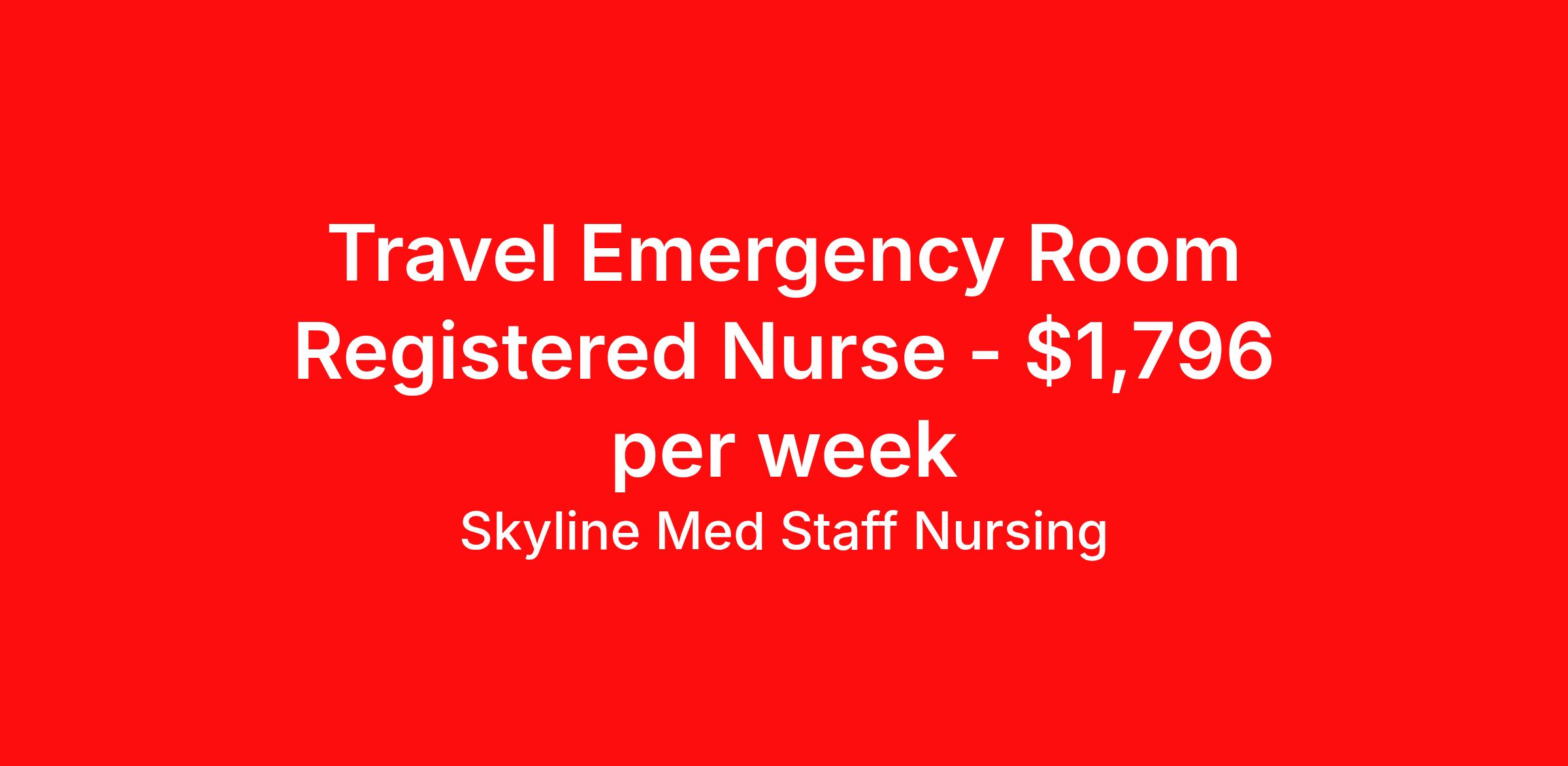 Skyline Med Staff Nursing is seeking a travel nurse RN ED - Emergency Department for a travel nursing job in Wichita, Kansas. Job Description & Requirements Specialty: ED - Emergency Department Discipline: RN Start Date: 04/12/2026 Duration: 13 weeks 36 hours per week Shift: 12 hours, nights Employment Type: Travel Weekly amount stated in job postings is an estimate based on estimated hourly wage and potential stipends available for the location of the assignment. Pay package is calculated on bill rate at the time job was posted, but can change or vary without notice. Exact pay packages might vary as this is an estimate. Our recruiter would be happy to build an exact pay package for you for each job. Skyline Med Staff Nursing Job ID 36177171. Pay package is based on 12 hour shifts and 36.0 hours per week (subject to confirmation) with tax-free stipend amount to be determined. Posted job title: RN:ER,19:00:00-07:00:00 About Skyline Med Staff Nursing Join the Top- Rated Travel Healthcare Team! Skyline Med Staff was named as the 1 Best Travel Healthcare Company in 2025 by BluePipes, a recognition driven by glowing reviews from travel healthcare professionals. Our recruiters are consistently praised on Google for their responsiveness, dedication, accessibility, and industry knowledge. Ready to experience the difference? Apply for a job today and see why healthcare professionals choose Skyline! Certified Women Owned Business We believe that travel is good for the soul. We want to be on your journey with you and find the right job that fits you Skyline Med Staff is committed to one vision treating others the way that THEY want to be treated. The executive team at Skyline Med Staff focuses on a commitment to quality, consistency, and the highest level of service. Our team members continually strive to build long term relationships that center on you and helping you achieve your goals. Some of the Benefits you will receive with Skyline Med Staff: Over 30 years of combined experience in the staffing industry Higher Take-Home Pay Rates Dedicated Personal Recruiter We are available to you 24/7 Health Insurance Plan Options Tax Free Per Diems, Housing Stipends and Travel Reimbursements Joint Commission Certified Contracts in all 50 states Referral and Loyalty Bonuses Benefits Medical benefits Referral bonus
