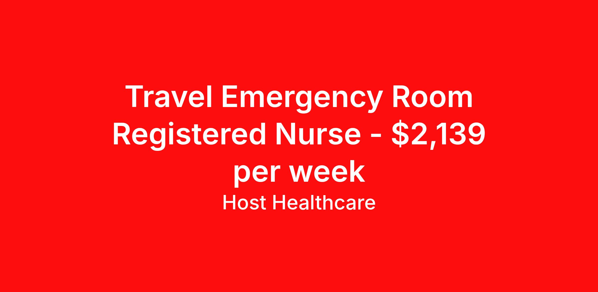 Host Healthcare is seeking a travel nurse RN ED - Emergency Department for a travel nursing job in Cedar Rapids, Iowa. Job Description & Requirements Specialty: ED - Emergency Department Discipline: RN Start Date: 04/13/2026 Duration: 13 weeks 36 hours per week Shift: 12 hours, evenings Employment Type: Travel Host Healthcare Job ID a1fVX000002zwtxYAA. Pay package is based on 12 hour shifts and 36 hours per week (subject to confirmation) with tax-free stipend amount to be determined. Posted job title: RN - Emergency Room About Host Healthcare At Host Healthcare, we provide a truly comfortable experience as you explore your travel nursing, therapy, or allied career. We make your travel healthcare journey easy by taking care of all the details, so you don’t have to. We are on a mission to help others live better and we do this by helping the healers of the world be as comfortable as possible. With access to tens of thousands of travel nursing, therapy, and allied jobs in all 50 states, our responsive and friendly recruiters find your dream position based on what’s important to you. During your assignment, get access to premium benefits, including Day 1 medical that continues up to 30 days between assignments, 401K matching, travel reimbursements, dedicated housing support, and more. We also offer 24/7 support from our team and access to our on-staff clinicians so you can feel comfortable and confident throughout your entire assignment. Travel comfortably with Host Healthcare. Benefits Referral bonus School loan reimbursement Vision benefits Wellness and fitness programs Company provided housing options License and certification reimbursement Life insurance Medical benefits Mileage reimbursement Pet insurance Discount program Employee assistance programs Guaranteed Hours Health savings account Holiday Pay 401k retirement plan Continuing Education Dental benefits
