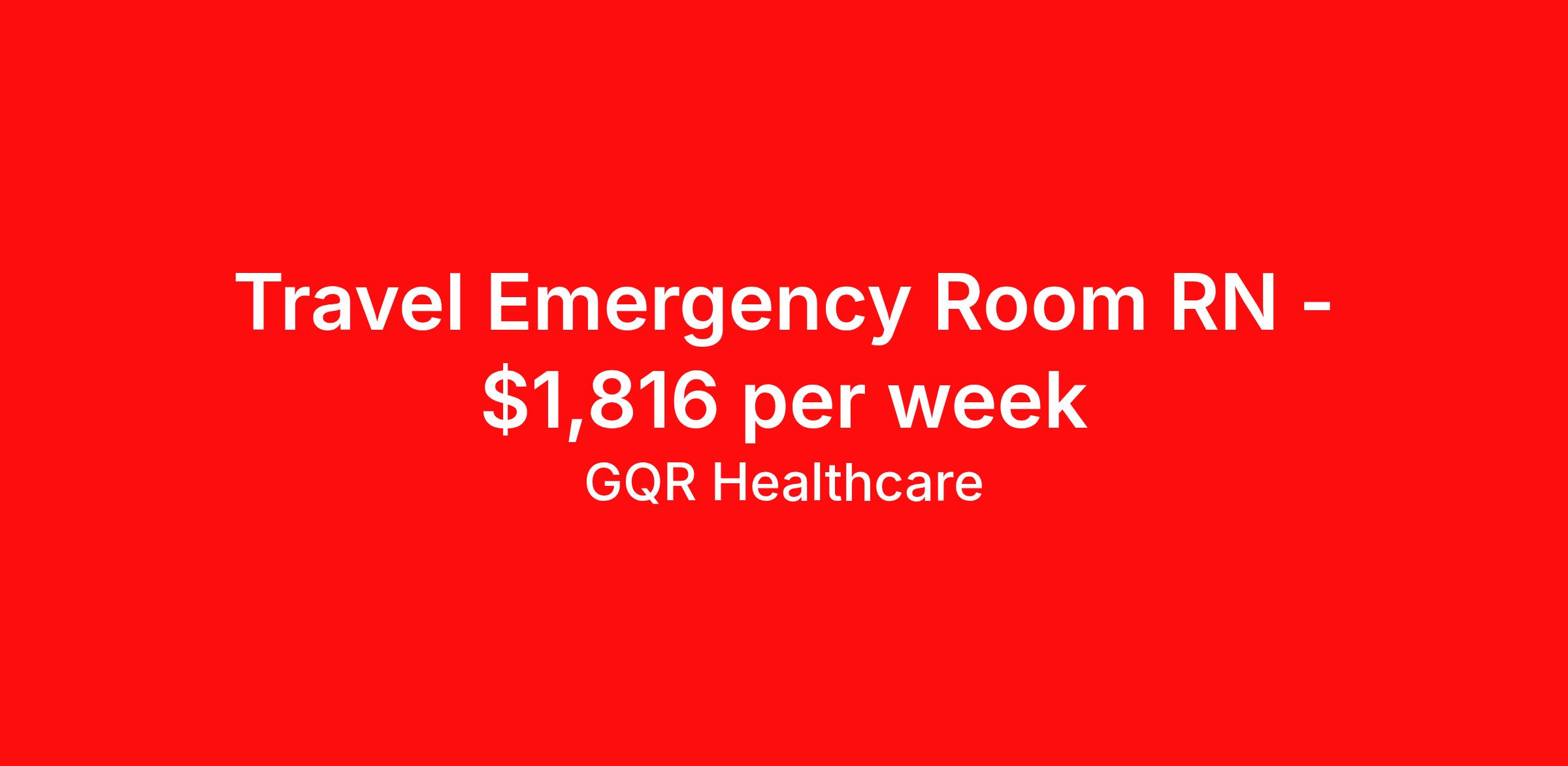GQR Healthcare is seeking a travel nurse RN ED - Emergency Department for a travel nursing job in Germantown, Tennessee. Job Description & Requirements Specialty: ED - Emergency Department Discipline: RN Start Date: 04/20/2026 Duration: 13 weeks 36 hours per week Shift: 12 hours, nights Employment Type: Travel Contract - W2 Emergency Room (ER) Registered Nurse (RN) Job Location: Germantown, Tennessee Start Date: April 20, 2026 Profession: Registered Nurse (RN) Facility: Short Term Acute Care Estimated Pay: $1816.11 - $1911.11 Duration:13 weeks Specialty:Emergency Room (ER) Shift: Night Shift Details: null Night Job Type: Travel *Estimated weekly pay includes projected hourly wages and weekly meal and lodging per diems for eligible clinicians based on nationally published GSA rates. Actual weekly pay and per diems may differ from the amount shown and are subject to change during an assignment. Benefits: Day 1 Insurance Cigna medical, MetLife dental and vision insurance License reimbursement for new licenses needed for each assignment Discounts with hotels and rental cars A dedicated recruiter and support team that will help you every step of the way to sure you start on time and have an exceptional experience Referral bonus up to $700 About the Company: Finding the right role is about more than just matching skills to a job—it’s about aligning with your goals, values, and the way you want to work. As an award-winning talent partner, we support healthcare professionals through every step of that process, offering meaningful opportunities, clear guidance, and long-term partnership. From our first conversation to your first day on the job (and beyond!), we’re here to help you move forward with confidence. GQR Job ID 783196. Pay package is based on 12 hour shifts and 36 hours per week (subject to confirmation) with tax-free stipend amount to be determined. Posted job title: Registered Nurse (RN) About GQR Healthcare GQR’s Healthcare team specializes in connecting experts within the industry to highly skilled healthcare professionals across the US market. In the competitive healthcare market, we recognize that the industry’s common goals of improved quality of care and patient outcomes are wholly reliant upon the professionals directly supporting these initiatives. Leveraging our extensive candidate network, we deliver continuity of care for the communities our partners serve to ensure the patient experience is of the highest quality. Through deep market specialization and a unique approach to talent acquisition, GQR Healthcare provides an unparalleled and personalized experience across all medical specialties in nursing and within diverse healthcare platforms across the industry.
