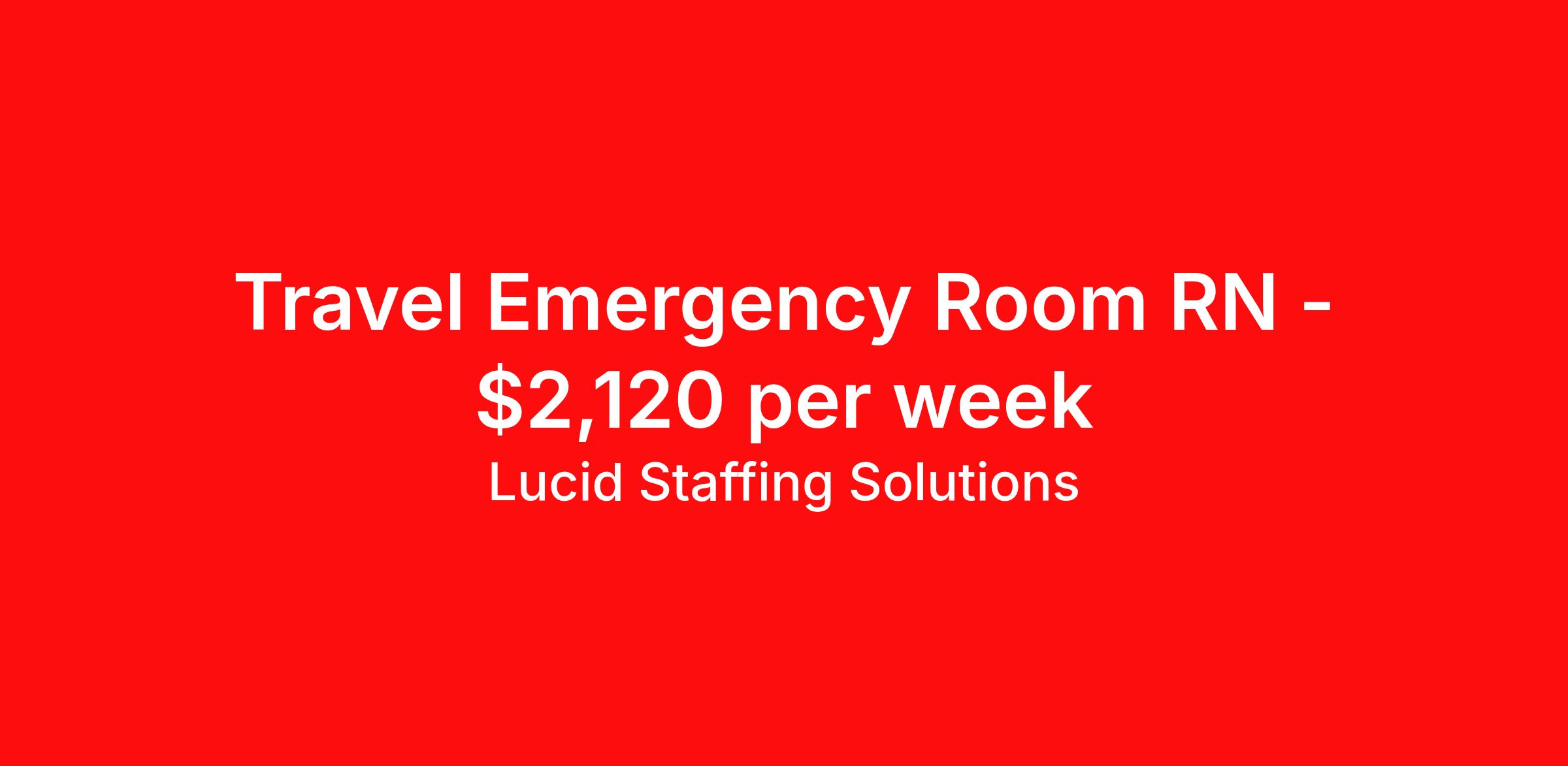 Lucid Staffing Solutions is seeking a travel nurse RN ED - Emergency Department for a travel nursing job in Hazard, Kentucky. Job Description & Requirements Specialty: ED - Emergency Department Discipline: RN Duration: 13 weeks 36 hours per week Shift: 12 hours, days Employment Type: Travel Job Description Position: Travel Registered Nurse (RN) with experience in ER Location: Hazard, Kentucky Shift: hr Day Weekly Gross: $2120.08 Lucid Staffing Solutions was created by former healthcare workers who lived the short staffing, the chaotic workflows, and the nonstop pressure that comes with patient care. We built an agency powered by real clinical experience, kept simple and supportive, so you never have to guess whether the people guiding you actually know what they’re talking about. Minimum Requirements: Active license as a Registered Nurse (RN) Licensed in Kentucky (If applicable) or compact eligible Two years of recent ER experience Active BLS Why Lucid Works for Travelers Paid Weekly: Stipends pushed to GSA limits whenever possible $500 Travel Reimbursement: Paid at the start of each assignment Clinician-Led Team: Recruiters and Account Managers with real clinical experience In-House Compliance: fast updates, real communication, and none of the delays that come with outsourced vendors. Health Coverage Options: Multiple medical plans plus dental, vision, and workers compensation 401(k) Match: 4 percent match after 6 months License & Certification Reimbursement: We help cover the cost of staying compliant Liability Insurance: Included automatically Referral Bonuses: $500 per referral, $750 after five referrals Ready to start your journey? Apply today to connect with a Clinician-Recruiter! Lucid Staffing Solutions Job ID 36510. Pay package is based on 12 hour shifts and 36 hours per week (subject to confirmation) with tax-free stipend amount to be determined. Posted job title: ER About Lucid Staffing Solutions Clinician Owned & Operated At Lucid Staffing Solutions, we do things differently—because we’ve been in your shoes. Founded by actual healthcare professionals, Lucid was built to fix the issues we experienced as travelers. We know what makes a great assignment: competitive pay, seamless onboarding, honest recruiters, and most importantly—working with a team that truly sees and supports you. Our entire team is made up of former clinicians who understand the demands of the job and what travelers truly need to succeed. We offer some of the highest paying allied health and nursing contracts across the country, along with some amazing benefits & perks. Whether you're chasing freedom, flexible schedules, bigger paychecks, or your next adventure, Lucid helps you get there—with real support, real respect , and real healthcare experts. Benefits Dental benefits Medical benefits Vision benefits