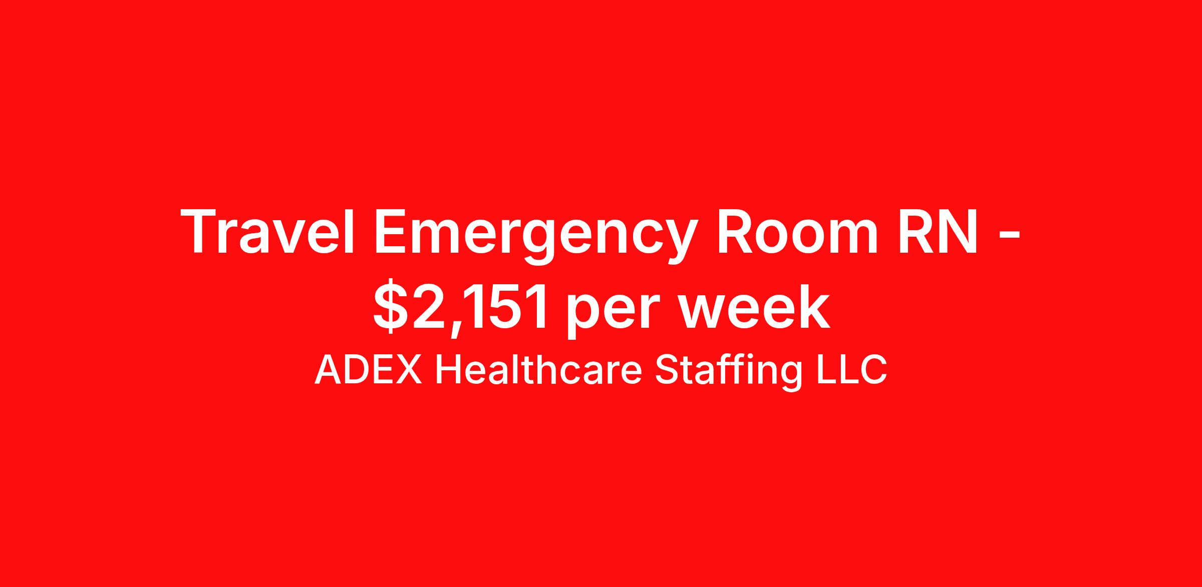 ADEX Healthcare Staffing LLC is seeking a travel nurse RN ED - Emergency Department for a travel nursing job in Germantown, Tennessee. Job Description & Requirements Specialty: ED - Emergency Department Discipline: RN Start Date: 04/20/2026 Duration: 13 weeks 36 hours per week Shift: 12 hours, nights Employment Type: Travel RN Position Job Notes: Travel or Local Registered Nurse needed for ASAP start. A minimum of 2 years of recent hospital bedside experience is required. Candidates must be able to start within 5 weeks. Opportunity for extension upon successful completion of the initial assignment. $750 referral bonus available. Opportunity: RN - ER Job Details: • 2 years of emergency room experience required (3 years preferred) • Level I Trauma Center experience required • Large hospital experience preferred • At least 1 completed previous travel assignment required • On-call shifts as needed • Weekend coverage as needed • Must be willing to work 2 of 3 major holidays (Thanksgiving, Christmas, New Year's) if all fall during assignment • Flu vaccine required with no exemptions • Active RN license in state or compact license required • ADN acceptable (BSN not required for this position) • Cerner experience preferred • Driver's license must be included with submission • May float between like units and campuses within 20 miles • Must live at least 100 miles from facility (strict local rule) • All requested time off must be included at time of submission • Holiday work requirements apply during end-of-year holidays Facility: This healthcare organization operates as a Level I Trauma Center providing short-term acute care services. The facility maintains high standards for emergency medical care and trauma services, serving as a critical healthcare resource for the community. The organization emphasizes strict compliance requirements and professional standards to ensure optimal patient outcomes and quality care delivery. Location: Germantown, TN Germantown offers an affluent suburban community just outside Memphis, known for its excellent schools, beautiful neighborhoods, and family-friendly atmosphere. The area provides easy access to Memphis attractions and amenities while maintaining a quieter, more residential feel perfect for healthcare professionals seeking a balanced lifestyle. Adex Job ID 3215398. Pay package is based on 12 hour shifts and 36 hours per week (subject to confirmation) with tax-free stipend amount to be determined. About ADEX Healthcare Staffing LLC ADEX has been placing healthcare professionals across the US since 2004. Originally founded in Atlanta, GA, the company's headquarters are now located in Tampa, FL. JCAHO certified since 2009. Benefits Referral bonus