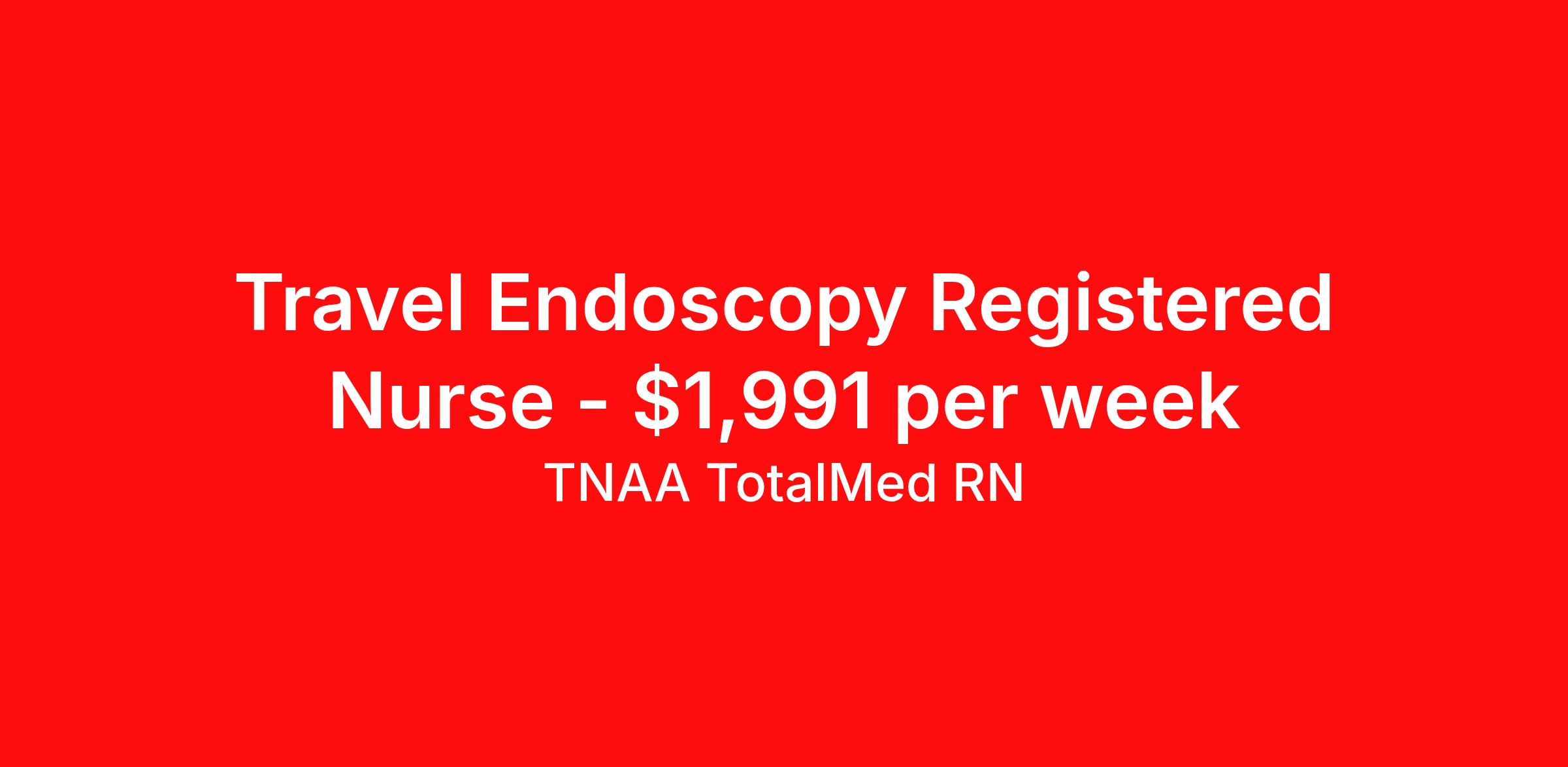 TNAA TotalMed RN is seeking a travel nurse RN Endoscopy for a travel nursing job in Madison, Wisconsin. Job Description & Requirements Specialty: Endoscopy Discipline: RN Start Date: 04/20/2026 Duration: 13 weeks 40 hours per week Shift: 8 hours, days Employment Type: Travel We're looking for Endoscopy RNs for an immediate travel nurse opening in Madison, WI. The right RN should have 1-2 years recent acute care experience. Read below for more requirements. As an Endoscopy RN, you will provide nursing care in an Endo environment, supporting the physicians and medical team in providing top-level care before, during and after the patients' procedures. Travel Nurses should have expertise in Endoscopy with an understanding in physiology, pathophysiology, endoscopy procedures, and pharmacodynamics of conscious sedation anesthesia and analgesia. As an Endo Travel Nurse, you should be prepared to perform the following tasks: Ensure a high standard of nursing care to patients attending the Endoscopy Unit, working within company policies and procedures. Provide technical assistance during diagnostic and therapeutic Endoscopic procedures, ensuring safe working practice. Participate in the care and maintenance of endoscopes and other specialized equipment, ensuring an agreed standard of decontamination at all times including accurate records of traceability of all endoscopes and associated equipment. Maintain a safe and clean environment within the clinical area in accordance with established standards and regulations. Endo Travel Nurses should be able to stand and walk for long periods of time, as well as bend, lean and stoop without difficulty. RNs should be able to easily lift 20 pounds. Moving or lifting of patients may require lifting of up to 50 pounds at times. Endo RNs may face hazards from exposure to chemicals and infectious diseases. Requirements*: ACLS, BLS, 5 Years * Additional certifications may be required before beginning an assignment. TotalMed Travel Job ID 1390460. Pay package is based on 8 hour shifts and 40 hours per week (subject to confirmation) with tax-free stipend amount to be determined. Posted job title: Endoscopy - Endo RN - Travel Nurse About TNAA TotalMed RN TotalMed is a Top Ten, travel nursing and healthcare staffing agency with the mission of igniting purpose in healthcare. The organization staffs nurses, therapists, pharmacists, and other clinicians of all specialties in all 50 states. They offer local and travel jobs and match caregivers with the right organization to assist both facilities and patients. As an organization, they focus on putting highly-skilled staff into facilities to ensure adequate staffing for a better patient experience. TotalMed specializes in recruiting and placing healthcare professionals in travel, PRN, and permanent positions across the country in Nursing and Allied Health. Throughout 2020, the organization filled roles at even the most short-staffed facilities during the most challenging time in healthcare. By matching the right travel healthcare professional with the right organization, TotalMed continues to offer a lifeline to facilities and their patients. Benefits Weekly pay Guaranteed Hours Continuing Education 401k retirement plan Sick pay Wellness and fitness programs Referral bonus Employee assistance programs Medical benefits Dental benefits Vision benefits Benefits start day 1
