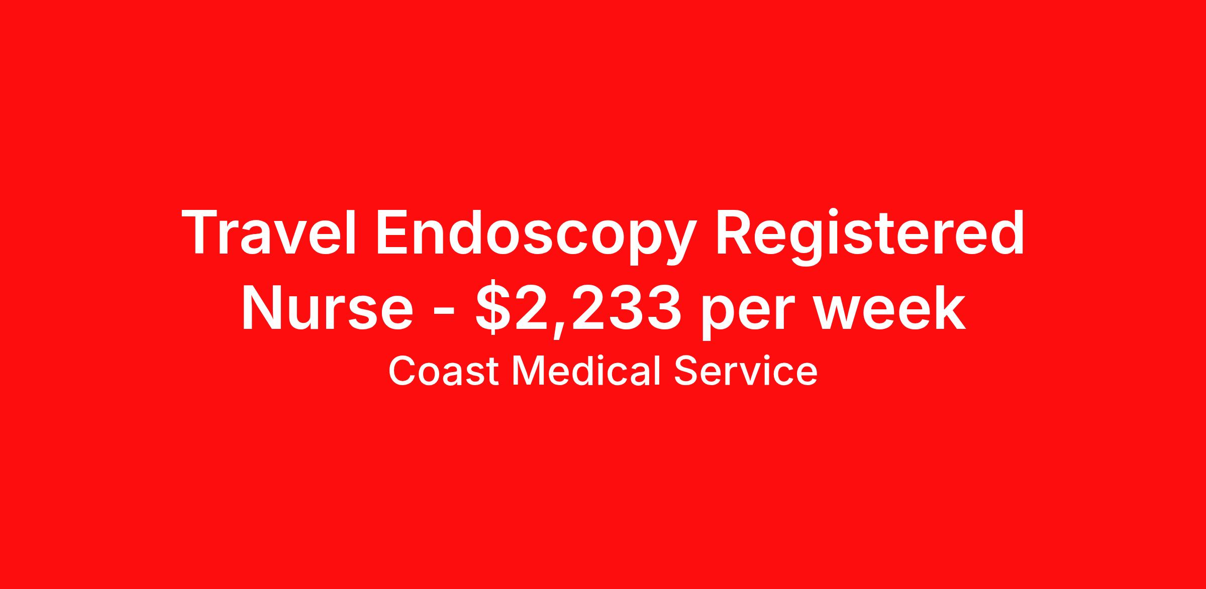 Coast Medical Service is seeking a travel nurse RN Endoscopy for a travel nursing job in Madison, Wisconsin. Job Description & Requirements Specialty: Endoscopy Discipline: RN Start Date: 04/20/2026 Duration: 13 weeks 40 hours per week Shift: 8 hours, days Employment Type: Travel Coast Medical Service is a nationwide travel nursing & allied healthcare staffing agency dedicated to providing an elite traveler experience for the experienced or first-time traveler. Coast is featured on Blue Pipes' 2023 Best Travel Agencies and named a 2022 Top Rated Healthcare Staffing Firm & 2023 First Half Top Rated Healthcare Staffing Firm by Great Recruiters. Please note that pay rate may differ for locally based candidates. Please apply here or contact a recruiter directly to learn more about this position & the facility, and/or explore others that may be of interest to you. We look forward to speaking with you! Coast Medical Services Job ID 36082576. Pay package is based on 8 hour shifts and 40.0 hours per week (subject to confirmation) with tax-free stipend amount to be determined. Posted job title: RN:Endoscopy,07:00:00-15:30:00