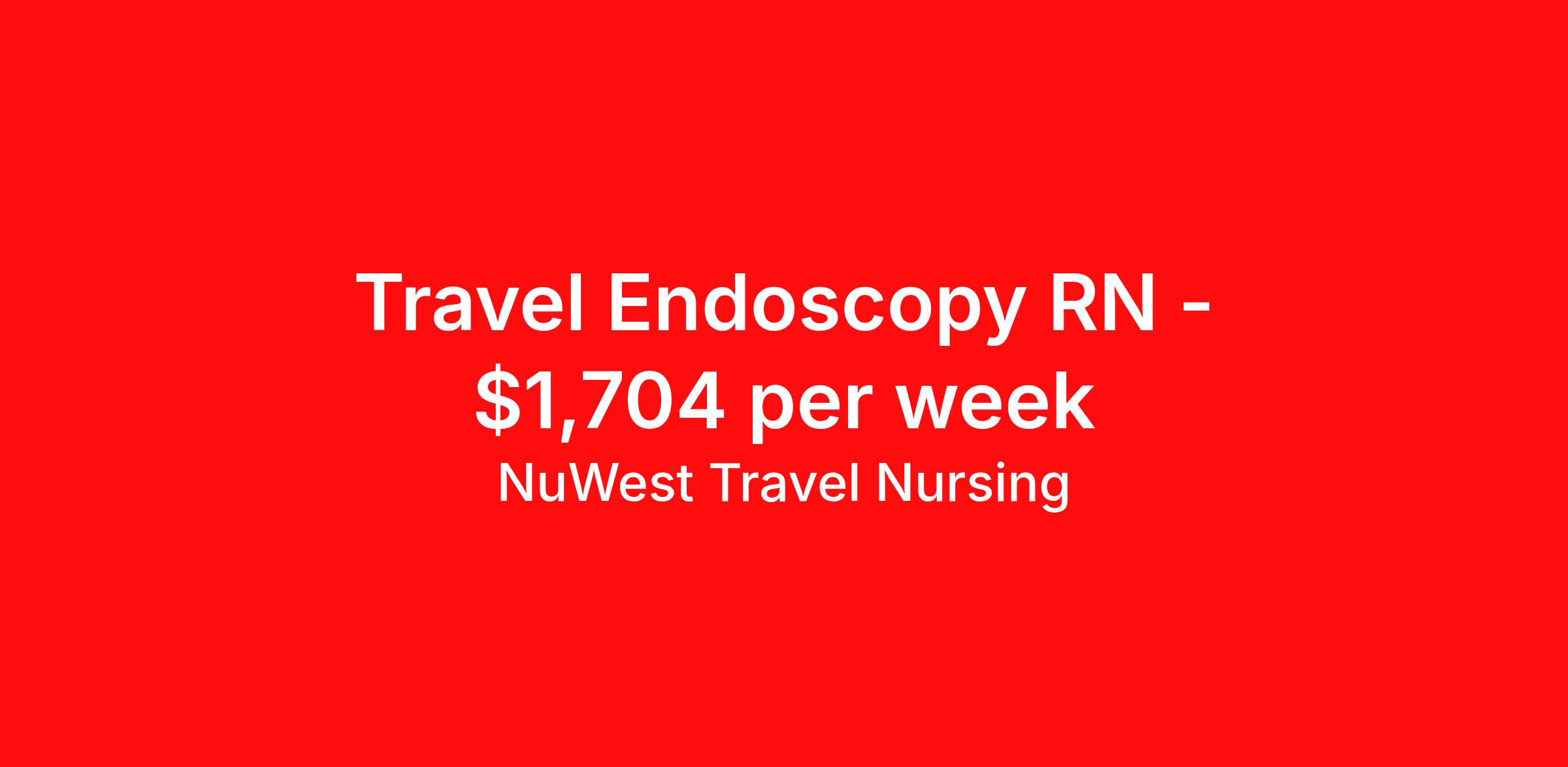 NuWest Travel Nursing is seeking a travel nurse RN Endoscopy for a travel nursing job in Anchorage, Alaska. Job Description & Requirements Specialty: Endoscopy Discipline: RN Duration: 13 weeks 36 hours per week Shift: 12 hours Employment Type: Travel We have a new assignment for RN - Endoscopy in Anchorage, AK and are interviewing ASAP. This is a travel assignment, 4x10 Days position at a great facility. Pay Range: $1565.86 - $1842.18 Per Week Benefits include medical, dental, vision, 401K, weekly direct deposit, and more! NuWest Travel Nursing Job ID 237457. Pay package is based on 12 hour shifts and 36 hours per week (subject to confirmation) with tax-free stipend amount to be determined.