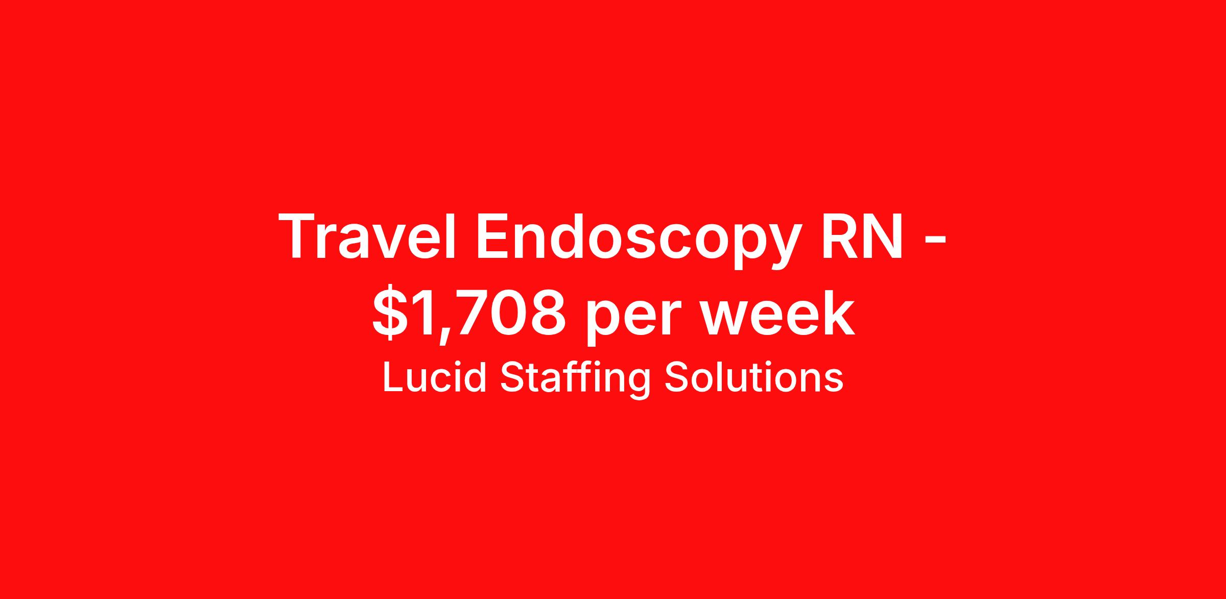 Lucid Staffing Solutions is seeking a travel nurse RN Endoscopy for a travel nursing job in Willoughby, Ohio. Job Description & Requirements Specialty: Endoscopy Discipline: RN Duration: 13 weeks 40 hours per week Shift: 8 hours, days Employment Type: Travel Job Description Position: Travel Registered Nurse (RN) with experience in Endoscopy Location: Willoughby, Ohio Shift: 10hr Day Weekly Gross: $1708.47 Lucid Staffing Solutions was created by former healthcare workers who lived the short staffing, the chaotic workflows, and the nonstop pressure that comes with patient care. We built an agency powered by real clinical experience, kept simple and supportive, so you never have to guess whether the people guiding you actually know what they’re talking about. Minimum Requirements: Active license as a Registered Nurse (RN) Licensed in Ohio (If applicable) or compact eligible Two years of recent Endoscopy experience Active BLS Why Lucid Works for Travelers Paid Weekly: Stipends pushed to GSA limits whenever possible $500 Travel Reimbursement: Paid at the start of each assignment Clinician-Led Team: Recruiters and Account Managers with real clinical experience In-House Compliance: fast updates, real communication, and none of the delays that come with outsourced vendors. Health Coverage Options: Multiple medical plans plus dental, vision, and workers compensation 401(k) Match: 4 percent match after 6 months License & Certification Reimbursement: We help cover the cost of staying compliant Liability Insurance: Included automatically Referral Bonuses: $500 per referral, $750 after five referrals Ready to start your journey? Apply today to connect with a Clinician-Recruiter! Lucid Staffing Solutions Job ID 35830. Pay package is based on 8 hour shifts and 40 hours per week (subject to confirmation) with tax-free stipend amount to be determined. Posted job title: Endoscopy About Lucid Staffing Solutions Clinician Owned & Operated At Lucid Staffing Solutions, we do things differently—because we’ve been in your shoes. Founded by actual healthcare professionals, Lucid was built to fix the issues we experienced as travelers. We know what makes a great assignment: competitive pay, seamless onboarding, honest recruiters, and most importantly—working with a team that truly sees and supports you. Our entire team is made up of former clinicians who understand the demands of the job and what travelers truly need to succeed. We offer some of the highest paying allied health and nursing contracts across the country, along with some amazing benefits & perks. Whether you're chasing freedom, flexible schedules, bigger paychecks, or your next adventure, Lucid helps you get there—with real support, real respect , and real healthcare experts. Benefits Dental benefits Medical benefits Vision benefits