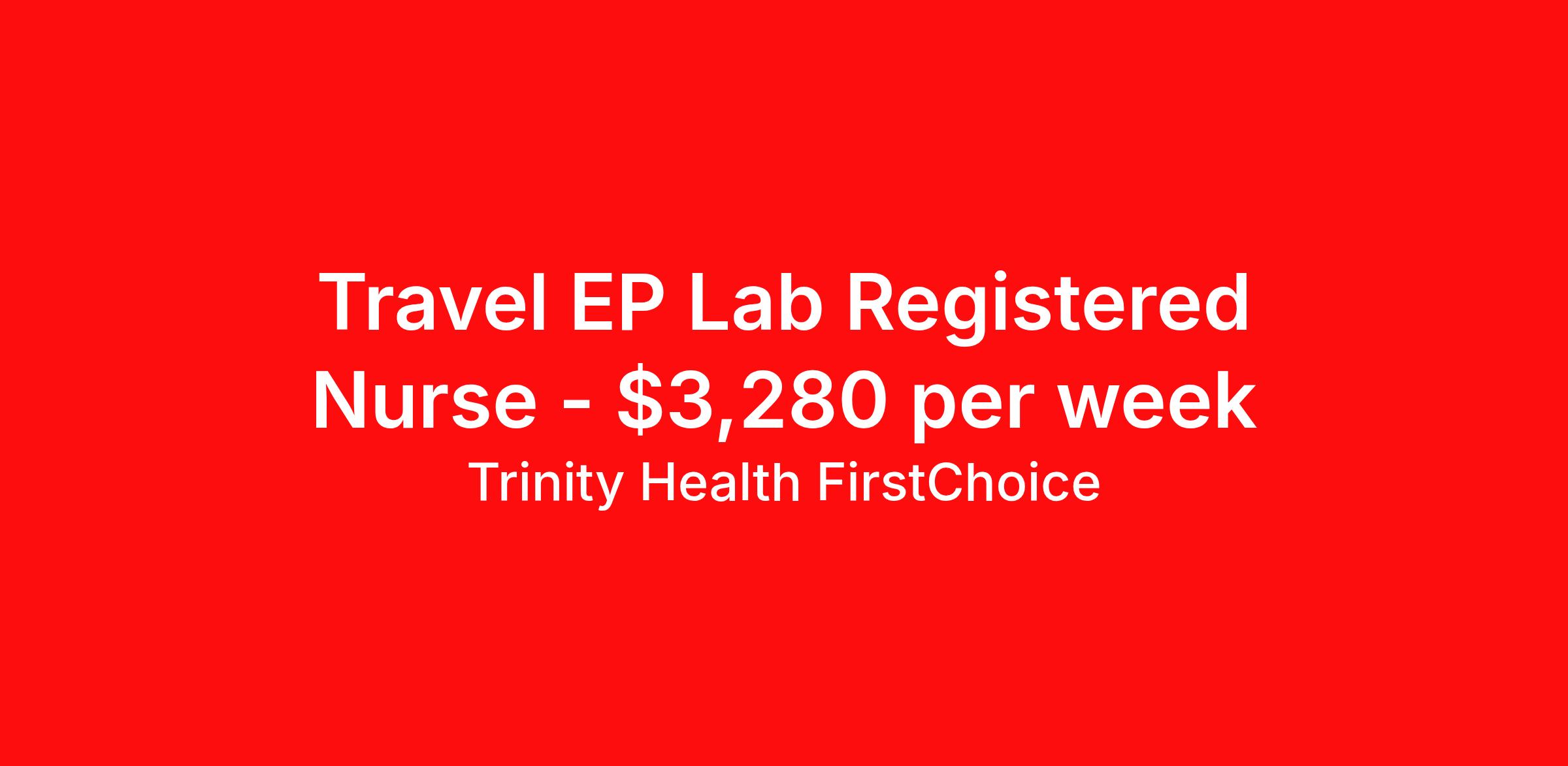 Trinity Health FirstChoice is seeking a travel nurse RN Electrophysiology Lab for a travel nursing job in Syracuse, New York. Job Description & Requirements Specialty: Electrophysiology Lab Discipline: RN Start Date: ASAP Duration: 13 weeks 48 hours per week Shift: 12 hours, days Employment Type: Travel Employment Type: Part time Shift: Description: Travel Registered Nurse, RN, EP Lab Position Purpose: Are you an experienced Registered Nurse looking for premium compensation and maximum flexibility? Explore FirstChoice – Trinity Health's mobile staffing solution! FirstChoice RNs are utilized to fill short and long-term assignments throughout the health system, and we need you to be a part of this innovative program! Nationwide and Regional opportunities available! What you will do: Qualified and willing to float throughout the hospital and/or throughout multiple hospital locations and/or regions Knows, understands, incorporates & demonstrates standard elements of professional practice: Assess, Outcomes Identification / Solutions, Plan, Implement, Evaluate Acts independently & appropriately within license, scope of knowledge & experience in practice area Retains accountability for delegation, choices, decisions & outcomes Collaborates with key stakeholders & contributes to quality & improvement practices & outcomes Exhibits agility & willingness to take on new & additional responsibilities Embraces new ideas & cultural differences while managing competing priorities Minimum Qualifications: Graduation from an accredited school of nursing. Valid RN licensure authorized in the applicable state(s) of practice/employment. Minimum of eighteen (18) months of recent clinical experience for Med Surg, Tele and PCU. Minimum two (2) years of recent clinical experience for all remaining specialties including Critical Care, Surgical Services, Maternal Services, Emergency Department and Behavioral Health. Required to have and maintain the credentials required per their specialty area (ex: ACLS, TNCC, etc). BLS, ACLS and PALS must be obtained through American Heart Association Position Highlights and Benefits: Premium Pay Flexible Scheduling Travel and Per Diem opportunities available Variety of Practice Settings Learning Opportunities DailyPay available Reimbursement of License and Certifications available per assignment Opportunity to participate in 403B program Ministry Information: FirstChoice offers rewarding Nursing, Respiratory Therapist, Surgical Technologist, and Health Care Professional travel positions with a flexible schedule to fit your life. FirstChoice travel Health Care Professionals fill critical positions when unforeseen or unplanned circumstances occur; or, when there is a position open due to an extended leave-of-absence. You’ll get to experience a variety of practice settings while traveling within your local region or traveling nationally – your choice! Pay Range: $52.00 ( not including applicable differentials and travel stipend) . Pay is based on experience, skills, and education. Exempt positions under the Fair Labor Standards Act (FLSA) will be paid within the base salary equivalent of the stated hourly rates. The pay range may also vary within the stated range based on location. For more information, Text "Choice" to 60184 Job Details: Location: St. Joseph's Hospital Health Center Start Date: ASAP Weeks: 13 Hours: 4x12 Shift: Days Gross Weekly Rate: $3280.00 Our Commitment Rooted in our Mission and Core Values, we honor the dignity of every person and recognize the unique perspectives, experiences, and talents each colleague brings. By finding common ground and embracing our differences, we grow stronger together and deliver more compassionate, person-centered care. We are an Equal Opportunity Employer. All qualified applicants will receive consideration for employment without regard to race, color, religion, sex, sexual orientation, gender identity, national origin, disability, veteran status, or any other status protected by federal, state, or local law. Trinity Health FirstChoice Job ID 00626559. Pay package is based on 12 hour shifts and 48 hours per week (subject to confirmation) with tax-free stipend amount to be determined. Posted job title: Travel RN, Registered Nurse, EP Lab About Trinity Health FirstChoice Premium pay FirstChoice offers a rewarding career with significant p remium pay and flexible scheduling to fit your life. FirstChoice h ealthcare travel professionals fill critical positions when unforeseen or unplanned circumstances occur; or, when there is a position open due to an extended leave-of-absence. You’ll get to experience a variety of practice settings while traveling within your local region or traveling nationally – your choice! Healthcare travel professionals, join us in caring for our community, we can't do it without you. FirstChoice exclusively supports facilities within the Trinity Health system meaning you will have a consistent experience between job sites. Your training at one site will apply to other sites within the region and will minimize the time you are spending outside of patient care. We understand that there has been a fundamental shift in the nursing position in recent years and like any other employee, nurses want more options and flexibility in their careers. FirstChoice provides you with both along with the comfort and security of one employer. Benefits of Being a FirstChoice healthcare travel professional: Premium pay Choose your own travel adventure—work in a variety of practice settings Wide range of assignments available Housing and meal stipend Minimum Qualifications/Requirements of a FirstChoice Nurse: Registered nurse with a license in the state(s) you will work Minimum of 2 years, depending on specialty area Cannot hold a concurrent position at a Trinity Health facility Trinity Health is a leading not-for-profit Catholic health system with 92 hospitals and hundreds of primary, specialty and continuing care cente