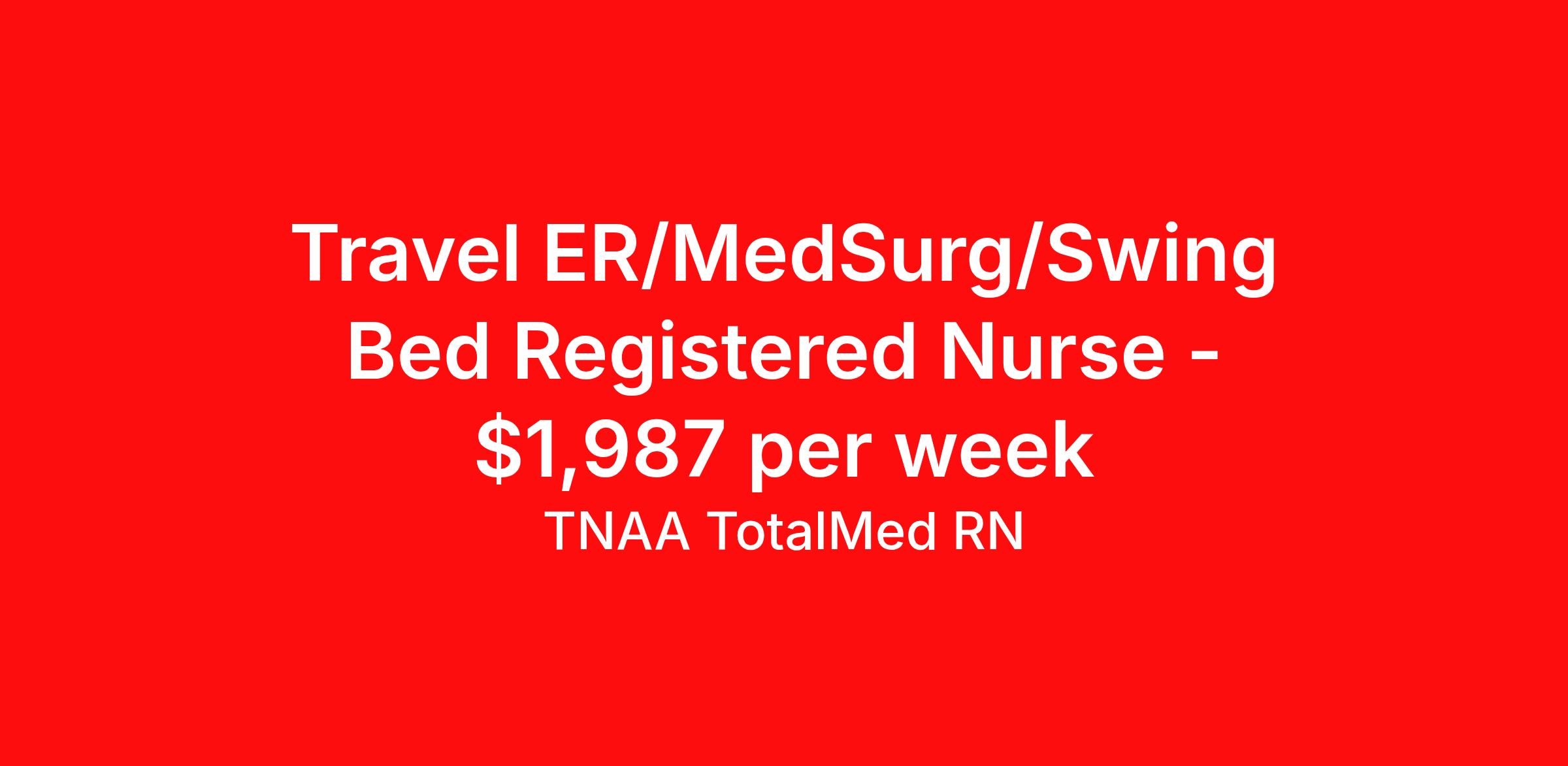 TNAA TotalMed RN is seeking a travel nurse RN ED - Emergency Department Med Surg for a travel nursing job in Turtle Lake, North Dakota. Job Description & Requirements Specialty: ED - Emergency Department Discipline: RN Start Date: 03/30/2026 Duration: 13 weeks 36 hours per week Shift: 12 hours, nights Employment Type: Travel We're looking for Emergency Room RNs for an immediate travel nurse opening in Turtle Lake, ND. The right RN should have 1-2 years recent acute care experience. Read below for more requirements. As an ER Travel Nurse, you will work with a diverse team of caregivers to appropriately evaluate, triage and implement care using correct procedures and physician instructions. RNs should have experience and skill caring for patients in a fast-paced, urgent and emergency environment. Emergency Room RNs will perform minor medical operations, advise patients and family on illnesses or injuries, and plan long-term care needs. Other responsibilities as an ER Travel Nurse include documenting medical history, checking for any allergies patients might have, obtaining patient vital signs, and monitoring patients' emotional and physical well-being. As an ER Travel Nurse, you should be prepared to perform the following tasks: Provide basic bedside care. Clean and bandage wounds. Provide IV therapy. Maintain supplies and medical equipment. Report suspected abuse to appropriate agencies. ER Travel Nurses should be able to stand and walk for long periods of time, as well as bend, lean and stoop without difficulty. RNs should be able to easily lift 20 pounds. Moving or lifting of patients may require lifting of up to 50 pounds at times. Because of the fast-paced environment, Emergency Room RNs must possess good skills for coping with stress and be able to relate to people of all ages and backgrounds. Requirements*: ACLS, BLS, PALS, TNCC, 2 Years * Additional certifications may be required before beginning an assignment. TotalMed Travel Job ID 1383895. Pay package is based on 12 hour shifts and 36 hours per week (subject to confirmation) with tax-free stipend amount to be determined. Posted job title: Emergency Room - ER RN - Travel Nurse About TNAA TotalMed RN TotalMed is a Top Ten, travel nursing and healthcare staffing agency with the mission of igniting purpose in healthcare. The organization staffs nurses, therapists, pharmacists, and other clinicians of all specialties in all 50 states. They offer local and travel jobs and match caregivers with the right organization to assist both facilities and patients. As an organization, they focus on putting highly-skilled staff into facilities to ensure adequate staffing for a better patient experience. TotalMed specializes in recruiting and placing healthcare professionals in travel, PRN, and permanent positions across the country in Nursing and Allied Health. Throughout 2020, the organization filled roles at even the most short-staffed facilities during the most challenging time in healthcare. By matching the right travel healthcare professional with the right organization, TotalMed continues to offer a lifeline to facilities and their patients. Benefits Weekly pay Guaranteed Hours Continuing Education 401k retirement plan Sick pay Wellness and fitness programs Referral bonus Employee assistance programs Medical benefits Dental benefits Vision benefits Benefits start day 1