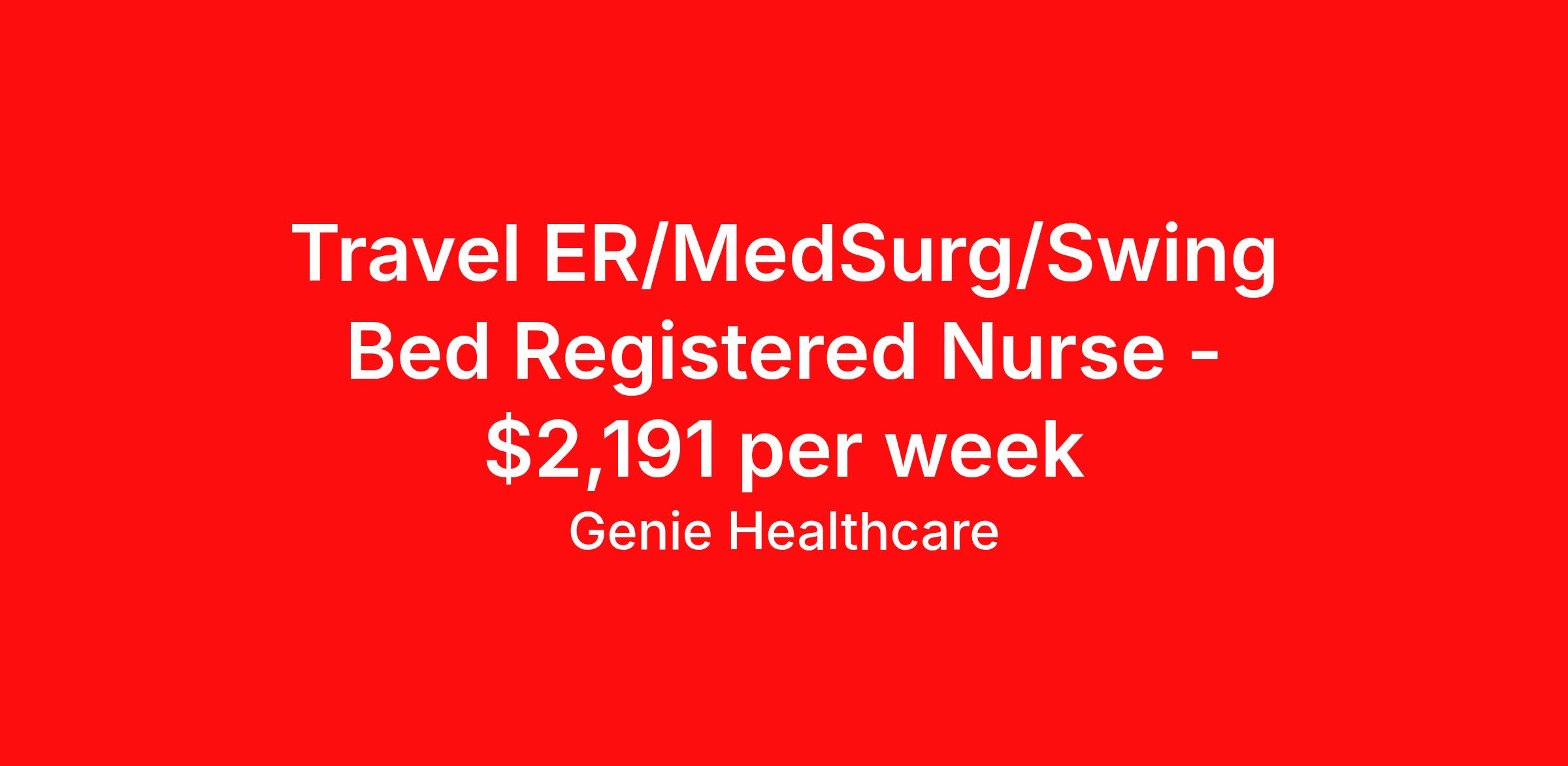 Genie Healthcare is seeking a travel nurse RN ED - Emergency Department Med Surg for a travel nursing job in Turtle Lake, North Dakota. Job Description & Requirements Specialty: ED - Emergency Department Discipline: RN Start Date: 03/30/2026 Duration: 13 weeks 36 hours per week Shift: 12 hours, nights Employment Type: Travel Genie Healthcare is looking for a RN to work in Emergency Room (ER) for a 13 weeks travel assignment located in Turtle Lake, ND for the Shift (3x12 nights, 19:00:00-07:00:00, 12.00-3). Pay and benefits packages are estimated based on client bill rate at time the job was posted. These rates are subject to change. Exact pay and benefits vary based on several things, including, but not limited to, guaranteed hours, client changes in bill rate, experience, etc. Benefits: Medical Insurance, Dental Insurance, Vision Insurance, 401(k) with company matching (50% up to 6% of what you contribute) Genie Healthcare Job ID 17944532. Pay package is based on 12 hour shifts and 36.0 hours per week (subject to confirmation) with tax-free stipend amount to be determined. Posted job title: RN:Emergency Room (ER),19:00:00-07:00:00 About Genie Healthcare Genie Healthcare is one of the fastest growing Nurse Travel Agencies in the USA. Genie serves hundreds of facilities and has over 4000 current travel RN contracts open at any given time. Genie provides travel RN’s flexibility, support, top pay scale, housing and the 1 rated, multi-state health insurance coverage. Genie Healthcare carries with it a commitment to providing a comprehensive level of service and quality care. Growing from a small team of eager recruiters to a company with satisfied clients in nearly every corner of the nation, delivering excellence in patient and customer care is the key to Genie’s success. The management team has 20 years of experience in workforce solutions and staffing in medical and non-medical fields, roles ranging from Clerical job to Cardiologist to software developer to CEO.