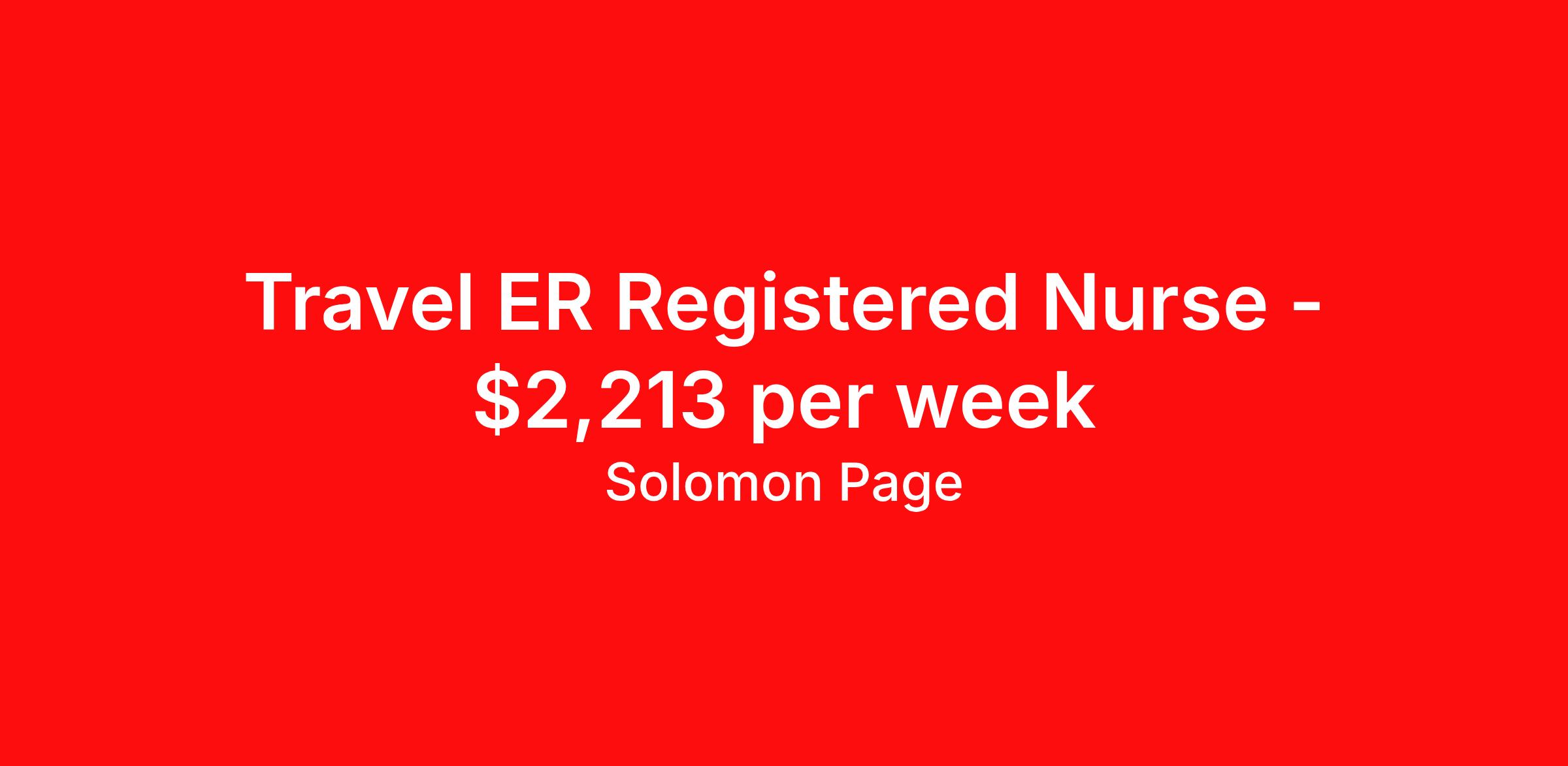Solomon Page is seeking a travel nurse RN ED - Emergency Department for a travel nursing job in Show Low, Arizona. Job Description & Requirements Specialty: ED - Emergency Department Discipline: RN Start Date: 04/13/2026 Duration: 13 weeks 36 hours per week Shift: 12 hours, evenings Employment Type: Travel Our client is looking to add a Registered Nurse to their team. Job Details: Location: Show Low, Arizona Duration: 13 Weeks Start Date: 04/13/2026 Shift: 3x12 Eves Estimated Gross Weekly Pay: 2213 Qualifications: Current Arizona license Excellent interpersonal skills including patience, empathy, and compassion Effective communication skills, including active listening, writing, speaking and reading comprehension Fast and adaptive problem-solving abilities Ability to stand for long periods of time If you meet the required qualifications and are interested in this role, please apply today. Why Work with Us The success of Solomon Page is defined by our people. Offering a comprehensive benefits package, travel nurses have immediate access to medical coverage and ReviveHealth virtual care. Additionally, you are offered access to dental and vision coverage, commuter benefits, a 401(k) plan, flexible spending, referral bonuses, ongoing training, and more. As an ESOP company, Solomon Page offers an employee stock ownership plan to all consultants. As a member of our traveler community, you will join a nurturing culture that fosters your career goals. Solomon Page can connect you with your next opportunity – whether it is in your hometown, or you are looking to travel to a new destination. About Solomon Page Healthcare & Medical Staffing Accredited by the Joint Commission with the Gold Seal of Approval, Solomon Page prides ourselves in developing long-term relationships with healthcare providers based on trust and respect. Our experienced Healthcare and Medical Staffing experts are committed to providing safe and quality patient care through our wide network of travel nurses, locum tenens, and allied resources. For more information and additional healthcare opportunities, visit: solomonpage.com and connect with Solomon Page on Instagram, Facebook, Twitter, LinkedIn, and TikTok. 431295 Solomon Page Job ID 433447. Pay package is based on 12 hour shifts and 36 hours per week (subject to confirmation) with tax-free stipend amount to be determined. Posted job title: rn - emergency medicine | show low, arizona About Solomon Page Founded in 1990, Solomon Page has grown to be a leader in the staffing industry. As a member of our healthcare provider community, you will join a nurturing culture that fosters your career goals. We have the network and resources to connect you with your next opportunity – whether it is in your hometown, or you are looking to travel to a new destination. Accredited by the Joint Commission with the Gold Seal of Approval, Solomon Page prides itself in developing long-term relationships with healthcare providers based on trust and respect. Headquartered in New York with offices throughout the United States our experienced healthcare and medical staffing experts are committed to providing safe and quality patient care through our wide network of travel nurses, locum tenens, and allied resources. For more information and additional healthcare opportunities, visit: solomonpage.com /healthcare and connect with us on Facebook , Twitter , Instagram , Tik Tok , and LinkedIn. ReviveHealth Virtual Care: Available immediately. Receive free, 100% company paid, virtual care access. Upon commencement of your employment, Solomon Page offers automatic enrollment into ReviveHealth, which offers concierge, membership-based access to virtual primary care, urgent care, mental health therapy, a vision program, and prescription medications. Medical Coverage : Available immediately . Whether you are looking to enroll in single or family insurance, you have immediate access to quality coverage. Dental Coverage : Available the 1st of the month after your hire date . We offer dental insurance to you and your dependents. Vision Coverage : Available the 1st of the month after your hire date . We offer vision insurance to you and your dependents. Commuter Benefits: Available the 1st of the month after your hire date . Set aside pre-tax money to pay for public transportation. 401K Plan: Associates can enroll in the 401K plan after they have worked 1000 hours. ESOP Benefits: As an ESOP company, Solomon Page offers an employee stock ownership plan. Referral Bonus: A cash bonus is offered for referring a candidate to Solomon Page who gets placed. Training & Support: Training programs and ongoing career coaching and support is offered to consultants. Benefits Medical benefits Dental benefits Vision benefits 401k retirement plan Referral bonus