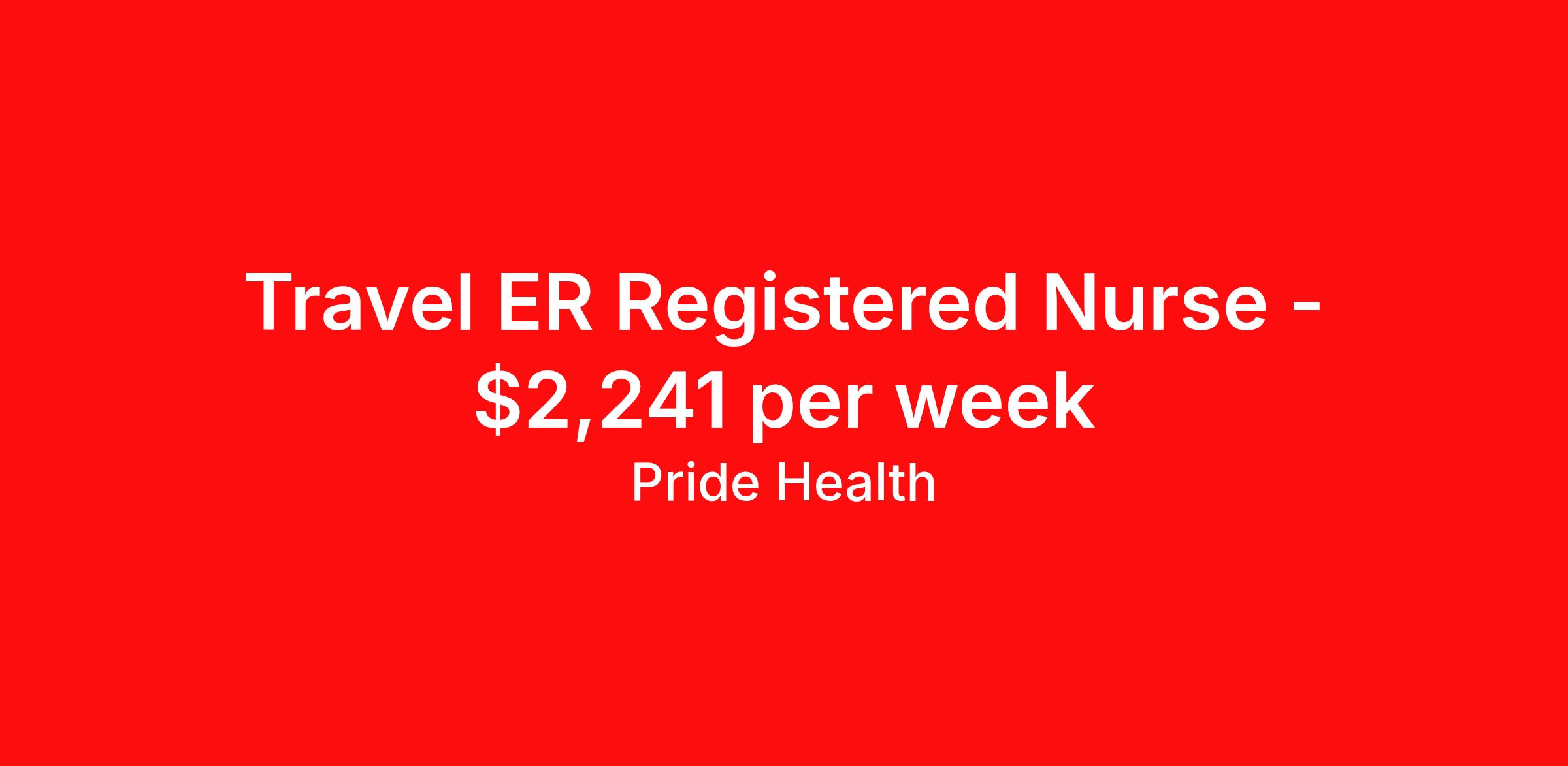 PRIDE Health is seeking a travel nurse RN ED - Emergency Department for a travel nursing job in Globe, Arizona. Job Description & Requirements Specialty: ED - Emergency Department Discipline: RN Start Date: 03/30/2026 Duration: 13 weeks 36 hours per week Shift: 12 hours, nights Employment Type: Travel Pride Health Job ID 17986369. Pay package is based on 12 hour shifts and 36.0 hours per week (subject to confirmation) with tax-free stipend amount to be determined. Posted job title: RN:ER,19:00:00-07:30:00 About PRIDE Health PRIDE Health is the minority-owned healthcare recruitment division of Pride Global—an integrated human capital solutions and advisory firm. With our robust and abundant travel nursing and allied health employment options across the U.S., PRIDE Health will allow you to help change the way the world lives and heals as it connects you with the industry’s leading healthcare organizations. Pride Global offers eligible employee’s comprehensive healthcare coverage (medical, dental, and vision plans), supplemental coverage (accident insurance, critical illness insurance and hospital indemnity), 401(k)-retirement savings, life & disability insurance, an employee assistance program, legal support, auto, home insurance, pet insurance, and employee discounts with preferred vendors. Benefits Weekly pay Holiday Pay Guaranteed Hours 401k retirement plan Cancelation protection Referral bonus Medical benefits Dental benefits Vision benefits