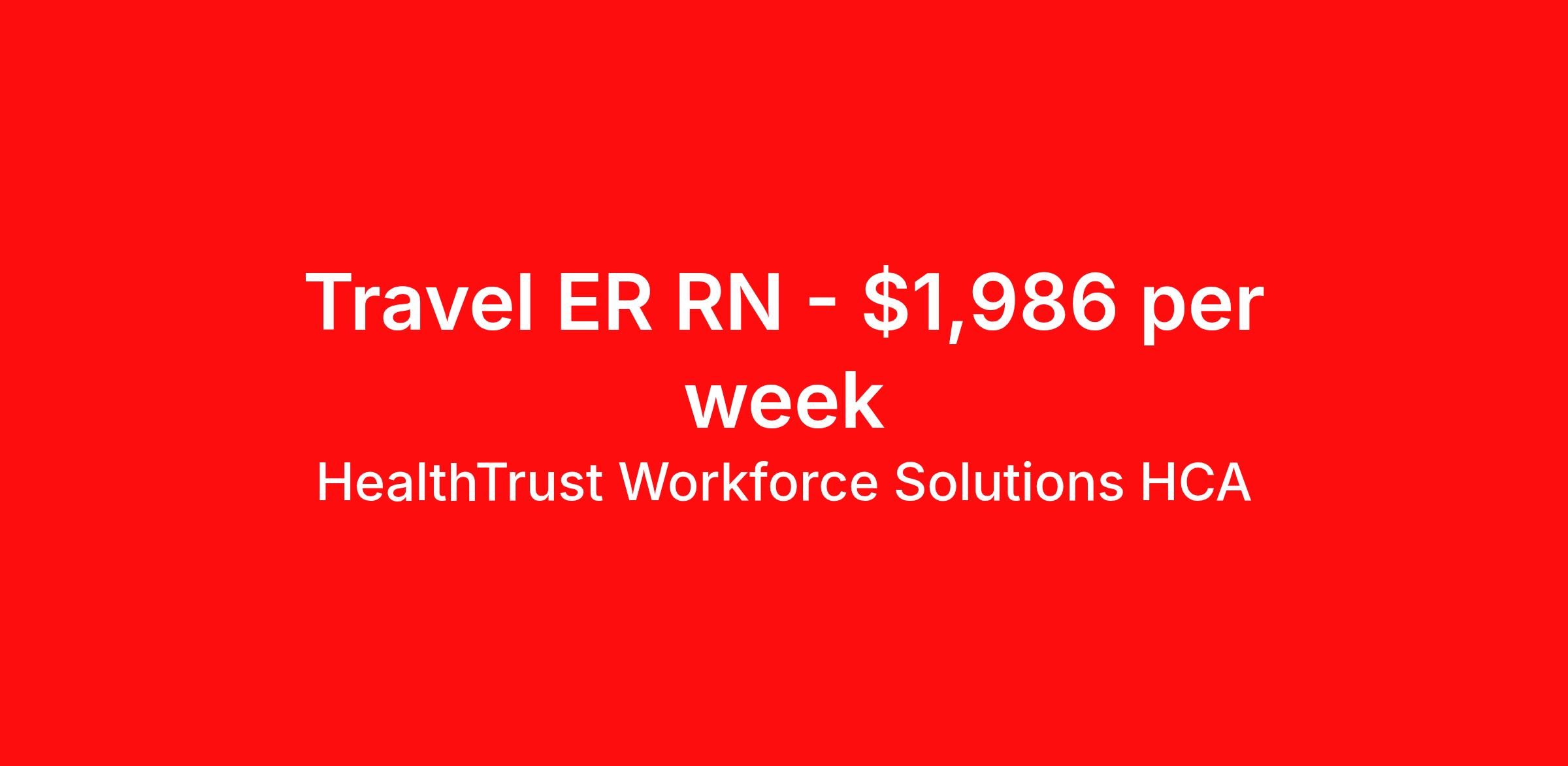 HealthTrust Workforce Solutions HCA is seeking a travel nurse RN ED - Emergency Department for a travel nursing job in Asheville, North Carolina. Job Description & Requirements Specialty: ED - Emergency Department Discipline: RN Start Date: 03/30/2026 Duration: 13 weeks 36 hours per week Shift: 12 hours, days Employment Type: Travel Entrust Your Career to HealthTrust! At HealthTrust, we believe that healthcare is not defined by the four walls in which it is practiced; it’s defined by its people. We pride ourselves on crafting opportunities that expand skill sets, broaden career horizons, provide economic stability, and cultivate personal growth. HealthTrust Offers: Competitive Pay Packages Guaranteed hours Weekly direct deposit options 401k with Company Match Earn up to $750 for referrals Free Private Furnished Housing or Tax-Free Subsidy To get started, you will need: RN's a minimum of 1 year in specialty Allied 6 months of experience An adventurous spirit and fierce dedication Degree in corresponding specialty as required Appropriate certifications and licensure as needed for the specific position HealthTrust Benefits: Opportunities for a lifetime: When you become a part of the HCA family, you will have exclusive access to more opportunities than any other healthcare system in the nation. At HWS, we help open the door to a lifetime of lasting career opportunities. A culture of care: Our clinicians have made HWS an industry leader for over 25 years. We are passionate about our mission that, above all else, we are committed to the care and improvement of human life. Career Development: As a wholly owned subsidiary of HCA Healthcare, HWS is a preferred partner to thousands of top-performing hospitals. We provide our healthcare professionals with first-priority access to more than 200,000 jobs nationwide. We are uniquely positioned to offer you exclusive and direct access to HCA Healthcare’s vast network of facilities. Let us open the door to nationwide opportunities that fit your lifestyle! We are an equal opportunity employer and value diversity at our company. We do not discriminate on the basis of race, religion, color, national origin, gender, sexual orientation, age, marital status, veteran status, or disability status. Job Requirements Certifications CPI (Required) NIHSS (Required) BLS (Required) ACLS (Required) PALS (Required) HealthTrust Workforce Solutions HCA Job ID 991883. Posted job title: Travel Nurse - Emergency Room About HealthTrust Workforce Solutions HCA At HealthTrust Workforce Solutions, healthcare is not just about the four walls of a facility but about the people who provide and receive care. Our focus is on empowering healthcare professionals to deliver exceptional patient experiences by providing them with the necessary skills, tools, and support. We partner with healthcare facilities nationwide to ensure that the right professionals are in the right roles. We prioritize our clinicians by giving them a voice and access to opportunities to fulfill their mission of improving lives by providing quality patient care. We are committed to our core values of Trust, Innovation, Adaptability, Courage, and Accountability. We are dedicated to positively impacting the healthcare industry by providing first-priority access to more than 200,000 jobs nationwide to our healthcare professionals. Join us and be part of the HealthTrust family, where you can make a difference every day. We embrace our changing environment, and we maintain a culture that has a rich tradition of transforming itself to meet the challenges of the future. MISSION STATEMENT While putting great people in the right roles is essential, our mission is far greater. We want our clinicians to be part of the HealthTrust family, where healthcare professionals have a voice and are empowered with the right tools and opportunities to fulfill their personal mission of improving lives. Plus, as a preferred partner to thousands of top-performing hospitals, we provide our healthcare professionals with first-priority access to more than 200,000 jobs nationwide. Benefits Dental benefits Vision benefits Referral bonus Continuing Education Life insurance