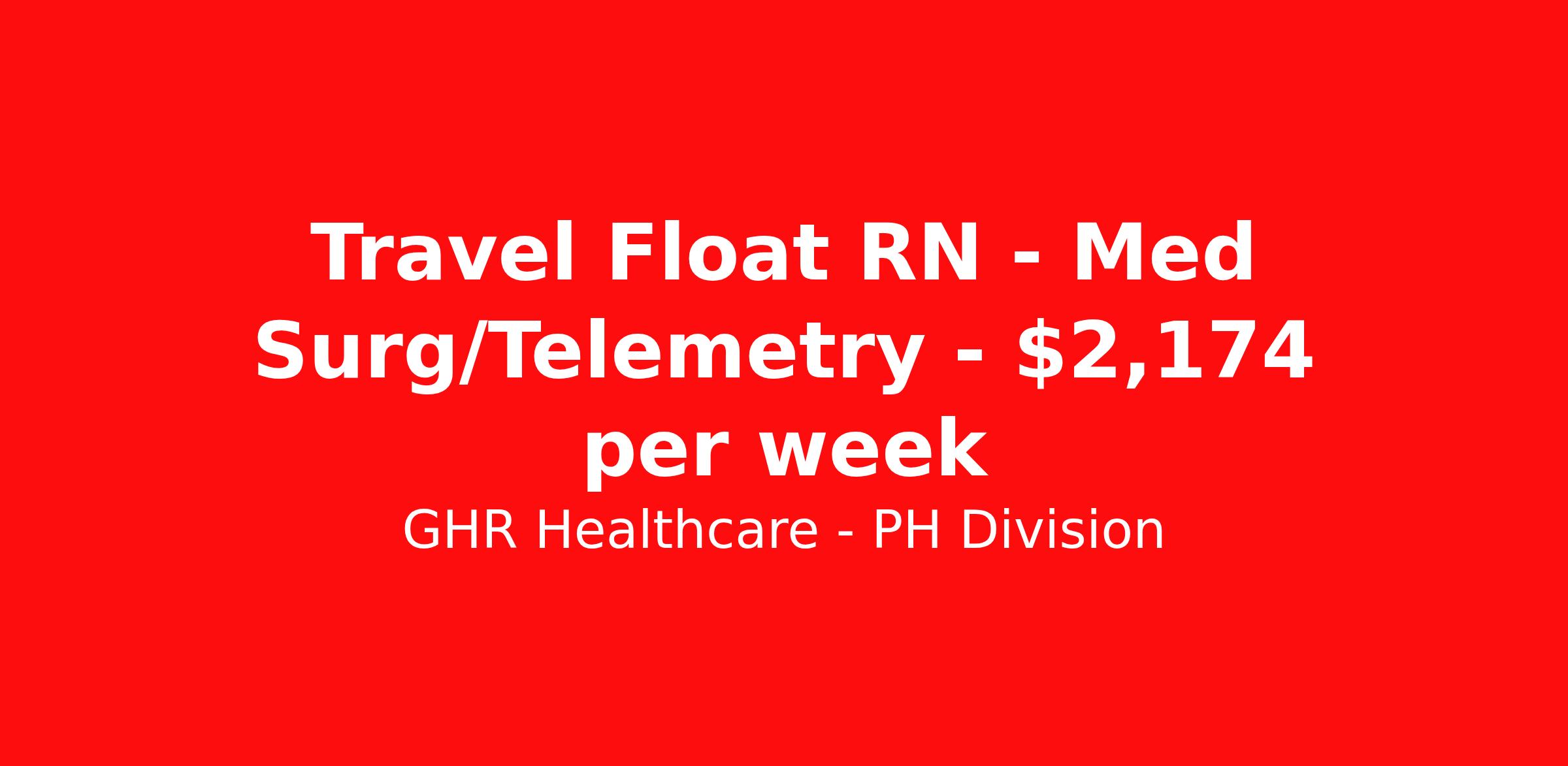 GHR Healthcare - PH Division is seeking a travel nurse RN Float Med Surg / Telemetry for a travel nursing job in Watertown, New York. Job Description & Requirements Specialty: Med Surg / Telemetry Discipline: RN Start Date: 04/13/2026 Duration: 12 weeks 36 hours per week Shift: 12 hours Employment Type: Travel Planet Healthcare Job ID 76073718. Pay package is based on 12 hour shifts and 36 hours per week (subject to confirmation) with tax-free stipend amount to be determined. About GHR Healthcare - PH Division For over 30 years, GHR Healthcare has been the bridge between healthcare professionals and the facilities that need them nationwide. We're committed to uncovering your ideal fit, supported by GHR's dedication to competitive compensation, transparent communication, and a devoted team that genuinely cares about your career journey. You can trust us to stand by your side as your advocate, confidante, and partner in advancing your career. At GHR, care and consideration are at the heart of everything we do. Visit ghrhealthcare.com to learn more.