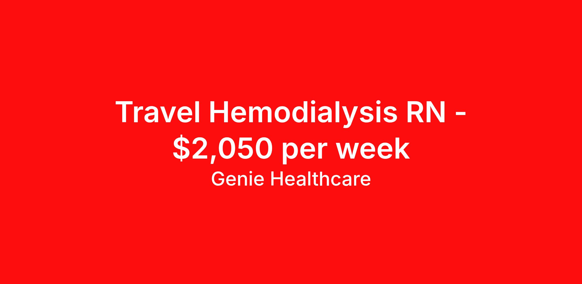 Genie Healthcare is seeking a travel nurse RN Dialysis for a travel nursing job in Denville, New Jersey. Job Description & Requirements Specialty: Dialysis Discipline: RN Start Date: 04/06/2026 Duration: 13 weeks 36 hours per week Shift: 12 hours, days Employment Type: Travel Genie Healthcare is looking for a RN to work in Dialysis for a 12.86 weeks travel assignment located in Denville, NJ for the Shift (3x12hr days, 07:00:00-19:00:00, 12.00-3). Pay and benefits packages are estimated based on client bill rate at time the job was posted. These rates are subject to change. Exact pay and benefits vary based on several things, including, but not limited to, guaranteed hours, client changes in bill rate, experience, etc. Benefits: Medical Insurance, Dental Insurance, Vision Insurance, 401(k) with company matching (50% up to 6% of what you contribute) Genie Healthcare Job ID 17985887. Pay package is based on 12 hour shifts and 36.0 hours per week (subject to confirmation) with tax-free stipend amount to be determined. Posted job title: RN:Dialysis,07:00:00-19:00:00 About Genie Healthcare Genie Healthcare is one of the fastest growing Nurse Travel Agencies in the USA. Genie serves hundreds of facilities and has over 4000 current travel RN contracts open at any given time. Genie provides travel RN’s flexibility, support, top pay scale, housing and the 1 rated, multi-state health insurance coverage. Genie Healthcare carries with it a commitment to providing a comprehensive level of service and quality care. Growing from a small team of eager recruiters to a company with satisfied clients in nearly every corner of the nation, delivering excellence in patient and customer care is the key to Genie’s success. The management team has 20 years of experience in workforce solutions and staffing in medical and non-medical fields, roles ranging from Clerical job to Cardiologist to software developer to CEO.