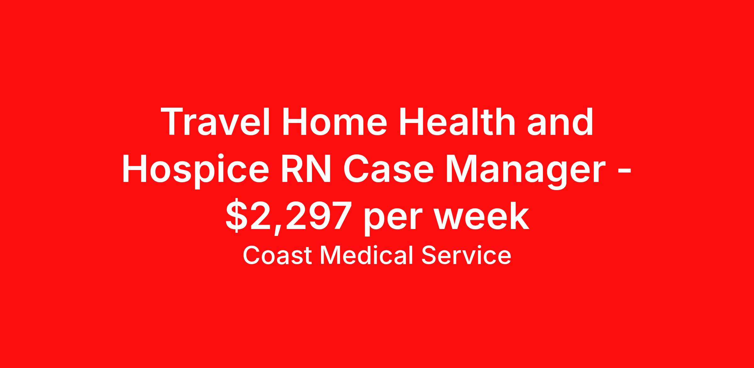 Coast Medical Service is seeking a travel nurse RN Home Health for a travel nursing job in Missoula, Montana. Job Description & Requirements Specialty: Home Health Discipline: RN Start Date: ASAP Duration: 13 weeks 40 hours per week Shift: 8 hours, days Employment Type: Travel Coast Medical Service is a nationwide travel nursing & allied healthcare staffing agency dedicated to providing an elite traveler experience for the experienced or first-time traveler. Coast is featured on Blue Pipes' 2023 Best Travel Agencies and named a 2022 Top Rated Healthcare Staffing Firm & 2023 First Half Top Rated Healthcare Staffing Firm by Great Recruiters. Please note that pay rate may differ for locally based candidates. Please apply here or contact a recruiter directly to learn more about this position & the facility, and/or explore others that may be of interest to you. We look forward to speaking with you! Coast Medical Services Job ID 36158306. Pay package is based on 8 hour shifts and 40.0 hours per week (subject to confirmation) with tax-free stipend amount to be determined. Posted job title: RN:Home Health,07:00:00-15:30:00