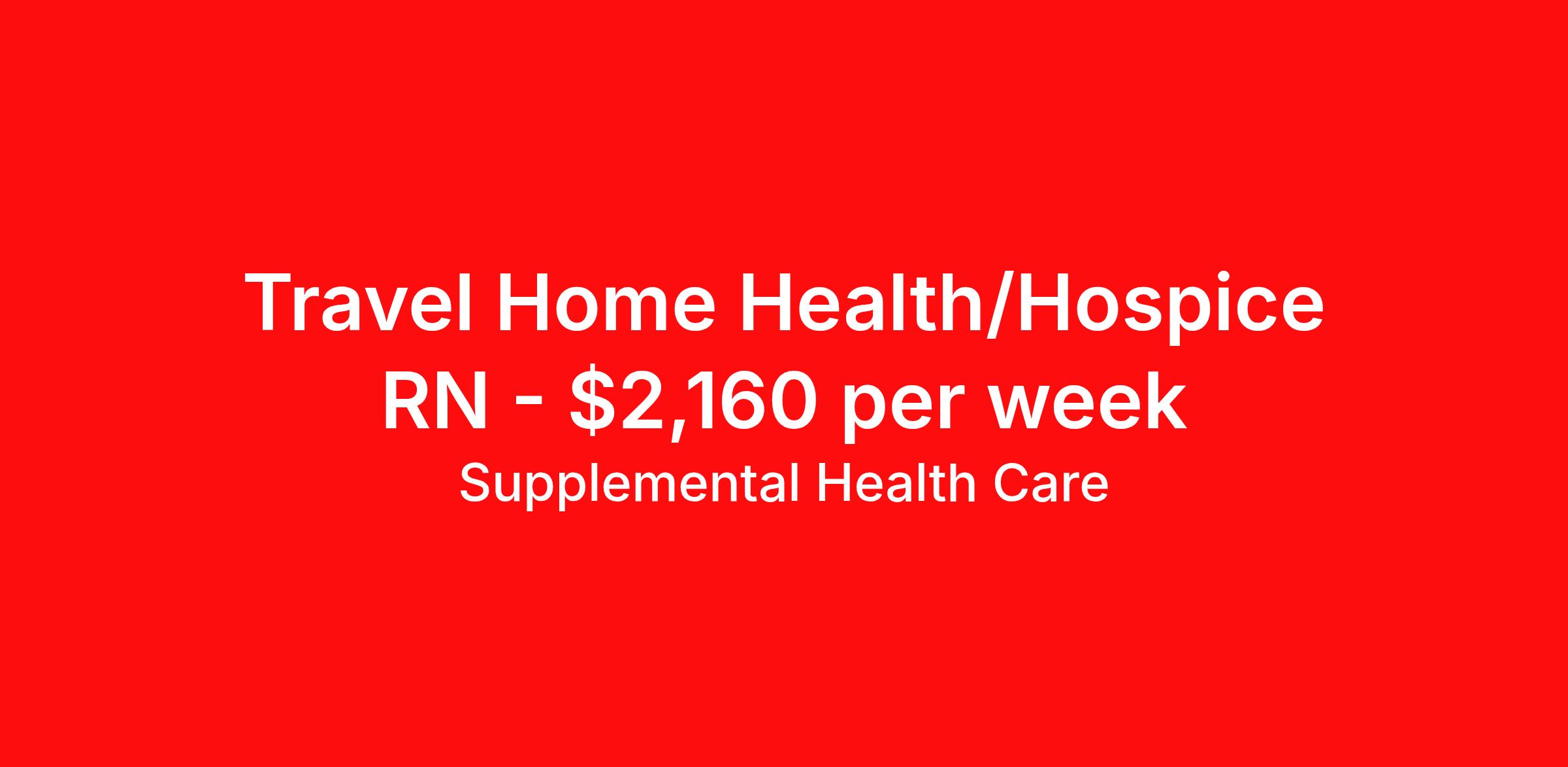 Supplemental Health Care is seeking a travel nurse RN Home Health for a travel nursing job in Kennesaw, Georgia. Job Description & Requirements Specialty: Home Health Discipline: RN Start Date: ASAP Duration: 13 weeks 40 hours per week Shift: 8 hours, days Employment Type: Travel Job Description: Supplemental Health Care is hiring experienced RNs with recent Medicare-certified visits experience for home health contracts in Kennesaw, Georgia and the surrounding areas. Whether you’re looking to travel or stay local, we’re committed to helping Home Health Registered Nurses find the right fit with top healthcare facilities across the country. With more than 40 years of experience in healthcare staffing, Supplemental Health Care offers reliable support, competitive pay, and great benefits every step of the way. Qualifications: OASIS/Medicare Certified Visits Experience Electronic Charting experience Minimum of 1 year of recent home health nursing experience (private duty does not qualify) Current Georgia RN License American Heart Association BLS Valid U.S. Driver's License Home Health RN Contract Details: $1,960 - $2,160 per week* 13-week contract SHC Home Health Nurses are paid by the hour, not by the visit Nurse will have a designated territory of coverage Average weekly expectation is 30 units of productivity Home Health contracts with SHC require previous experience with OASIS/Medicare Certified Visits We know that at-home healthcare is a very different environment and requires specialized knowledge and support for our nurses to be successful. We offer the benefits, career guidance, and round-the-clock assistance that you want from your home health employment partner. That’s why over 80% of our working home health nurses say they would recommend us to a friend. Apply today to get started with this Home Health RN contract opportunity, or talk to our team about the full range of Registered Nurse opportunities available. What We Offer: Full medical, dental, vision, life, and even pet insurance! Round the clock support. No matter where you are or what time it is, Supplemental Health Care is standing by. SHC's Share the Care referral program is the most dynamic, profitable referral program in the industry. 401(k) Retirement Savings Program with a wide range of investment options. Discounted and free online access to CEU courses through Supplemental University. Please speak with a recruiter for details. Supplemental Health Care is an Equal Opportunity Employer. All candidates, including veterans and those with disabilities, are encouraged to apply. SHC will consider for employment qualified applicants with criminal histories in a manner consistent with the requirements of applicable local, state, or federal law. To learn more, visit www.shccares.com/eeo Supplemental Health Care Job ID 1468532. Pay package is based on 8 hour shifts and 40 hours per week (subject to confirmation) with tax-free stipend amount to be determined. Posted job title: Home Health RN About Supplemental Health Care At Supplemental Health Care, a simple belief in the power of caring guides a unique commitment to world-class service in healthcare staffing. For 40 years, we’ve supported talented professionals pursuing their life calling in hospitals, schools, home health, corrections, behavioral health, and other settings. At SHC, we inspire vital connections and enrich lives and inspire better outcomes. As recipients of the Best in Staffing Awards for both Client and Talent, Supplemental Health Care is proud to be among only 2% of staffing companies singled out for the distinction based on the real feedback of our employees and the clients we serve. SHC has also earned The Joint Commission’s Gold Seal of Approval and is named among the Largest Health Care Staffing companies in the United States by Staffing Industry Analysts. We are also thrilled to recognize our very own SLP, Dr. Kelly Byrd as the American Staffing Association 2024 National Staffing Employee of the Year and Health Care Sector All-Star. We’re honored to connect Dr. Byrd to employment, share her incredible story, and support her family literacy nonprofit. For everyone that we serve, SHC is the place where caring hearts thrive. Benefits Referral bonus Benefits start day 1 401k retirement plan Continuing Education Discount program Health savings account