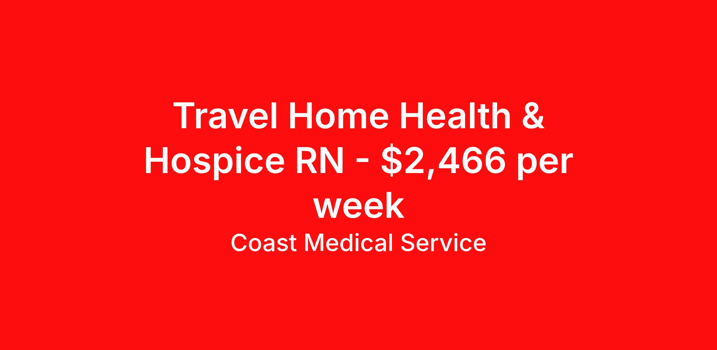 Coast Medical Service is seeking a travel nurse RN Home Health for a travel nursing job in Williston, North Dakota. Job Description & Requirements Specialty: Home Health Discipline: RN Start Date: 04/06/2026 Duration: 13 weeks 40 hours per week Shift: 8 hours, days Employment Type: Travel Coast Medical Service is a nationwide travel nursing & allied healthcare staffing agency dedicated to providing an elite traveler experience for the experienced or first-time traveler. Coast is featured on Blue Pipes' 2023 Best Travel Agencies and named a 2022 Top Rated Healthcare Staffing Firm & 2023 First Half Top Rated Healthcare Staffing Firm by Great Recruiters. Please note that pay rate may differ for locally based candidates. Please apply here or contact a recruiter directly to learn more about this position & the facility, and/or explore others that may be of interest to you. We look forward to speaking with you! Coast Medical Services Job ID 35954241. Pay package is based on 8 hour shifts and 40.0 hours per week (subject to confirmation) with tax-free stipend amount to be determined. Posted job title: RN:Home Health,07:00:00-15:30:00