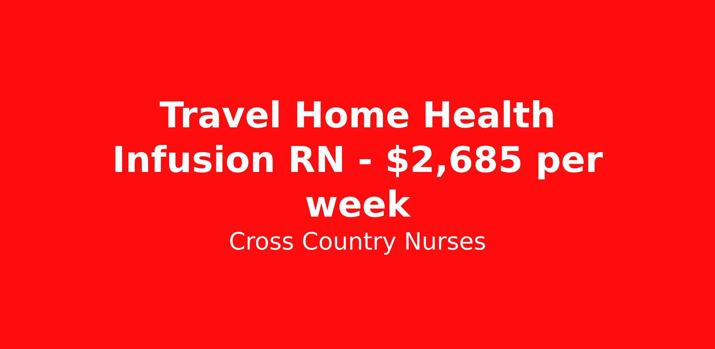 Cross Country Nurses is seeking a travel nurse RN Home Health for a travel nursing job in Beverly, Massachusetts. Job Description & Requirements Specialty: Home Health Discipline: RN Start Date: 04/06/2026 Duration: 13 weeks 40 hours per week Shift: 8 hours, days Employment Type: Travel Job Description As a home health nurse (RN HH), you will deliver healthcare in patients' residences, helping them maintain their independence. You will provide one-on-one care for patients in their homes. These patients can be elderly, critically ill, or disabled or they may be recovering from a surgery, injury, or accident. A hospice nurse cares for terminally ill patients. Whether home health or hospice, you will assess patients' conditions and determine an individualized care plan. This will also include charting observations, administering medication and dressing wounds, educating patients and their families about care, and coordinating with other medical professionals involved in patients' care plans. Minimum Requirements At least 1 year of recent acute care experience in specialty Active RN license Benefits The benefits of taking a travel nursing job with Cross Country include: Private housing or generous housing allowance Comprehensive health insurance with prescription coverage Dependent health insurance with prescription coverage Competitive salaries Referral bonuses Travel reimbursement 401(k) retirement plan Direct deposit/free checking Unlimited free CE credits Cross Country Job ID 1233422. Pay package is based on 8 hour shifts and 40 hours per week (subject to confirmation) with tax-free stipend amount to be determined. Posted job title: Registered Nurse / Home Health Infusion About Cross Country Nurses You care for others — we’re here to care for you. At Cross Country, we know travel nursing is about more than just the job. It’s about building a career that supports your lifestyle, your values, and your impact. We offer competitive pay, full benefits, and 24/7 support from a team that truly understands what it means to be on the front lines. Wherever your journey takes you, we’re with you every step of the way. Let’s build your best life — one assignment at a time. Benefits 401k retirement plan Referral bonus