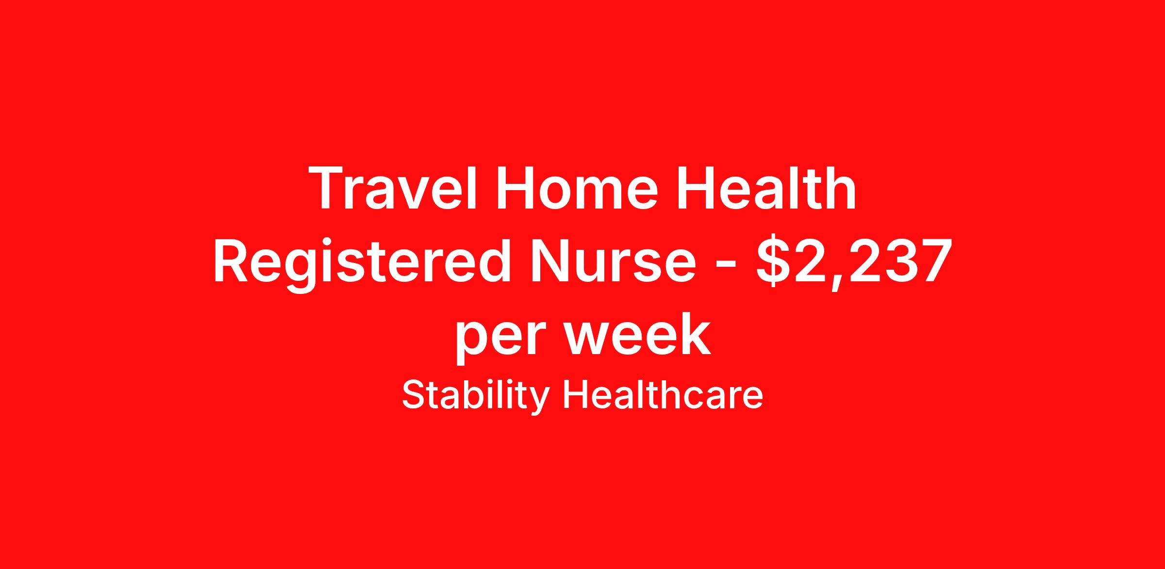 Stability Healthcare is seeking a travel nurse RN Home Health for a travel nursing job in Torrance, California. Job Description & Requirements Specialty: Home Health Discipline: RN Start Date: 04/14/2026 Duration: 13 weeks 40 hours per week Shift: 8 hours, days Employment Type: Travel Stability Healthcare is looking for a Home Health RN RN contract position in Torrance, CA. Home Health nurses work with patients of various ages and backgrounds who require daily care in their homes. Most of our patients are elderly and/or terminally ill. Home Health nurses are responsible for managing a heavy caseload(s). The ability to manage time and tasks are critical skills needed for these positions. While this position presents a challenging workload, the benefits of working outside a clinical setting may be rewarding to many Home Care nurses. Many nurses also enjoy the direct one on one assessment and attention spent on individual patients. *$600 travel bonus *Day 1 health insurance with United Healthcare *PTO plan start accruing on day 1, use during contract or cash out at the end! *Guaranteed stipend if facility calls you off *Extra hour bonus earn an additional hourly bonus for working over your weekly contracted hours Stability Job ID 824826. Pay package is based on 8 hour shifts and 40 hours per week (subject to confirmation) with tax-free stipend amount to be determined. Posted job title: Home Health RN About Stability Healthcare Stability Healthcare was founded in 2009, with the mission of becoming the best Travel Nursing Agency in California. We have been rated one of the top travel nursing agencies and offer our nurses the highest paying travel nursing jobs available. We have access to the best travel assignments from 1000’s of facilities. You can start the year off in sunny California, spend the Spring in the Colorado Rockies, enjoy the Summer in the Mid-West, experience the change of seasons in Boston and New York, and hit the beaches of Florida in the winter. Our Nurses work in the best hospitals and health systems in the country. Benefits Guaranteed Hours Benefits start day 1