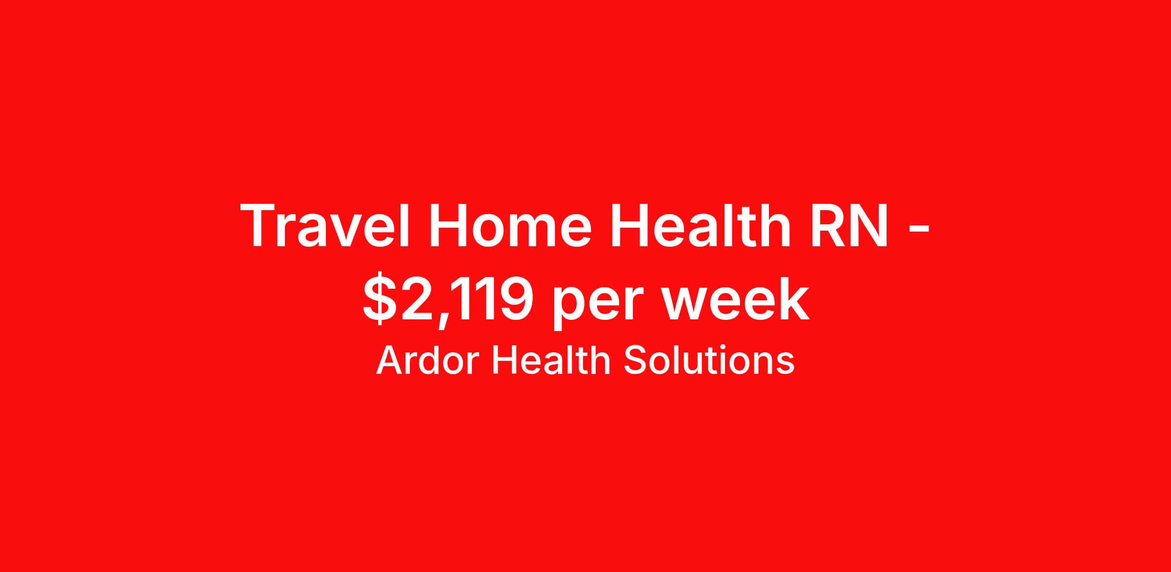 Ardor Health Solutions is seeking a travel nurse RN Home Health for a travel nursing job in Savannah, Georgia. Job Description & Requirements Specialty: Home Health Discipline: RN Start Date: 03/30/2026 Duration: 13 weeks 40 hours per week Shift: 8 hours Employment Type: Travel Location: Savannah, GA Setting: HOME HEALTH Employment Type: Traveler Ardor Health Solutions is looking for a Home Health - HH to join our travel team in Savannah, GA! This is a full time travel contract position. Requirements include, but are not limited to: Active GA CenterWell Home Health (CWHH) license 2 years of Home Health - HH experience This position begins on 03/30/2026 and ends on 06/28/2026 Benefits include: Major Medical Dental/Vision Insurance Pet Insurance Life Insurance with extensive family health options License Reimbursements and processing assistance with our internal licensing department $500 referral bonus 24-hour emergency access to our offices About Ardor Health Solutions: Ardor Health Solutions is a fun, energetic, and passionate group of healthcare staffing professionals. We strive to bring you the highest quality positions that are perfect for your career. We are dedicated to finding you a travel position that not only provides superior compensation, but enriches your life. Ardor Health Solutions is a Fortune Ranked, award-winning, expanding company that has also recently been ranked the 20th Largest Allied Staffing Firm in the Nation by Staffing Industry Analysts (SIA) and by Fortune`s Great Places to Work Survey s several years in a row. For more information or to be considered, please apply now. COVID-19 vaccination and testing requirements vary by facility. Ardor Health adheres to the guidelines and requirements of each facility, as well as all applicable federal, state, and local laws. Ardor Health Job ID 808102. Pay package is based on 8 hour shifts and 40 hours per week (subject to confirmation) with tax-free stipend amount to be determined. Posted job title: Home Health About Ardor Health Solutions Ardor Health Solutions formed in 2001 and remains a privately held medical staffing business owned and operated by the same family. Over the years we have expanded our staffing and recruiting capabilities to include therapy services, nursing services, and all allied services. If you would like the personal service that comes with a staff of recruiters that have an average tenure with the company between 5 and 15 years, and the knowledge of our client services representatives with similar experience, there is no need to look any further. At Ardor Health Solutions you can expect better than average pay packages, extraordinary benefits, and the peace of mind that you will not be forgotten once you start your assignment. Perhaps that is why so many of our caregivers have completed more than a dozen different assignments with us over our long history. Ardor Health is pleased to offer a free medical insurance plan in addition to major medical plans. Please contact a recruiter for more details on the free medical plan and/or any other general inquiries. One final fact about Ardor Health Solutions. We have been paying our caregivers weekly since 2001, and we have never, ever, missed a payroll. If you are currently on an assignment with us, thank you. If you have traveled with us before, we would like to welcome you back. If you have never traveled with us, give us a try. You will not be disappointed. Benefits Weekly pay Holiday Pay Pet insurance Referral bonus Employee assistance programs Medical benefits Dental benefits Vision benefits Benefits start day 1 License and certification reimbursement Life insurance Discount program