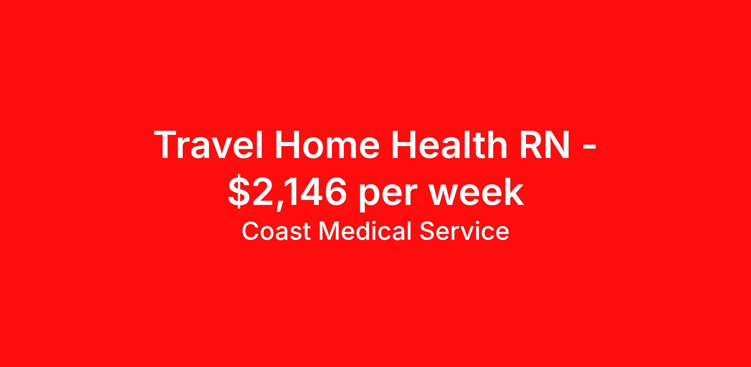 Coast Medical Service is seeking a travel nurse RN Home Health for a travel nursing job in Wichita, Kansas. Job Description & Requirements Specialty: Home Health Discipline: RN Start Date: 04/06/2026 Duration: 13 weeks 40 hours per week Shift: 8 hours, days Employment Type: Travel Coast Medical Service is a nationwide travel nursing & allied healthcare staffing agency dedicated to providing an elite traveler experience for the experienced or first-time traveler. Coast is featured on Blue Pipes' 2023 Best Travel Agencies and named a 2022 Top Rated Healthcare Staffing Firm & 2023 First Half Top Rated Healthcare Staffing Firm by Great Recruiters. Please note that pay rate may differ for locally based candidates. Please apply here or contact a recruiter directly to learn more about this position & the facility, and/or explore others that may be of interest to you. We look forward to speaking with you! Coast Medical Services Job ID 35874514. Pay package is based on 8 hour shifts and 40.0 hours per week (subject to confirmation) with tax-free stipend amount to be determined. Posted job title: RN:Home Health,07:00:00-15:30:00
