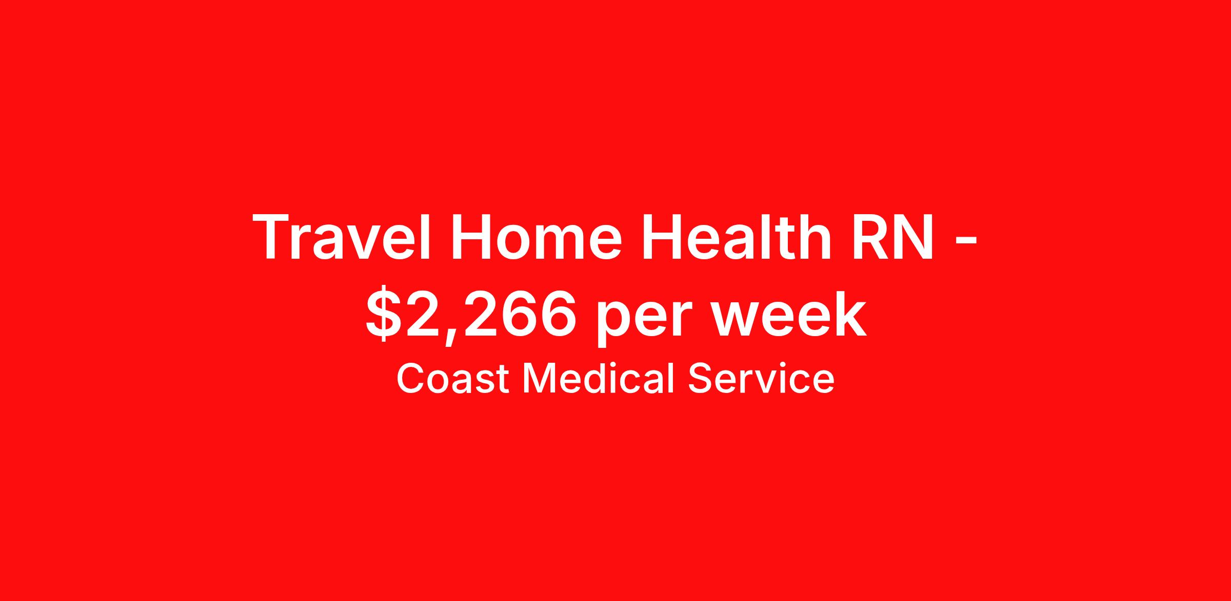Coast Medical Service is seeking a travel nurse RN Home Health for a travel nursing job in Avon, Indiana. Job Description & Requirements Specialty: Home Health Discipline: RN Start Date: ASAP Duration: 14 weeks 40 hours per week Shift: 8 hours, days Employment Type: Travel Coast Medical Service is a nationwide travel nursing & allied healthcare staffing agency dedicated to providing an elite traveler experience for the experienced or first-time traveler. Coast is featured on Blue Pipes' 2023 Best Travel Agencies and named a 2022 Top Rated Healthcare Staffing Firm & 2023 First Half Top Rated Healthcare Staffing Firm by Great Recruiters. Please note that pay rate may differ for locally based candidates. Please apply here or contact a recruiter directly to learn more about this position & the facility, and/or explore others that may be of interest to you. We look forward to speaking with you! Coast Medical Services Job ID 36188566. Pay package is based on 8 hour shifts and 40.0 hours per week (subject to confirmation) with tax-free stipend amount to be determined. Posted job title: RN:Home Health,07:00:00-15:30:00