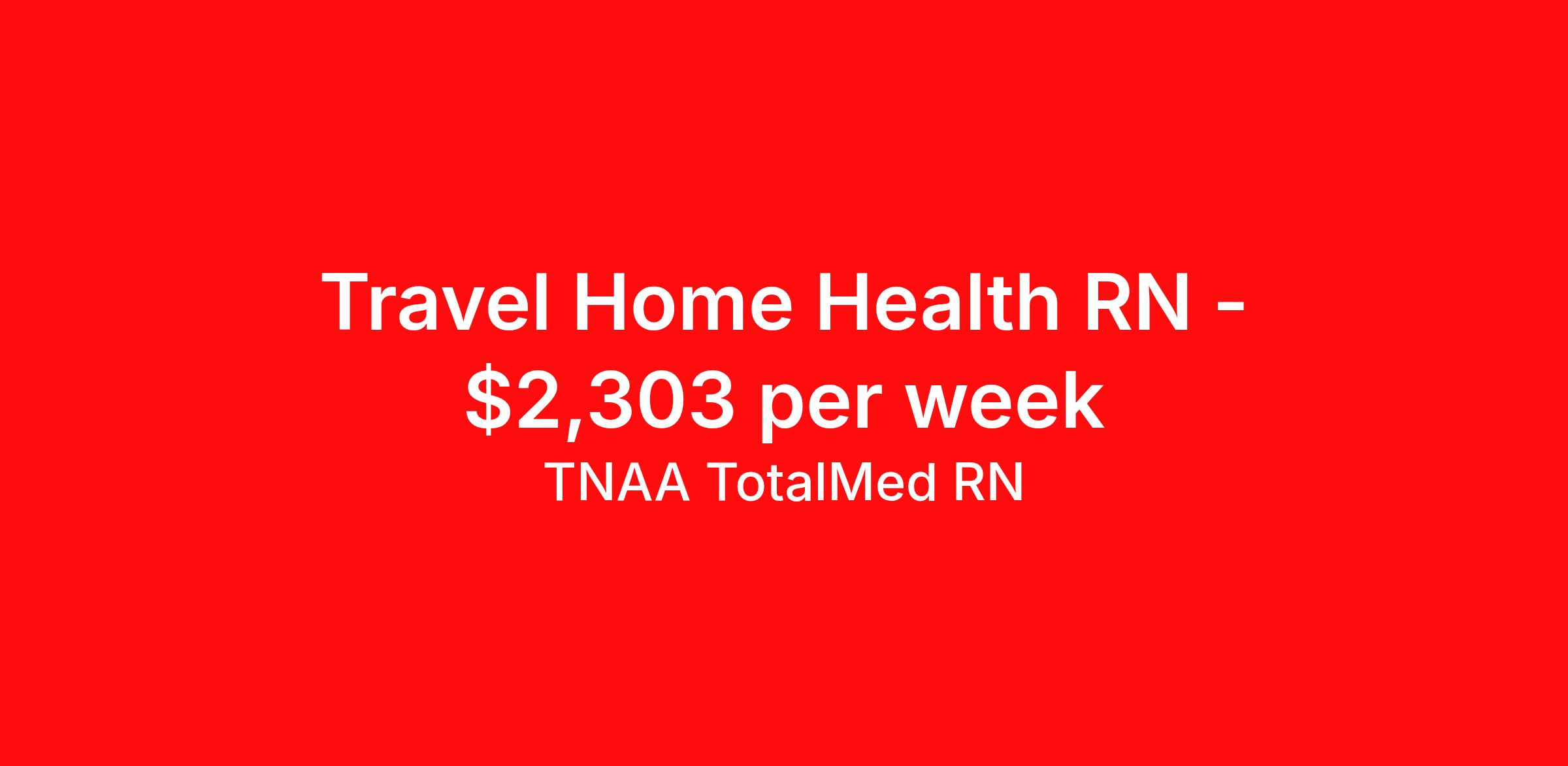 TNAA TotalMed RN is seeking a travel nurse RN Home Health for a travel nursing job in Bala Cynwyd, Pennsylvania. Job Description & Requirements Specialty: Home Health Discipline: RN Start Date: 04/22/2026 Duration: 13 weeks 40 hours per week Shift: 8 hours, days Employment Type: Travel We're looking for Home Health RNs for an immediate travel opening in Bala Cynwyd, PA. The right RN should have 1 year of experience in Home Health nursing. Read below for more requirements. As an RN in Home Health, you will provide skilled nursing care to patients in their homes, supporting recovery, chronic disease management, and overall wellness. You'll work independently and collaboratively with the healthcare team to promote patient-centered care and improve health outcomes. As an RN, you should be prepared to perform the following tasks: Perform comprehensive patient assessments and develop individualized care plans Administer medications, treatments, and wound care as prescribed Monitor patient progress and adjust care plans accordingly Educate patients and families on disease management, medication use, and health maintenance Coordinate care with physicians, therapists, and other healthcare providers Provide skilled nursing interventions such as IV therapy, catheter care, and respiratory support Document nursing care, patient responses, and progress accurately and timely Identify and report any changes in patient condition promptly Ensure compliance with infection control, safety, and regulatory standards Manage time efficiently to meet patient visit schedules and maintain reliable communication The ideal candidate must have at least one year of experience as an RN in a Home Health setting. Additionally, they should possess a current BLS certification and be eligible for State licensure. Additional certifications may be required. RNs in home health should be autonomous, organized, and compassionate, able to provide high-quality care in a patient's home environment. Requirements*: BLS, 2 Years * Additional certifications may be required before beginning an assignment. TotalMed Travel Job ID 1396587. Pay package is based on 8 hour shifts and 40 hours per week (subject to confirmation) with tax-free stipend amount to be determined. Posted job title: Home Health - Home Health RN - Travel Nurse About TNAA TotalMed RN TotalMed is a Top Ten, travel nursing and healthcare staffing agency with the mission of igniting purpose in healthcare. The organization staffs nurses, therapists, pharmacists, and other clinicians of all specialties in all 50 states. They offer local and travel jobs and match caregivers with the right organization to assist both facilities and patients. As an organization, they focus on putting highly-skilled staff into facilities to ensure adequate staffing for a better patient experience. TotalMed specializes in recruiting and placing healthcare professionals in travel, PRN, and permanent positions across the country in Nursing and Allied Health. Throughout 2020, the organization filled roles at even the most short-staffed facilities during the most challenging time in healthcare. By matching the right travel healthcare professional with the right organization, TotalMed continues to offer a lifeline to facilities and their patients. Benefits Weekly pay Guaranteed Hours Continuing Education 401k retirement plan Sick pay Wellness and fitness programs Referral bonus Employee assistance programs Medical benefits Dental benefits Vision benefits Benefits start day 1