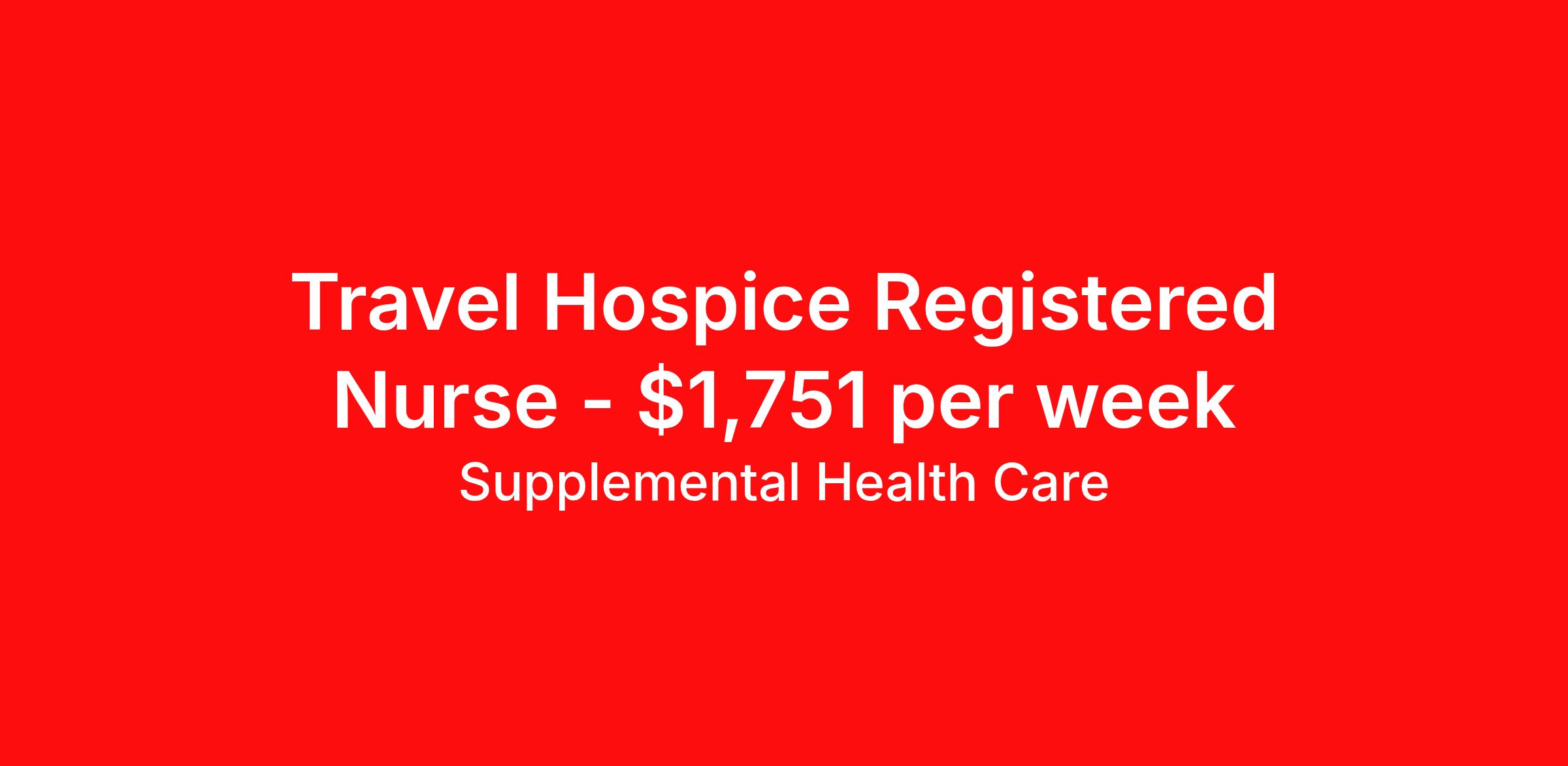 Supplemental Health Care is seeking a travel nurse RN Hospice for a travel nursing job in Ocala, Florida. Job Description & Requirements Specialty: Hospice Discipline: RN Start Date: ASAP Duration: 13 weeks 40 hours per week Shift: 8 hours, days, nights Employment Type: Travel Job Description: Supplemental Health Care is hiring compassionate and experienced Hospice RNs to provide patient-centered care for individuals and families in Ocala, Florida, and surrounding areas. Qualifications: Active, unencumbered RN license in the state of assignment Current BLS certification (American Heart Association) CHPN certification preferred, not required 1 year of recent experience (within last 3 years) in hospice, home health, palliative care, or acute care Strong knowledge of symptom management, pain control, and hospice documentation (CMS CoPs, Medicare Hospice Benefit) Clear background and driving record; current TB test and immunizations Reliable transportation and valid auto insurance Flexibility for travel, occasional evenings, weekends, and on-call shifts Hospice RN Contract Details: $1,600 - $1,751 per week* Nurse will have a designated territory of coverage 4- 6 patient visits per day (45 - 90 minutes each, depending on need) Travel time included in scheduling All nurses on contract with SHC are paid weekly Key Responsibilities: Perform comprehensive assessments and develop individualized hospice care plans Deliver skilled nursing care, symptom management, and emotional support Educate patients and families on hospice philosophy and comfort care practices Collaborate with the interdisciplinary team to review and adjust care plans Maintain accurate documentation in compliance with hospice standards Whether you want to travel or stay local, we help Hospice RNs find the perfect fit with leading healthcare organizations nationwide. With 40 years in healthcare staffing, Supplemental Health Care provides trusted support, competitive pay, and great benefits every step of the way. Apply today to get started with this Hospice Registered Nurse contract opportunity, or talk to our team about the full range of RN opportunities available. What We Offer: Full medical, dental, vision, life, and even pet insurance! Round the clock support. No matter where you are or what time it is, Supplemental Health Care is standing by. SHC's Share the Care referral program is the most dynamic, profitable referral program in the industry. 401(k) Retirement Savings Program with a wide range of investment options. Discounted and free online access to CEU courses through Supplemental University. Please speak with a recruiter for details. Supplemental Health Care is an Equal Opportunity Employer. All candidates, including veterans and those with disabilities, are encouraged to apply. SHC will consider for employment qualified applicants with criminal histories in a manner consistent with the requirements of applicable local, state, or federal law. To learn more, visit www.shccares.com/eeo Supplemental Health Care Job ID 1471117. Pay package is based on 8 hour shifts and 40 hours per week (subject to confirmation) with tax-free stipend amount to be determined. Posted job title: Hospice Registered Nurse (RN) About Supplemental Health Care At Supplemental Health Care, a simple belief in the power of caring guides a unique commitment to world-class service in healthcare staffing. For 40 years, we’ve supported talented professionals pursuing their life calling in hospitals, schools, home health, corrections, behavioral health, and other settings. At SHC, we inspire vital connections and enrich lives and inspire better outcomes. As recipients of the Best in Staffing Awards for both Client and Talent, Supplemental Health Care is proud to be among only 2% of staffing companies singled out for the distinction based on the real feedback of our employees and the clients we serve. SHC has also earned The Joint Commission’s Gold Seal of Approval and is named among the Largest Health Care Staffing companies in the United States by Staffing Industry Analysts. We are also thrilled to recognize our very own SLP, Dr. Kelly Byrd as the American Staffing Association 2024 National Staffing Employee of the Year and Health Care Sector All-Star. We’re honored to connect Dr. Byrd to employment, share her incredible story, and support her family literacy nonprofit. For everyone that we serve, SHC is the place where caring hearts thrive. Benefits Referral bonus Benefits start day 1 401k retirement plan Continuing Education Discount program Health savings account