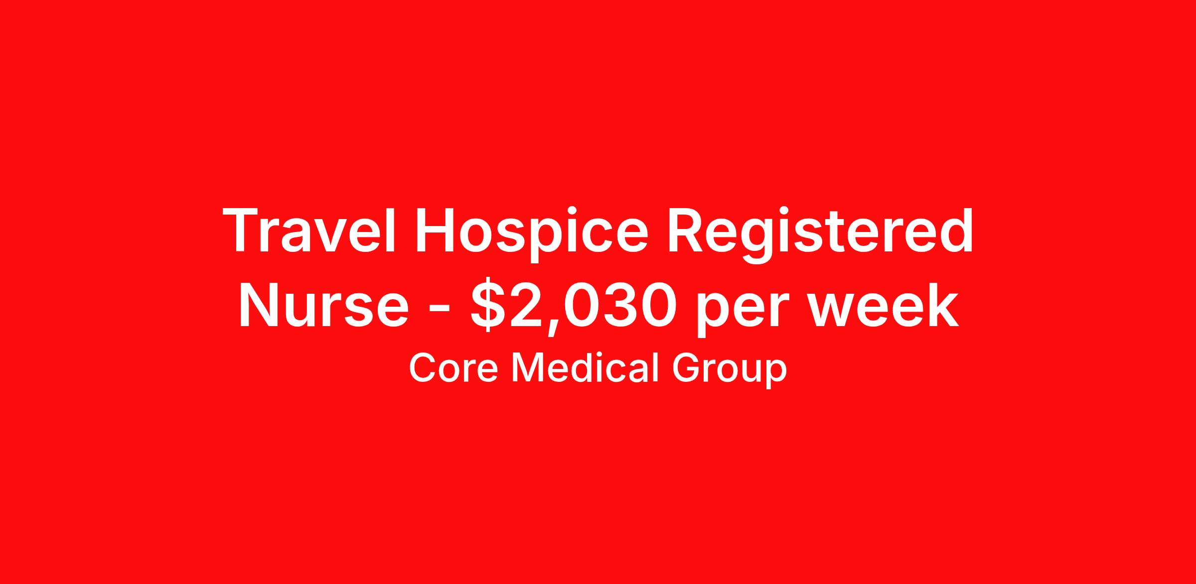 Core Medical Group is seeking a travel nurse RN Hospice for a travel nursing job in Bolivia, North Carolina. Job Description & Requirements Specialty: Hospice Discipline: RN Start Date: 03/21/2026 Duration: 13 weeks 40 hours per week Shift: 8 hours Employment Type: Travel Client in NC seeking Registered Nurse: Hospice for the following shift(s): Days We are looking for a healthcare professional who is ready to provide exceptional patient care in this contract/travel role. Contract/travel assignments are typically 13 weeks, with potential to extend. Help us continue our mission to connect people, improve lives, and give back to the community by joining the CoreMedical Group team. When you work with CoreMedical Group, we put you first and treat you like family, supporting you every step of the way. CoreMedical Group is one of the largest healthcare staffing agencies in the country, with travel and contract positions located across the United States. Our recruiters will help you find the perfect job, whether it's across the country or across the street. In addition to dedicated, personalized support from your recruiter, when you work with CoreMedical Group you'll receive: Access to an extensive benefits package, including day 1 health, dental, and vision insurance, employer paid life insurance, a health reimbursement account, and more! Weekly paychecks with competitive pay packages Matching 401(k) benefits to help you save for retirement Licensure assistance and reimbursement to set you up for success on your contract Travel reimbursement and dedicated housing support while on assignment Referral cash bonuses when you connect us with other clinicians CoreMedical Group also offers you a free, all-inclusive vacation each year as our way of saying "thank you" for your hard work. Join other healthcare professionals on the annual Club CoreMed retreat and you'll see why our contract and travel professionals come back to us year after year! Your career is too valuable to tackle on your own. Let CoreMedical Group help you with your healthcare journey! *Estimate of weekly payments is intended for informational purposes and includes hourly wages, as well as reimbursements for meal & incidental expenses, and housing expenses incurred on behalf of the Company. Any benefits (medical/dental/vision) are in addition to the weekly pay. Please speak with your Recruiter for additional details. Estimated payments are subject to change until formal offer of assignment is made and accepted. Core Medical Group Job ID 1367258. Pay package is based on 8 hour shifts and 40 hours per week (subject to confirmation) with tax-free stipend amount to be determined. Posted job title: RN About Core Medical Group CoreMedical Group is one of the largest healthcare staffing agencies in the country. We have jobs nationwide in travel nursing, travel allied health, interim, locum tenens, and permanent placements! Join the staffing agency with Club CoreMed, the best perk in the industry - an all inclusive paid trip to a tropical resort! Benefits Weekly pay Holiday Pay Guaranteed Hours Continuing Education 401k retirement plan Pet insurance Company provided housing options Sick pay Wellness and fitness programs Mileage reimbursement Referral bonus Employee assistance programs Medical benefits Dental benefits Vision benefits Benefits start day 1 License and certification reimbursement Life insurance Discount program