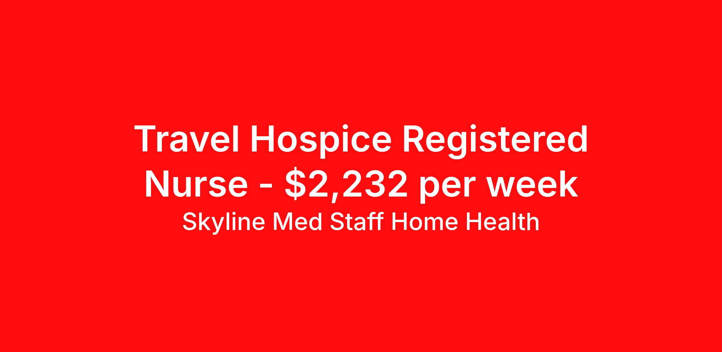 Skyline Med Staff Home Health is seeking a travel nurse RN Hospice for a travel nursing job in West Allis, Wisconsin. Job Description & Requirements Specialty: Hospice Discipline: RN Start Date: ASAP Duration: 13 weeks 40 hours per week Shift: 8 hours, days Employment Type: Travel Weekly amount stated in the job postings is estimated based on estimated hourly wages and potential stipends available for the location of the assignment. Pay package is calculated on bill rate at the time job was posted, but can change or vary without notice. Exact pay packages might vary as this is an estimate. Our recruiter would be happy to build an exact pay package for you for each job. Join the Best in Travel Nursing! Skyline Med Staff was honored as the 1 Best Travel Nursing Company in 2025 by BluePipes, a recognition driven by glowing reviews from travel healthcare professionals. Our recruiters are consistently praised on Google for their responsiveness, dedication, accessibility, and industry knowledge. Ready to experience the difference? Apply for a job today and see why travel nurses choose Skyline! As a traveler with Skyline Med Staff, you'll have a dedicated recruiter supporting you every step of the way and available whenever you need them. We are a Woman Owned Agency providing clinicians with Health Insurance through Blue Cross Blue Shield, along with Dental and Vision coverage, plus $500 referral bonuses! We’re seeking committed Nursing professionals who excel in delivering quality patient care and can adapt to diverse work environments. Required for Submission: 1. Minimum of 1 year recent work experience in the specialty of the job applying for 2. A current BLS/CPR certification through American Heart Association 3. Active License in the state of the job location We look forward to connecting and working with you to find your next job opportunity! Skyline Med Staff Home Health Job ID 35960287. Pay package is based on 8 hour shifts and 40.0 hours per week (subject to confirmation) with tax-free stipend amount to be determined. Posted job title: RN:Hospice,07:00:00-15:00:00 About Skyline Med Staff Home Health Join the Top- Rated Travel Healthcare Team! Skyline Med Staff was named as the 1 Best Travel Healthcare Company in 2025 by BluePipes, a recognition driven by glowing reviews from travel healthcare professionals. Our recruiters are consistently praised on Google for their responsiveness, dedication, accessibility, and industry knowledge. Ready to experience the difference? Apply for a job today and see why healthcare professionals choose Skyline! Certified Women Owned Business We believe that travel is good for the soul. We want to be on your journey with you and find the right job that fits you Skyline Med Staff is committed to one vision treating others the way that THEY want to be treated. The executive team at Skyline Med Staff focuses on a commitment to quality, consistency, and the highest level of service. Our team members continually strive to build long term relationships that center on you and helping you achieve your goals. Some of the Benefits you will receive with Skyline Med Staff: Over 30 years of combined experience in the staffing industry Higher Take-Home Pay Rates Dedicated Personal Recruiter We are available to you 24/7 Health Insurance Plan Options Tax Free Per Diems, Housing Stipends and Travel Reimbursements Joint Commission Certified Contracts in all 50 states Referral and Loyalty Bonuses Benefits Medical benefits Referral bonus