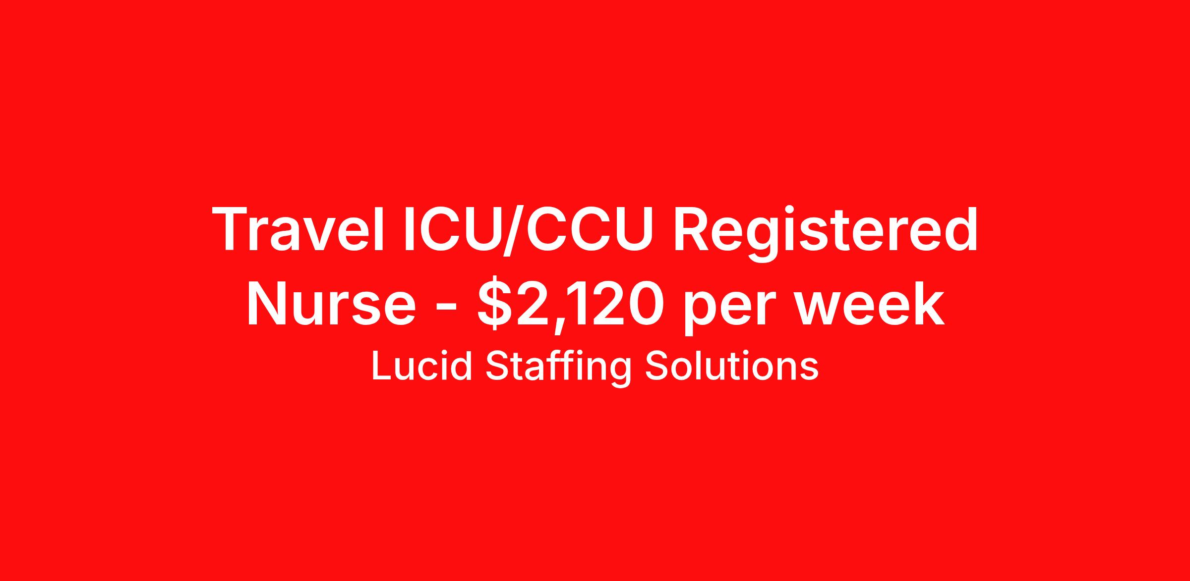 Lucid Staffing Solutions is seeking a travel nurse RN ICU - Intensive Care Unit for a travel nursing job in Hazard, Kentucky. Job Description & Requirements Specialty: ICU - Intensive Care Unit Discipline: RN Duration: 13 weeks 36 hours per week Shift: 12 hours, nights Employment Type: Travel Job Description Position: Travel Registered Nurse (RN) with experience in ICU Location: Hazard, Kentucky Shift: hr Night Weekly Gross: $2120.08 Lucid Staffing Solutions was created by former healthcare workers who lived the short staffing, the chaotic workflows, and the nonstop pressure that comes with patient care. We built an agency powered by real clinical experience, kept simple and supportive, so you never have to guess whether the people guiding you actually know what they’re talking about. Minimum Requirements: Active license as a Registered Nurse (RN) Licensed in Kentucky (If applicable) or compact eligible Two years of recent ICU experience Active BLS Why Lucid Works for Travelers Paid Weekly: Stipends pushed to GSA limits whenever possible $500 Travel Reimbursement: Paid at the start of each assignment Clinician-Led Team: Recruiters and Account Managers with real clinical experience In-House Compliance: fast updates, real communication, and none of the delays that come with outsourced vendors. Health Coverage Options: Multiple medical plans plus dental, vision, and workers compensation 401(k) Match: 4 percent match after 6 months License & Certification Reimbursement: We help cover the cost of staying compliant Liability Insurance: Included automatically Referral Bonuses: $500 per referral, $750 after five referrals Ready to start your journey? Apply today to connect with a Clinician-Recruiter! Lucid Staffing Solutions Job ID 36330. Pay package is based on 12 hour shifts and 36 hours per week (subject to confirmation) with tax-free stipend amount to be determined. Posted job title: ICU About Lucid Staffing Solutions Clinician Owned & Operated At Lucid Staffing Solutions, we do things differently—because we’ve been in your shoes. Founded by actual healthcare professionals, Lucid was built to fix the issues we experienced as travelers. We know what makes a great assignment: competitive pay, seamless onboarding, honest recruiters, and most importantly—working with a team that truly sees and supports you. Our entire team is made up of former clinicians who understand the demands of the job and what travelers truly need to succeed. We offer some of the highest paying allied health and nursing contracts across the country, along with some amazing benefits & perks. Whether you're chasing freedom, flexible schedules, bigger paychecks, or your next adventure, Lucid helps you get there—with real support, real respect , and real healthcare experts. Benefits Dental benefits Medical benefits Vision benefits
