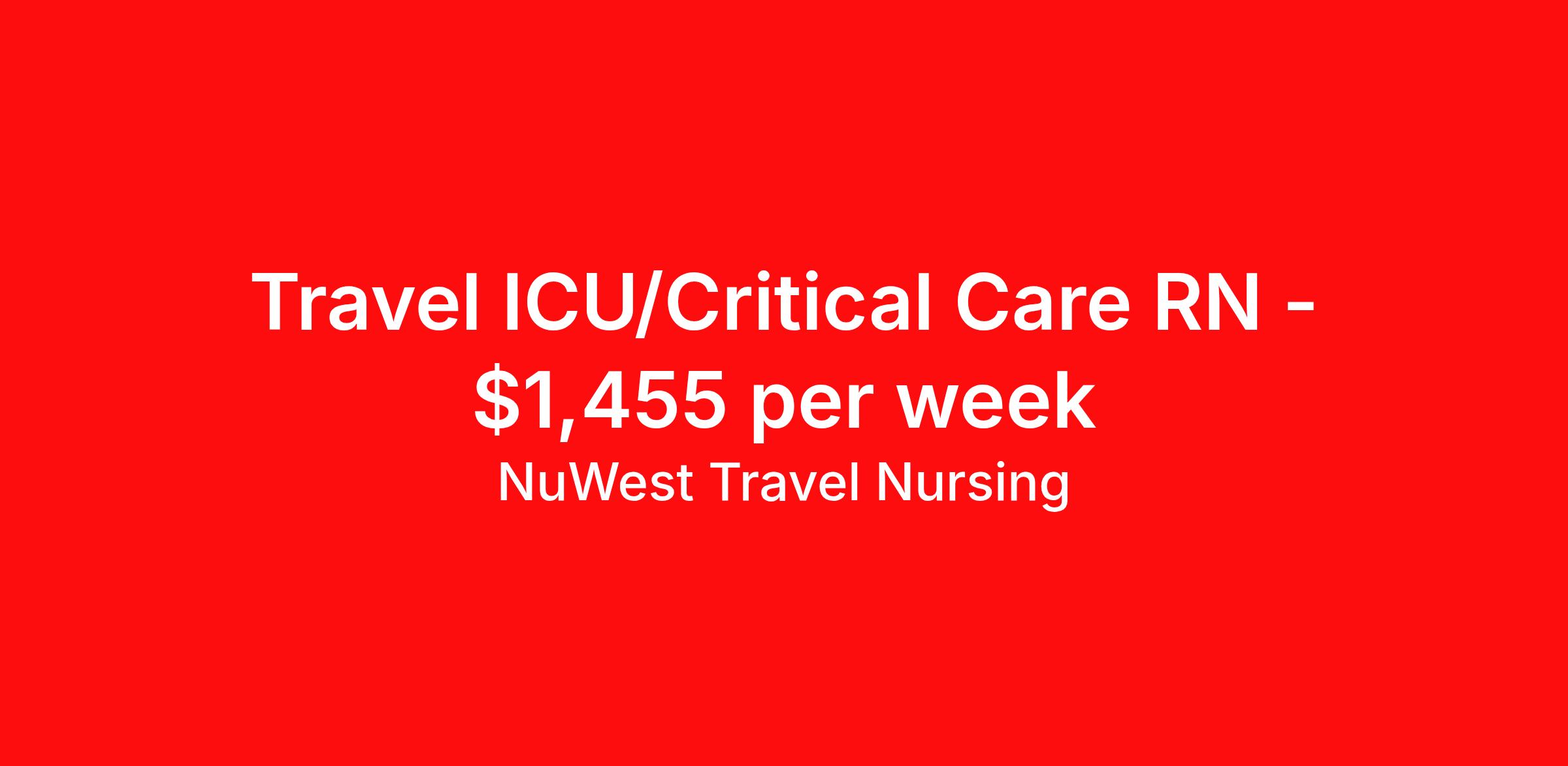 NuWest Travel Nursing is seeking a travel nurse RN ICU - Intensive Care Unit for a travel nursing job in Dallas, Texas. Job Description & Requirements Specialty: ICU - Intensive Care Unit Discipline: RN Duration: 13 weeks 36 hours per week Shift: 12 hours Employment Type: Travel We have a new assignment for RN - ICU/Critical Care in Dallas, TX and are interviewing ASAP. This is a travel assignment, 3x12 Nights position at a great facility. Pay Range: $1336.95 - $1572.88 Per Week Benefits include medical, dental, vision, 401K, weekly direct deposit, and more! NuWest Travel Nursing Job ID 262031. Pay package is based on 12 hour shifts and 36 hours per week (subject to confirmation) with tax-free stipend amount to be determined.
