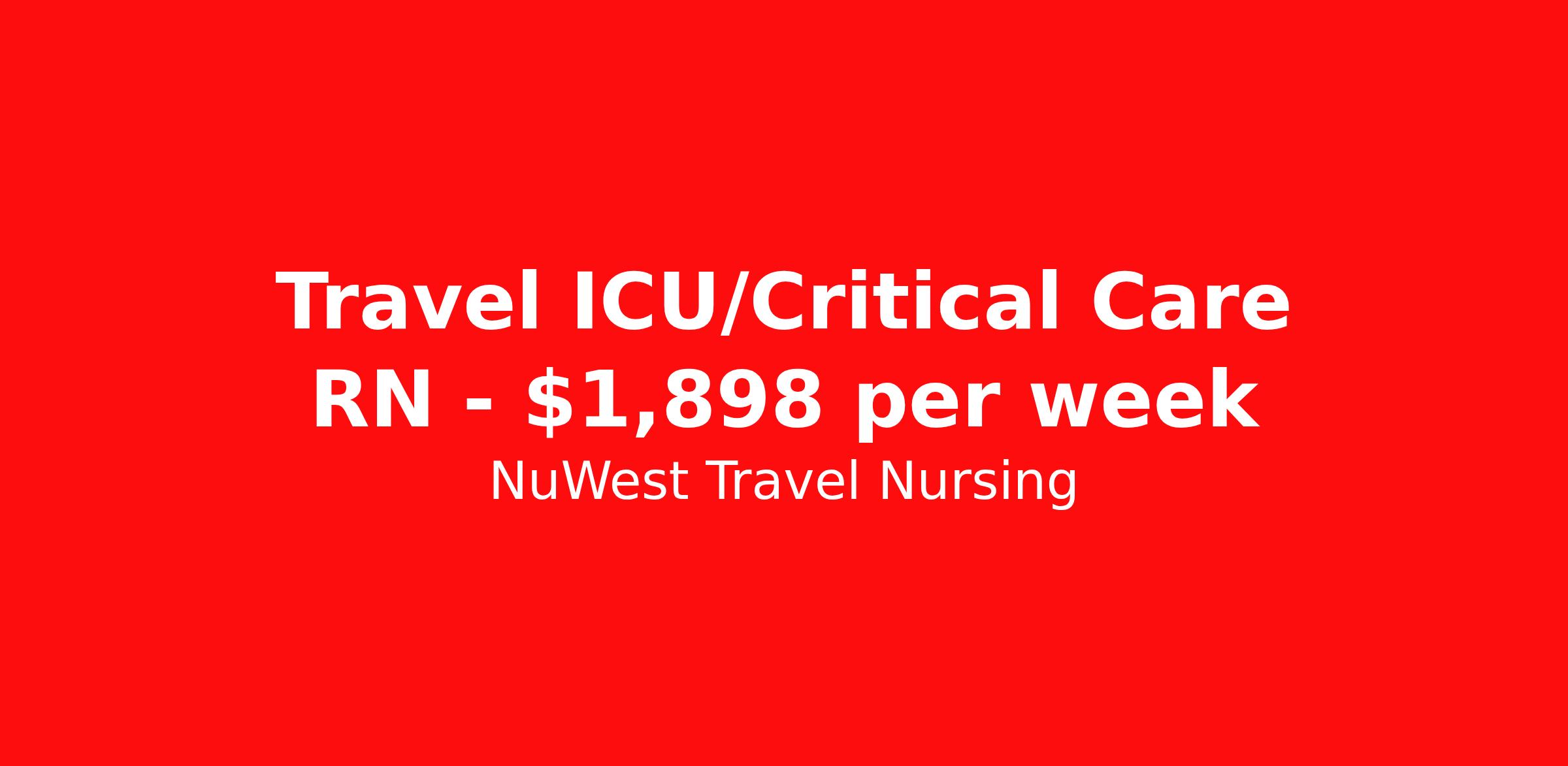 NuWest Travel Nursing is seeking a travel nurse RN ICU - Intensive Care Unit for a travel nursing job in Boston, Massachusetts. Job Description & Requirements Specialty: ICU - Intensive Care Unit Discipline: RN Duration: 7 weeks 36 hours per week Shift: 12 hours Employment Type: Travel We have a new assignment for RN - ICU/Critical Care in Boston, MA and are interviewing ASAP. This is a travel assignment, 24Hrs Nights position at a great facility. Pay Range: $1744.2 - $2052 Per Week Benefits include medical, dental, vision, 401K, weekly direct deposit, and more! NuWest Travel Nursing Job ID 253153. Pay package is based on 12 hour shifts and 36 hours per week (subject to confirmation) with tax-free stipend amount to be determined.