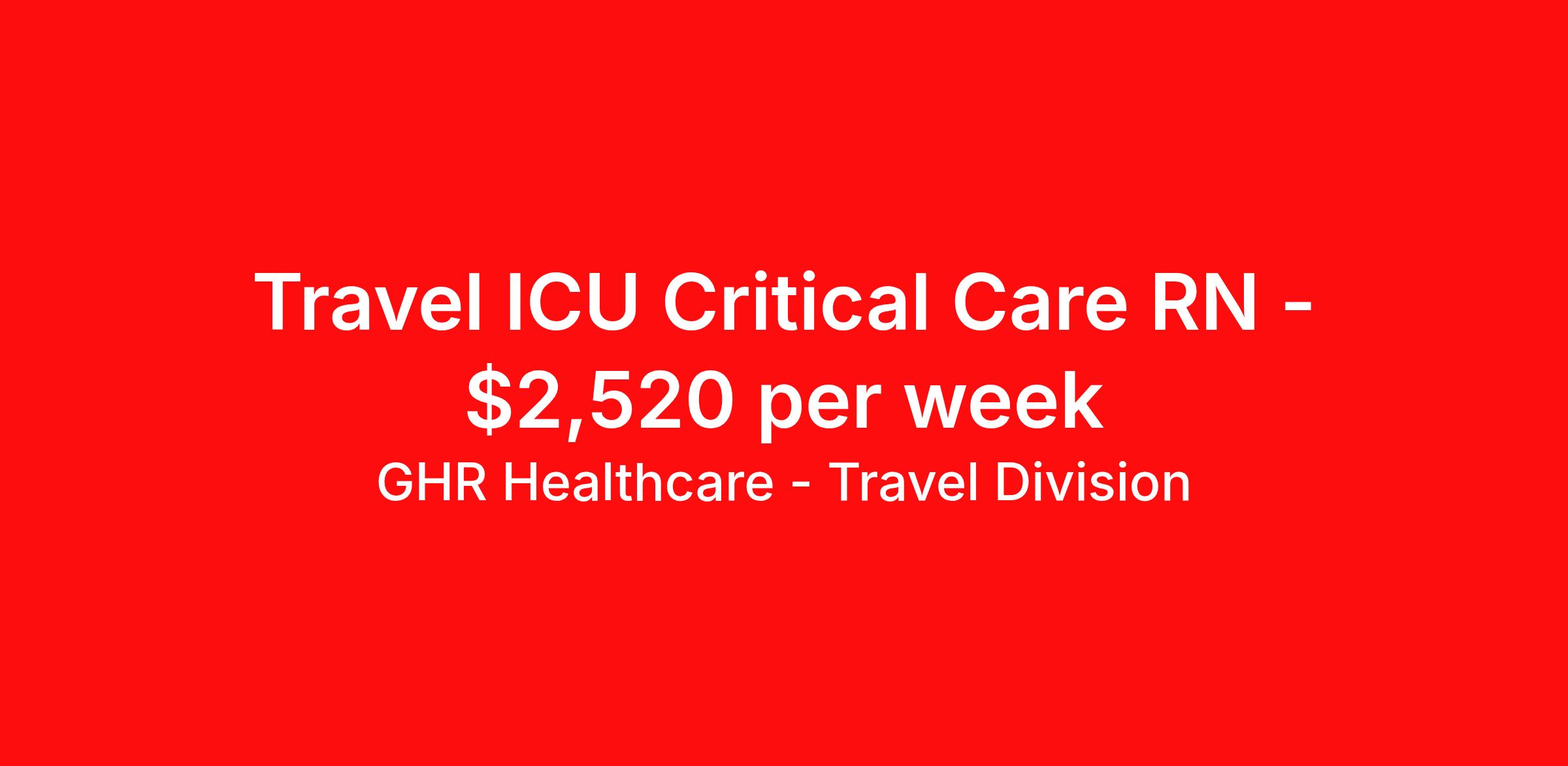 GHR Healthcare - Travel Division is seeking a travel nurse RN ICU - Intensive Care Unit for a travel nursing job in Lebanon, New Hampshire. Job Description & Requirements Specialty: ICU - Intensive Care Unit Discipline: RN Start Date: 04/13/2026 Duration: 12 weeks 36 hours per week Shift: 12 hours Employment Type: Travel GHR Healthcare - Travel Division Job ID 75841911. Pay package is based on 12 hour shifts and 36 hours per week (subject to confirmation) with tax-free stipend amount to be determined. About GHR Healthcare - Travel Division For over 30 years, GHR Healthcare has been the bridge between healthcare professionals and the facilities that need them nationwide. We're committed to uncovering your ideal fit, supported by GHR's dedication to competitive compensation, transparent communication, and a devoted team that genuinely cares about your career journey. You can trust us to stand by your side as your advocate, confidante, and partner in advancing your career. At GHR, care and consideration are at the heart of everything we do. Visit ghrhealthcare.com to learn more.