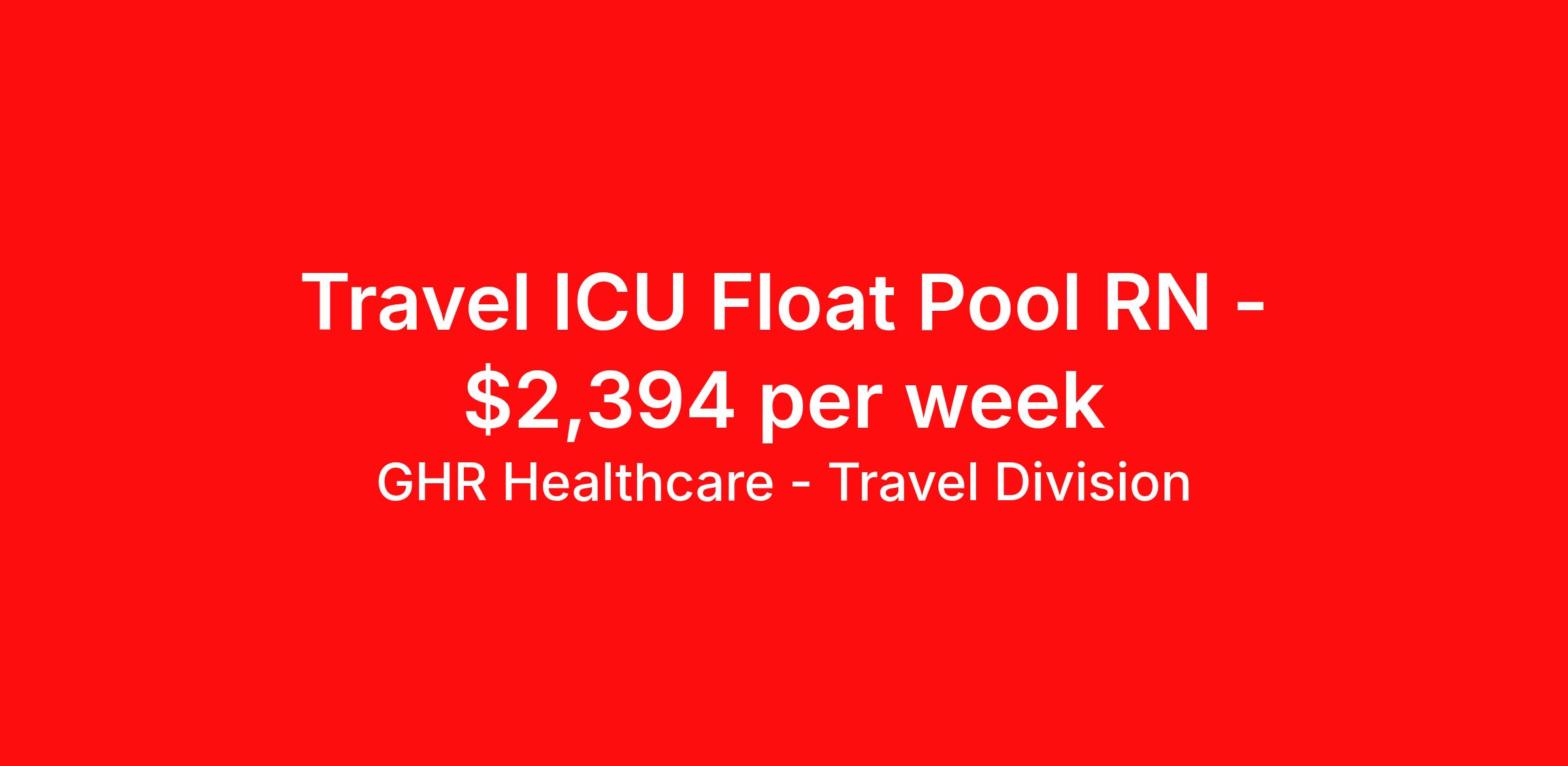 GHR Healthcare - Travel Division is seeking a travel nurse RN Float ICU - Intensive Care Unit Med Surg for a travel nursing job in Geneva, New York. Job Description & Requirements Specialty: ICU - Intensive Care Unit Discipline: RN Start Date: 03/30/2026 Duration: 13 weeks 36 hours per week Shift: 12 hours Employment Type: Travel GHR Healthcare - Travel Division Job ID 76073482. Pay package is based on 12 hour shifts and 36 hours per week (subject to confirmation) with tax-free stipend amount to be determined. About GHR Healthcare - Travel Division For over 30 years, GHR Healthcare has been the bridge between healthcare professionals and the facilities that need them nationwide. We're committed to uncovering your ideal fit, supported by GHR's dedication to competitive compensation, transparent communication, and a devoted team that genuinely cares about your career journey. You can trust us to stand by your side as your advocate, confidante, and partner in advancing your career. At GHR, care and consideration are at the heart of everything we do. Visit ghrhealthcare.com to learn more.