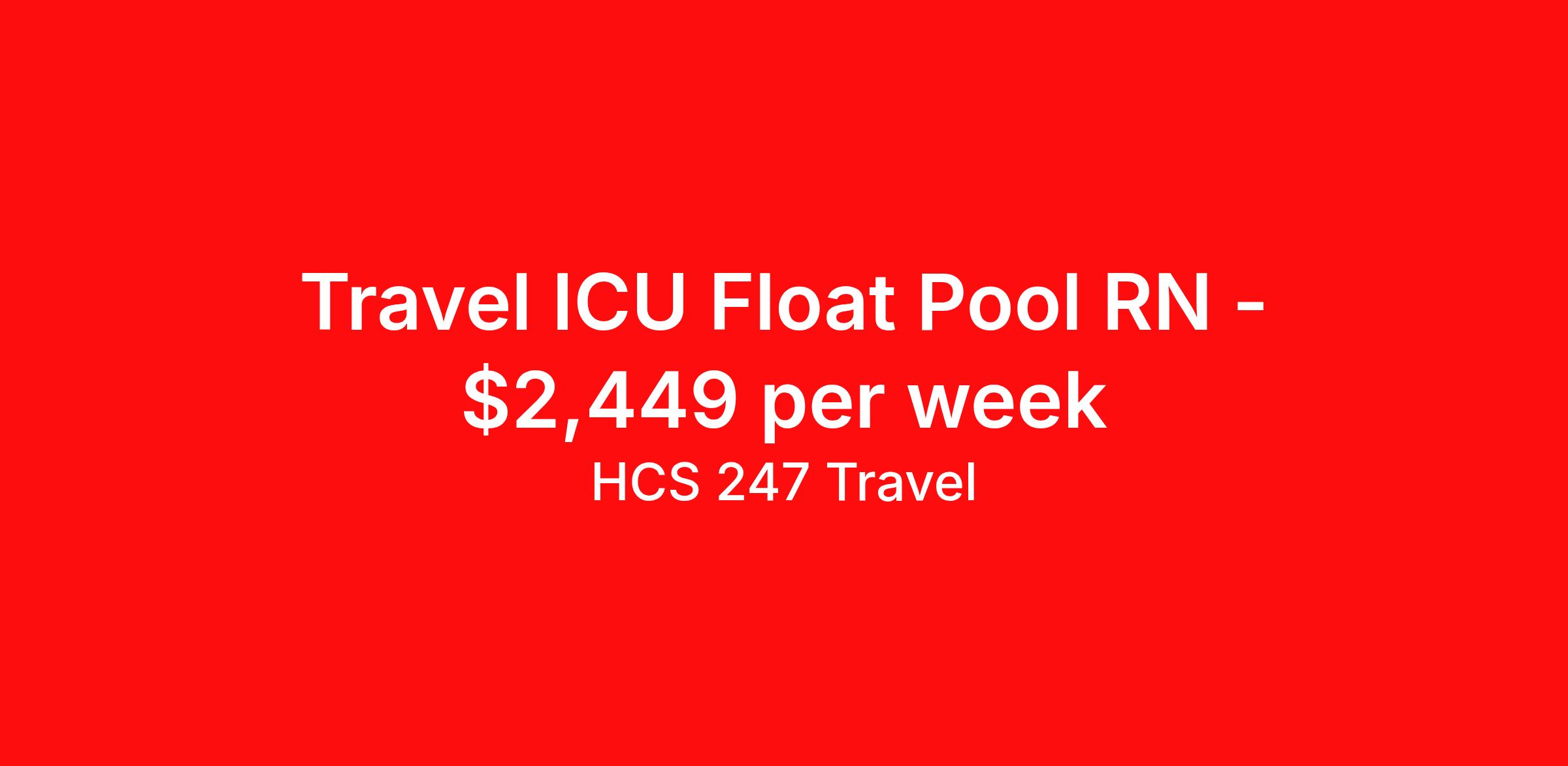 HCS 247 Travel is seeking a travel nurse RN ICU - Intensive Care Unit for a travel nursing job in Centennial, Colorado. Job Description & Requirements Specialty: ICU - Intensive Care Unit Discipline: RN Start Date: 04/13/2026 Duration: 13 weeks 36 hours per week Shift: 12 hours, nights Employment Type: Travel HCS 247 Travel Job ID 62363318. Pay package is based on 12 hour shifts and 36 hours per week (subject to confirmation) with tax-free stipend amount to be determined. About HCS 247 Travel HCS 24/7 is a national healthcare staffing organization specializing in the placement of Registered Nurses and Allied health professionals across acute care and other clinical settings. We support travel assignments, local short- and long-term contracts, per diem, temp-to-perm, and direct hire opportunities nationwide. Our clinical coverage includes Registered Nurse specialties such as ER, ICU, Med-Surg, Telemetry, Step-Down, OR, PACU, L&D, Mother/Baby, NICU, Cath Lab, Endoscopy, and more along with a full range of allied and imaging professionals, including Respiratory Therapists, Surgical Technicians, X-Ray Techs, CT Techs, MRI Techs, Interventional Radiology (IR) Techs, Cath Lab Techs, Ultrasound/Sonographers, Mammography Techs, and Nuclear Medicine Techs. With competitive compensation and benefits, consistent opportunities, and a clinician-first approach backed by top-rated customer service, HCS 24/7 delivers a seamless experience from initial application through assignment completion. Benefits Holiday Pay Guaranteed Hours Continuing Education Mileage reimbursement Referral bonus Medical benefits Dental benefits Vision benefits License and certification reimbursement Life insurance Benefits start day 1 Weekly pay