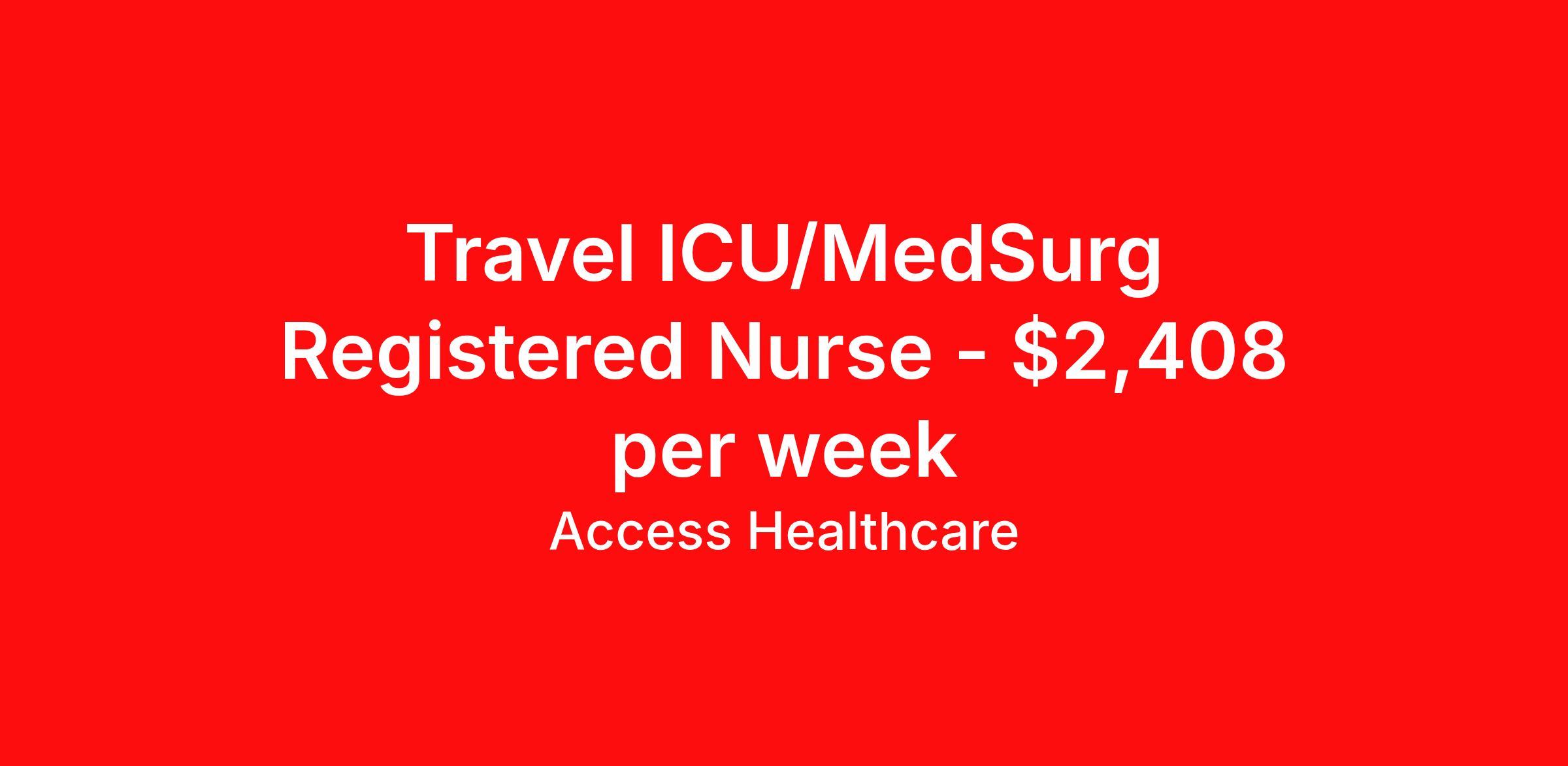 Access Healthcare is seeking a travel nurse RN ICU - Intensive Care Unit Med Surg for a travel nursing job in Buffalo, Minnesota. Job Description & Requirements Specialty: ICU - Intensive Care Unit Discipline: RN Start Date: 04/06/2026 Duration: 13 weeks 40 hours per week Shift: 8 hours, rotating Employment Type: Travel Access Healthcare Job ID 75794550. Pay package is based on 8 hour shifts and 40 hours per week (subject to confirmation) with tax-free stipend amount to be determined. About Access Healthcare Access Healthcare aims to provide superior service to our nursing family by providing around the clock support, competitive pay packages and an unmatched benefits package! Unlike other agencies, we offer a true family feel and work with you to find the placement that is right for you. We offer one of the top leading pay packages in the industry and we are ready to get you the money you deserve! Access Healthcare was founded by two travel nurses, Danielle and Diego, who had a dream and a shared vision of creating an agency which all nurses would want to work with. Our passion has led us to where we are today as one of the top 10 agencies in our home state of New Jersey, with access to contracts in all 50 states! We encourage you to join our team and we cannot wait to get to know you!