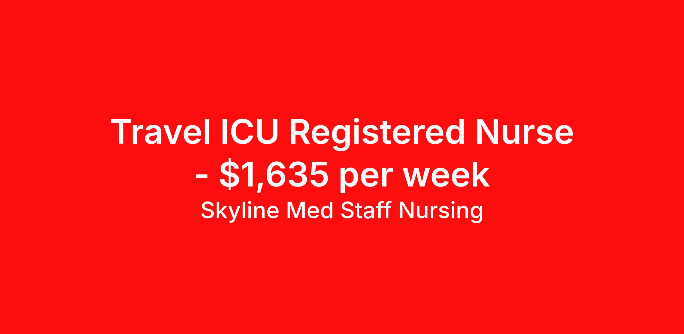 Skyline Med Staff Nursing is seeking a travel nurse RN ICU - Intensive Care Unit for a travel nursing job in Vicksburg, Mississippi. Job Description & Requirements Specialty: ICU - Intensive Care Unit Discipline: RN Start Date: 03/23/2026 Duration: 13 weeks 36 hours per week Shift: 12 hours, nights Employment Type: Travel Weekly amount stated in job postings is an estimate based on estimated hourly wage and potential stipends available for the location of the assignment. Pay package is calculated on bill rate at the time job was posted, but can change or vary without notice. Exact pay packages might vary as this is an estimate. Our recruiter would be happy to build an exact pay package for you for each job. Skyline Med Staff Nursing Job ID 36131349. Pay package is based on 12 hour shifts and 36.0 hours per week (subject to confirmation) with tax-free stipend amount to be determined. Posted job title: RN:ICU,19:00:00-07:00:00 About Skyline Med Staff Nursing Join the Top- Rated Travel Healthcare Team! Skyline Med Staff was named as the 1 Best Travel Healthcare Company in 2025 by BluePipes, a recognition driven by glowing reviews from travel healthcare professionals. Our recruiters are consistently praised on Google for their responsiveness, dedication, accessibility, and industry knowledge. Ready to experience the difference? Apply for a job today and see why healthcare professionals choose Skyline! Certified Women Owned Business We believe that travel is good for the soul. We want to be on your journey with you and find the right job that fits you Skyline Med Staff is committed to one vision treating others the way that THEY want to be treated. The executive team at Skyline Med Staff focuses on a commitment to quality, consistency, and the highest level of service. Our team members continually strive to build long term relationships that center on you and helping you achieve your goals. Some of the Benefits you will receive with Skyline Med Staff: Over 30 years of combined experience in the staffing industry Higher Take-Home Pay Rates Dedicated Personal Recruiter We are available to you 24/7 Health Insurance Plan Options Tax Free Per Diems, Housing Stipends and Travel Reimbursements Joint Commission Certified Contracts in all 50 states Referral and Loyalty Bonuses Benefits Medical benefits Referral bonus