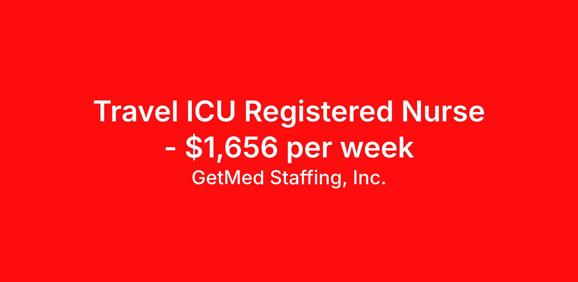 GetMed Staffing, Inc. is seeking a travel nurse RN ICU - Intensive Care Unit for a travel nursing job in Asheville, North Carolina. Job Description & Requirements Specialty: ICU - Intensive Care Unit Discipline: RN Start Date: 03/30/2026 Duration: 13 weeks 36 hours per week Shift: 12 hours, nights Employment Type: Travel GetMed Staffing is searching for a strong ICU RN to assist our traveler-friendly client. A minimum of 1-2 years of experience is required. Traveling with GetMed Staffing offers the unique opportunity to gain diverse experiences, both personally and professionally. Gain experience that matters. GetMed Staffing, Inc. Job ID 36077486. Pay package is based on 12 hour shifts and 36.0 hours per week (subject to confirmation) with tax-free stipend amount to be determined. Posted job title: RN:ICU,19:00:00-07:00:00 About GetMed Staffing, Inc. We are a diversity owned company, specializing in healthcare recruiting services. We truly understand how important a healthcare travelers' relationship is with their recruiter, as well as our relationship is with our healthcare facilities. We recognize that the needs of our healthcare travelers can vary, and therefore we provide the personalized touch necessary to ensure a successful travel assignment each and every time. Our healthcare facilities and clients benefit from us putting our healthcare travelers first. GetMed Staffing is excited to be a leader within the industry by focusing on providing healthcare travelers with more choices and possibilities as they plan for their next healthcare travel assignment. Benefits Life insurance Medical benefits Dental benefits Vision benefits 401k retirement plan