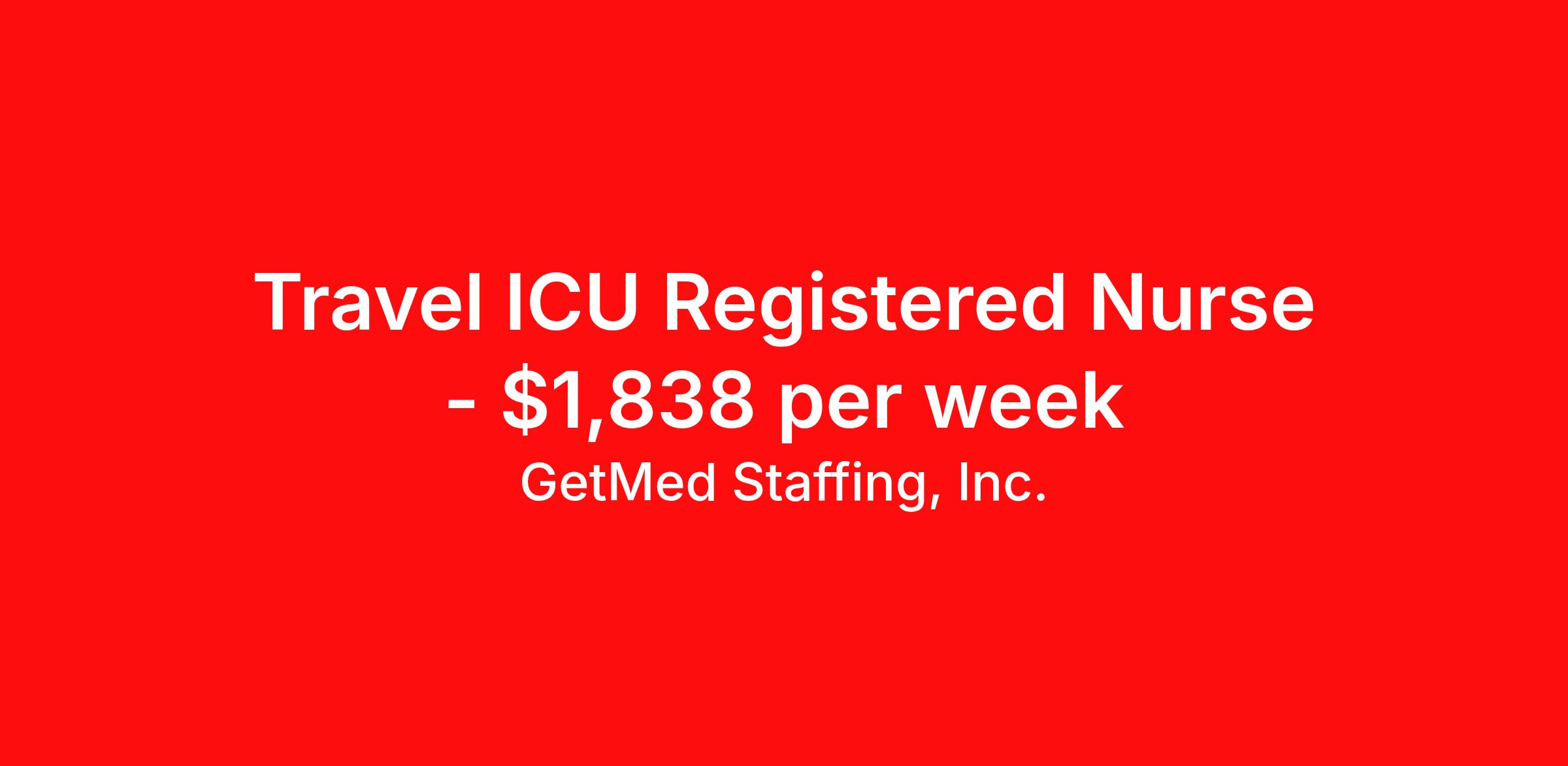 GetMed Staffing, Inc. is seeking a travel nurse RN ICU - Intensive Care Unit for a travel nursing job in Mayfield, Kentucky. Job Description & Requirements Specialty: ICU - Intensive Care Unit Discipline: RN Start Date: 03/30/2026 Duration: 13 weeks 36 hours per week Shift: 12 hours, days Employment Type: Travel GetMed Staffing, Inc. Job ID 36022009. Pay package is based on 12 hour shifts and 36.0 hours per week (subject to confirmation) with tax-free stipend amount to be determined. Posted job title: RN:ICU,07:00:00-19:00:00 About GetMed Staffing, Inc. We are a diversity owned company, specializing in healthcare recruiting services. We truly understand how important a healthcare travelers' relationship is with their recruiter, as well as our relationship is with our healthcare facilities. We recognize that the needs of our healthcare travelers can vary, and therefore we provide the personalized touch necessary to ensure a successful travel assignment each and every time. Our healthcare facilities and clients benefit from us putting our healthcare travelers first. GetMed Staffing is excited to be a leader within the industry by focusing on providing healthcare travelers with more choices and possibilities as they plan for their next healthcare travel assignment. Benefits Life insurance Medical benefits Dental benefits Vision benefits 401k retirement plan