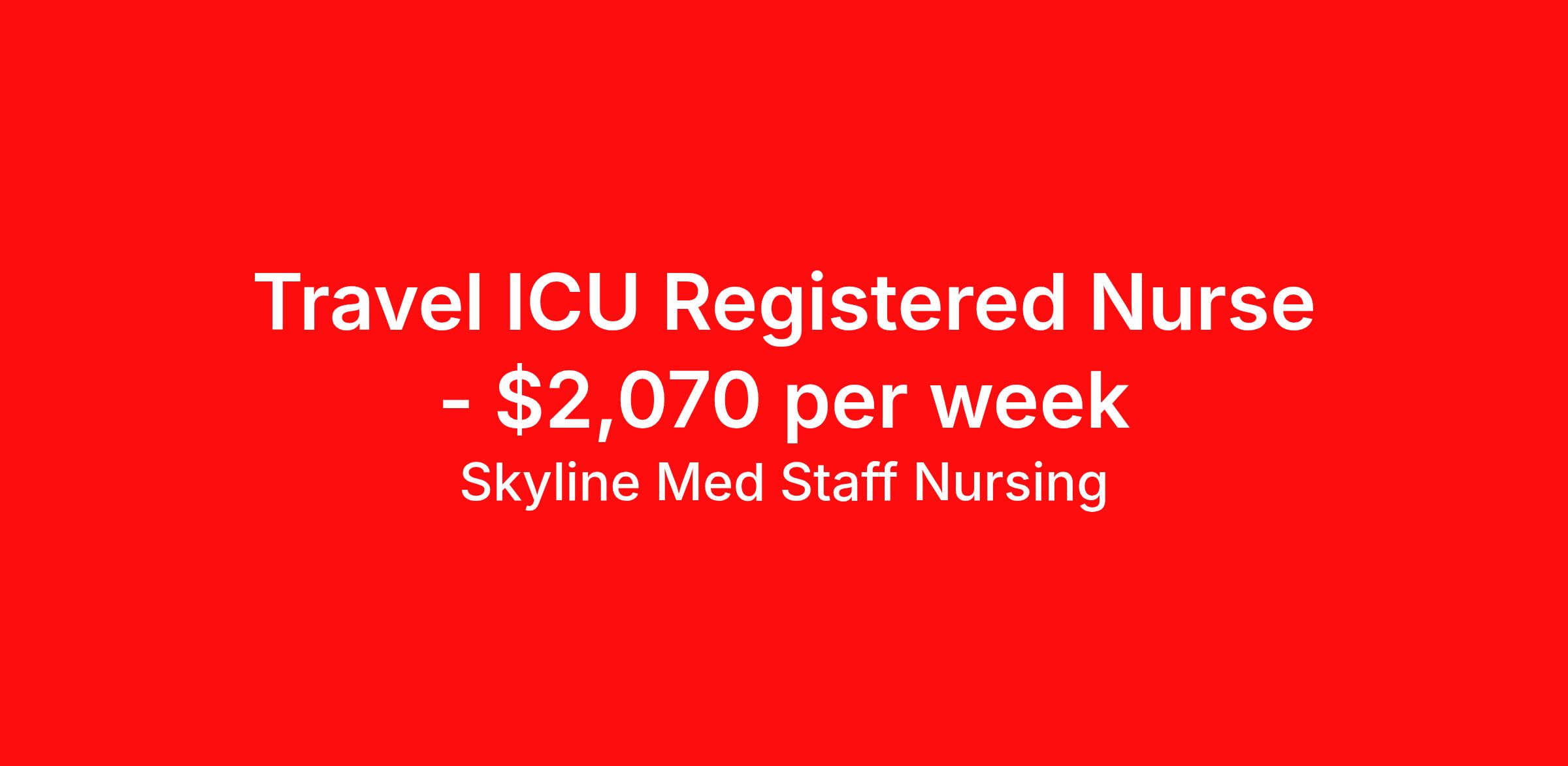 Skyline Med Staff Nursing is seeking a travel nurse RN ICU - Intensive Care Unit for a travel nursing job in Lexington, Kentucky. Job Description & Requirements Specialty: ICU - Intensive Care Unit Discipline: RN Start Date: 04/20/2026 Duration: 13 weeks 36 hours per week Shift: 12 hours, nights Employment Type: Travel Weekly amount stated in job postings is an estimate based on estimated hourly wage and potential stipends available for the location of the assignment. Pay package is calculated on bill rate at the time job was posted, but can change or vary without notice. Exact pay packages might vary as this is an estimate. Our recruiter would be happy to build an exact pay package for you for each job. Skyline Med Staff Nursing Job ID 36119760. Pay package is based on 12 hour shifts and 36.0 hours per week (subject to confirmation) with tax-free stipend amount to be determined. Posted job title: RN:ICU,19:00:00-07:00:00 About Skyline Med Staff Nursing Join the Top- Rated Travel Healthcare Team! Skyline Med Staff was named as the 1 Best Travel Healthcare Company in 2025 by BluePipes, a recognition driven by glowing reviews from travel healthcare professionals. Our recruiters are consistently praised on Google for their responsiveness, dedication, accessibility, and industry knowledge. Ready to experience the difference? Apply for a job today and see why healthcare professionals choose Skyline! Certified Women Owned Business We believe that travel is good for the soul. We want to be on your journey with you and find the right job that fits you Skyline Med Staff is committed to one vision treating others the way that THEY want to be treated. The executive team at Skyline Med Staff focuses on a commitment to quality, consistency, and the highest level of service. Our team members continually strive to build long term relationships that center on you and helping you achieve your goals. Some of the Benefits you will receive with Skyline Med Staff: Over 30 years of combined experience in the staffing industry Higher Take-Home Pay Rates Dedicated Personal Recruiter We are available to you 24/7 Health Insurance Plan Options Tax Free Per Diems, Housing Stipends and Travel Reimbursements Joint Commission Certified Contracts in all 50 states Referral and Loyalty Bonuses Benefits Medical benefits Referral bonus
