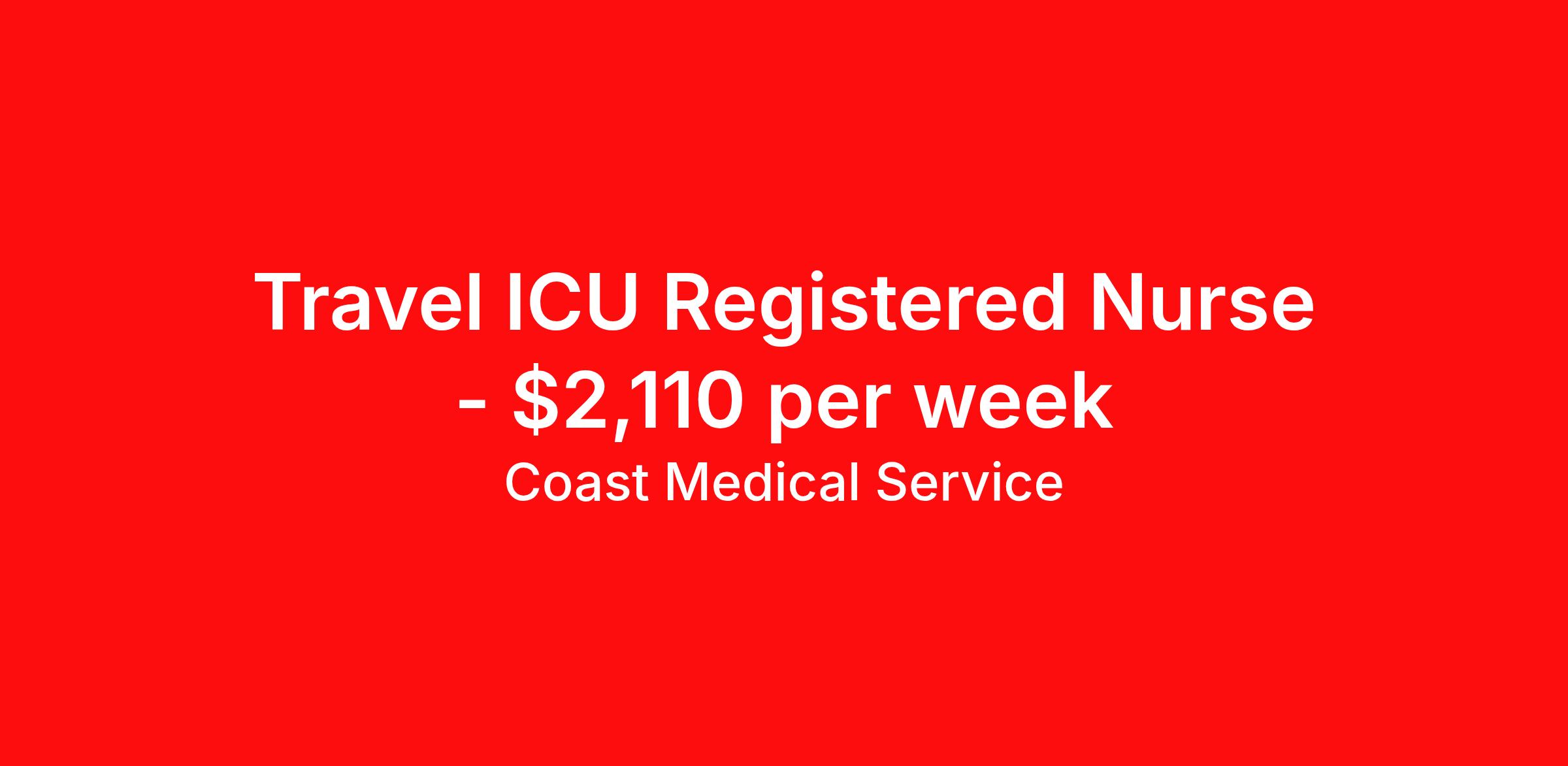 Coast Medical Service is seeking a travel nurse RN ICU - Intensive Care Unit for a travel nursing job in Mattoon, Illinois. Job Description & Requirements Specialty: ICU - Intensive Care Unit Discipline: RN Start Date: 04/06/2026 Duration: 13 weeks 36 hours per week Shift: 12 hours, nights Employment Type: Travel Coast Medical Service is a nationwide travel nursing & allied healthcare staffing agency dedicated to providing an elite traveler experience for the experienced or first-time traveler. Coast is featured on Blue Pipes' 2023 Best Travel Agencies and named a 2022 Top Rated Healthcare Staffing Firm & 2023 First Half Top Rated Healthcare Staffing Firm by Great Recruiters. Please note that pay rate may differ for locally based candidates. Please apply here or contact a recruiter directly to learn more about this position & the facility, and/or explore others that may be of interest to you. We look forward to speaking with you! Coast Medical Services Job ID 36110669. Pay package is based on 12 hour shifts and 36.0 hours per week (subject to confirmation) with tax-free stipend amount to be determined. Posted job title: RN:Intensive Care Unit (ICU),19:00:00-07:30:00
